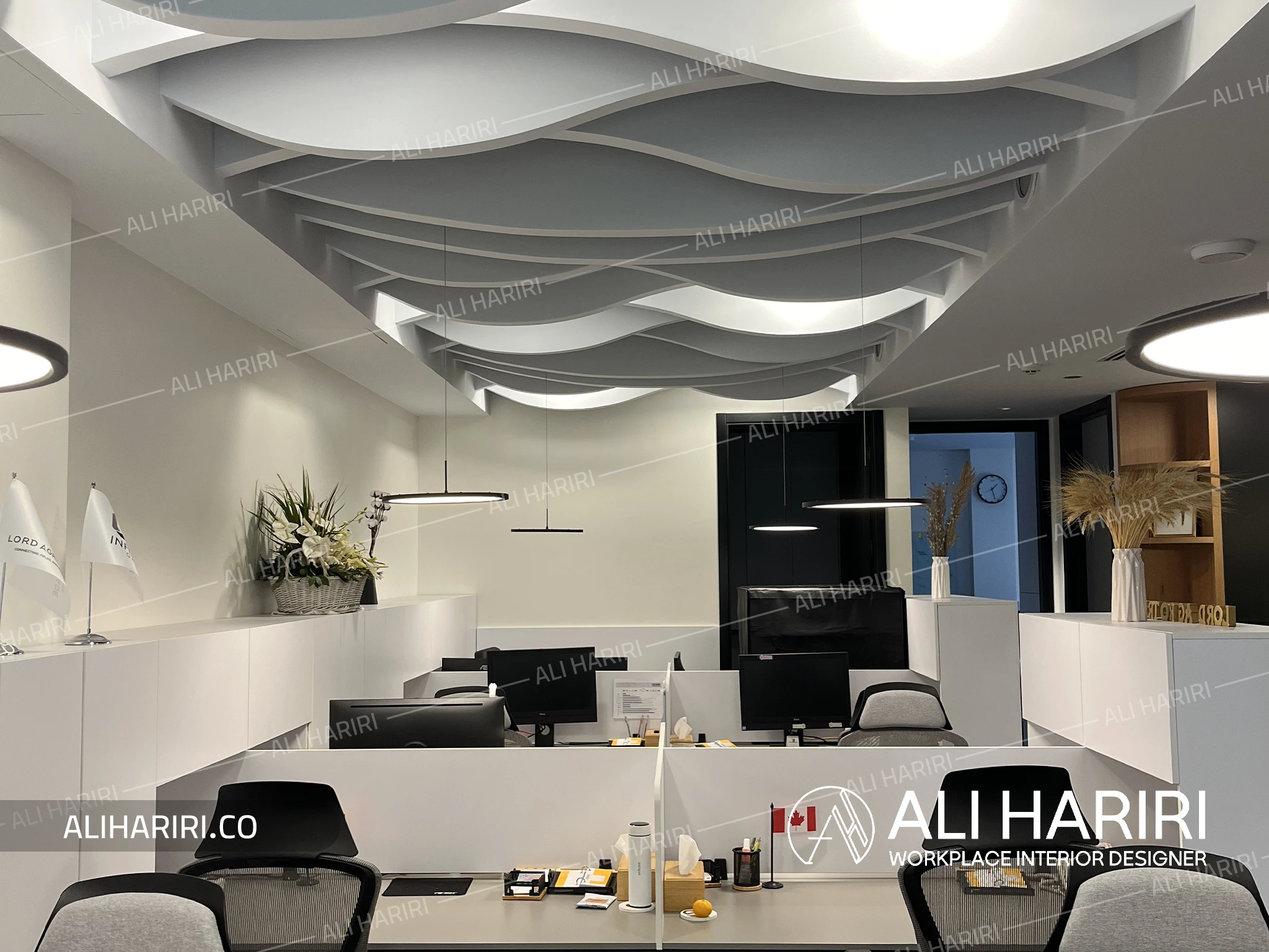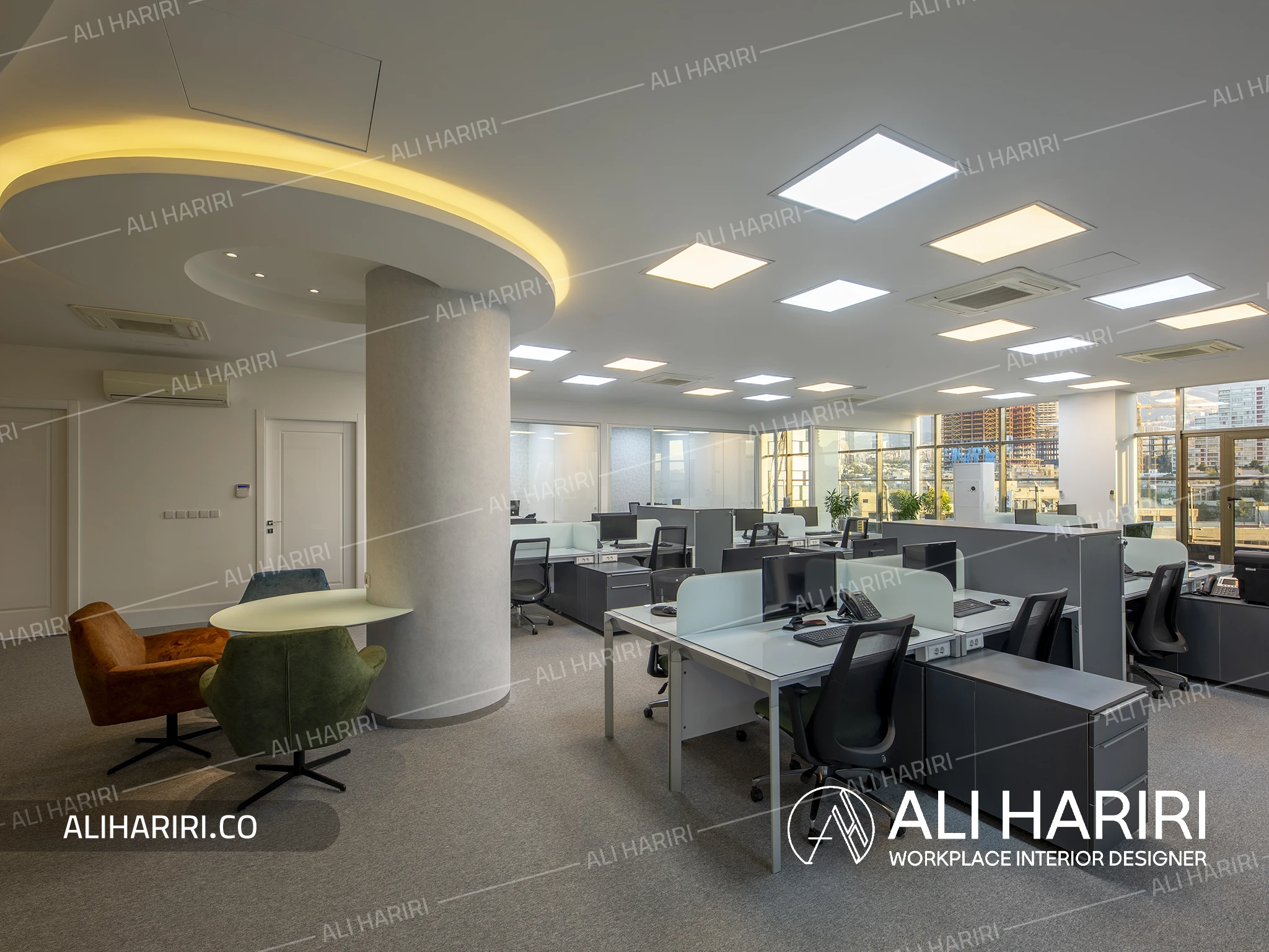 نورپردازی در فضاهای اداری باز بهصورت یکنواخت و استاندارد طراحی میشود تا تمامی ایستگاههای کاری از روشنایی مناسب برخوردار باشند. استفاده همزمان از نور طبیعی و نور مصنوعی، علاوه بر بهبود شرایط کاری، باعث ایجاد محیطی روشن و دلپذیر میشود. طراحی سقف و جانمایی دقیق منابع نوری نیز به نظم بصری فضا کمک کرده و از ایجاد سایههای مزاحم جلوگیری میکند.
