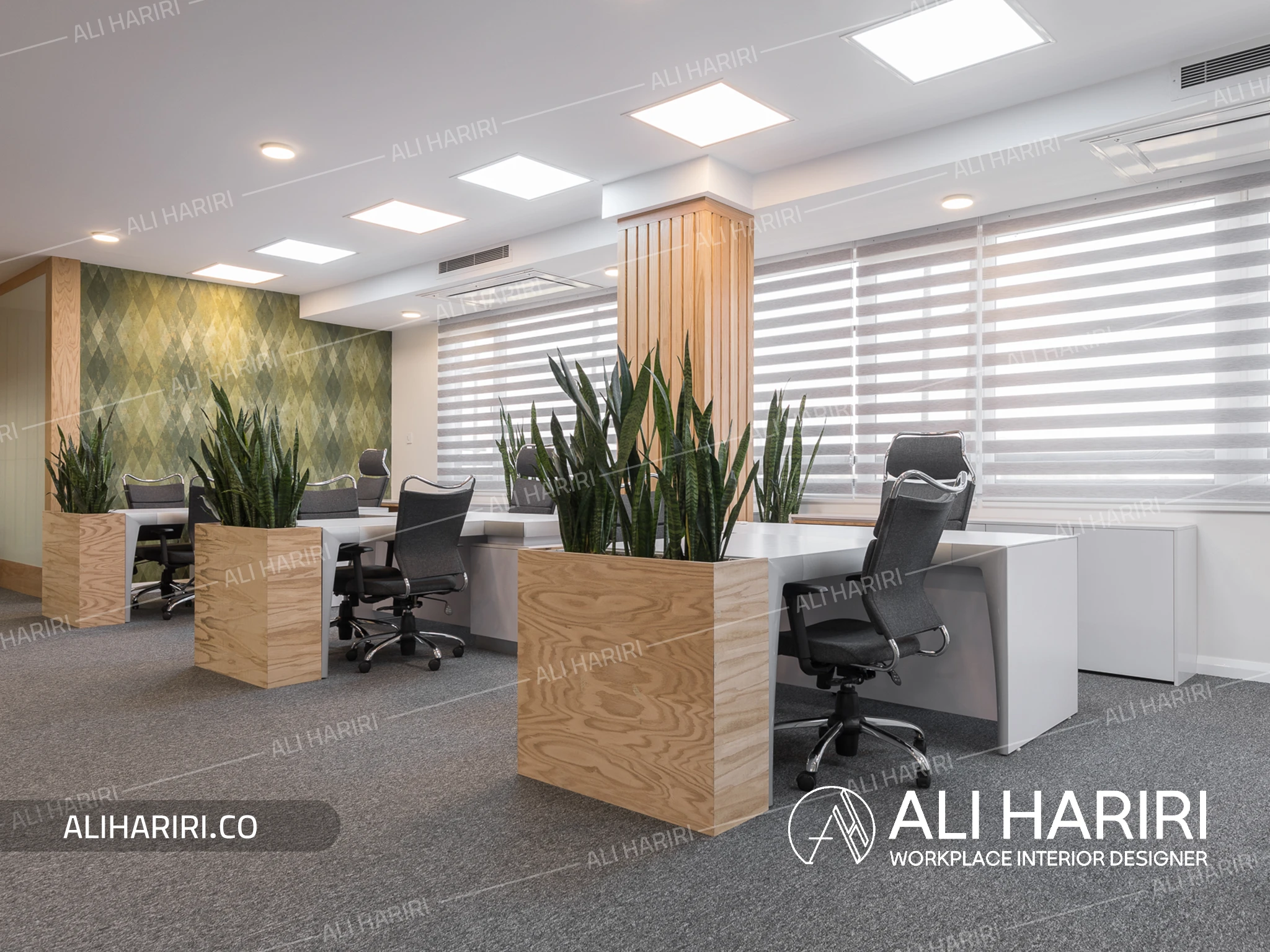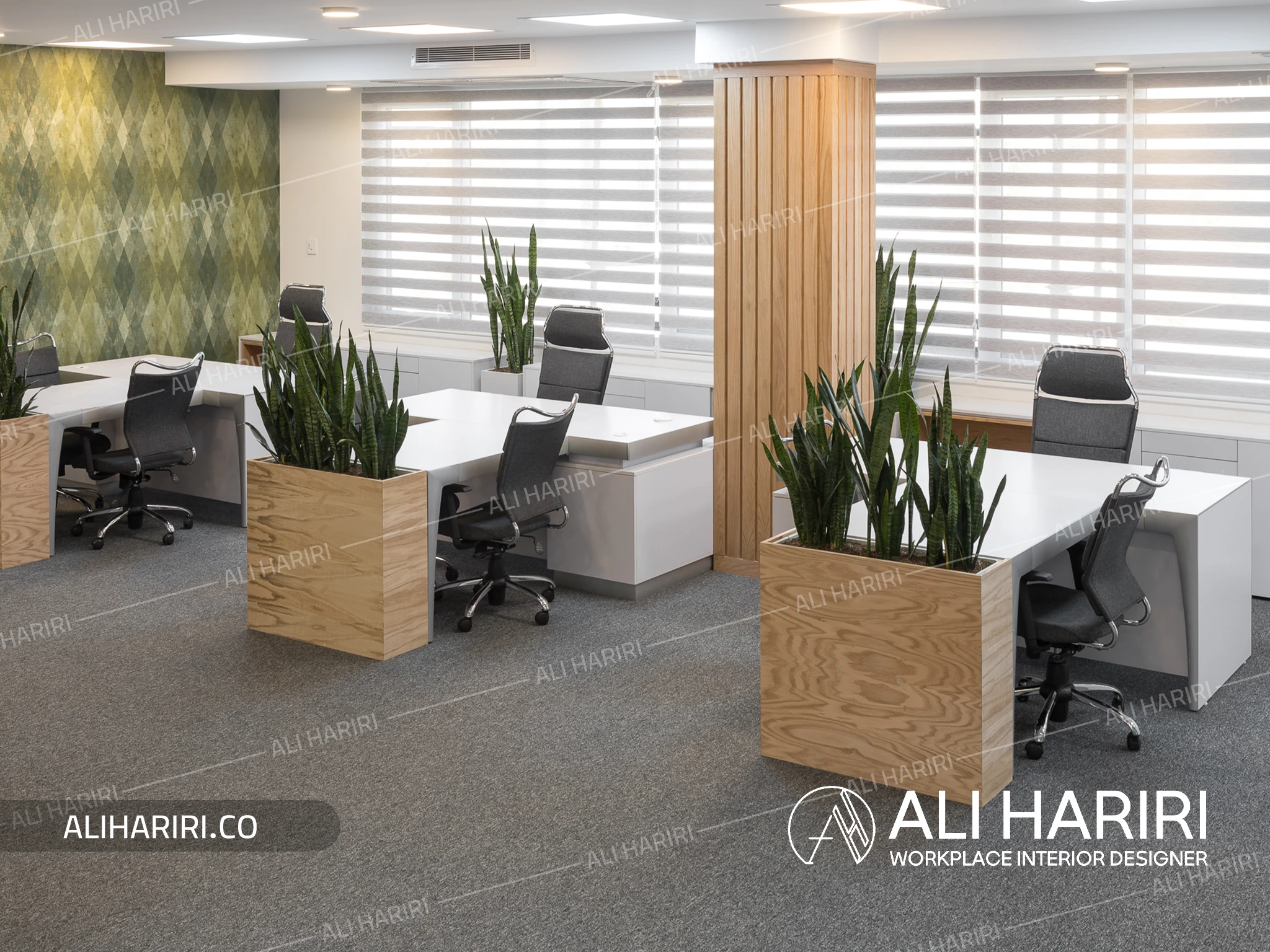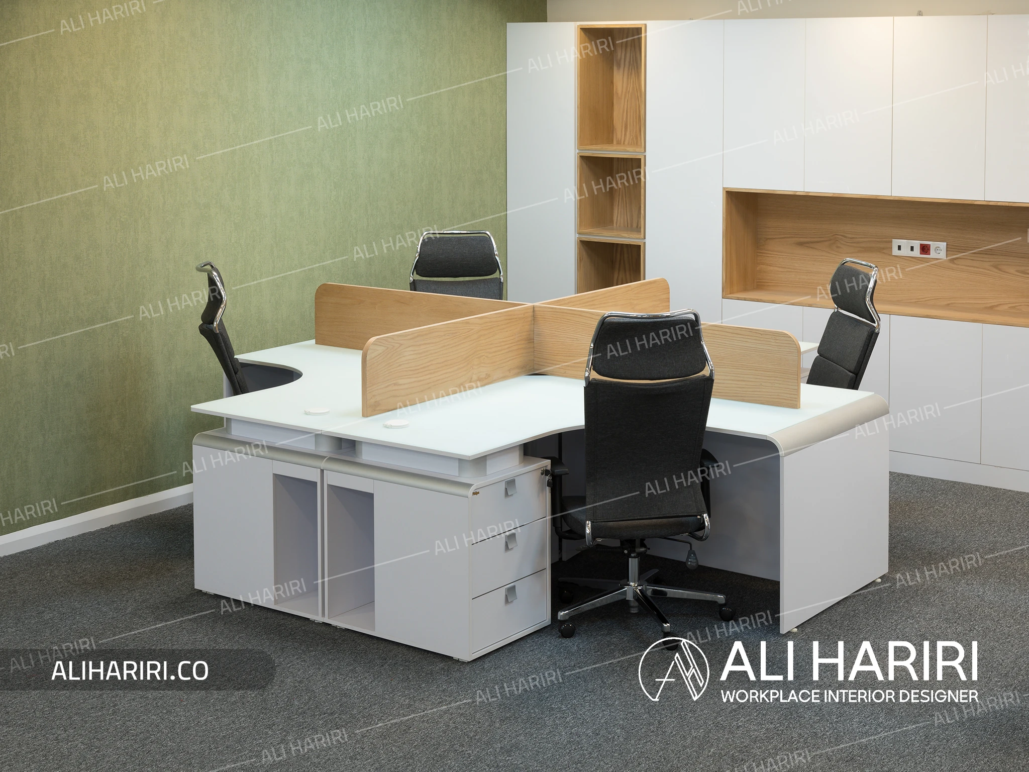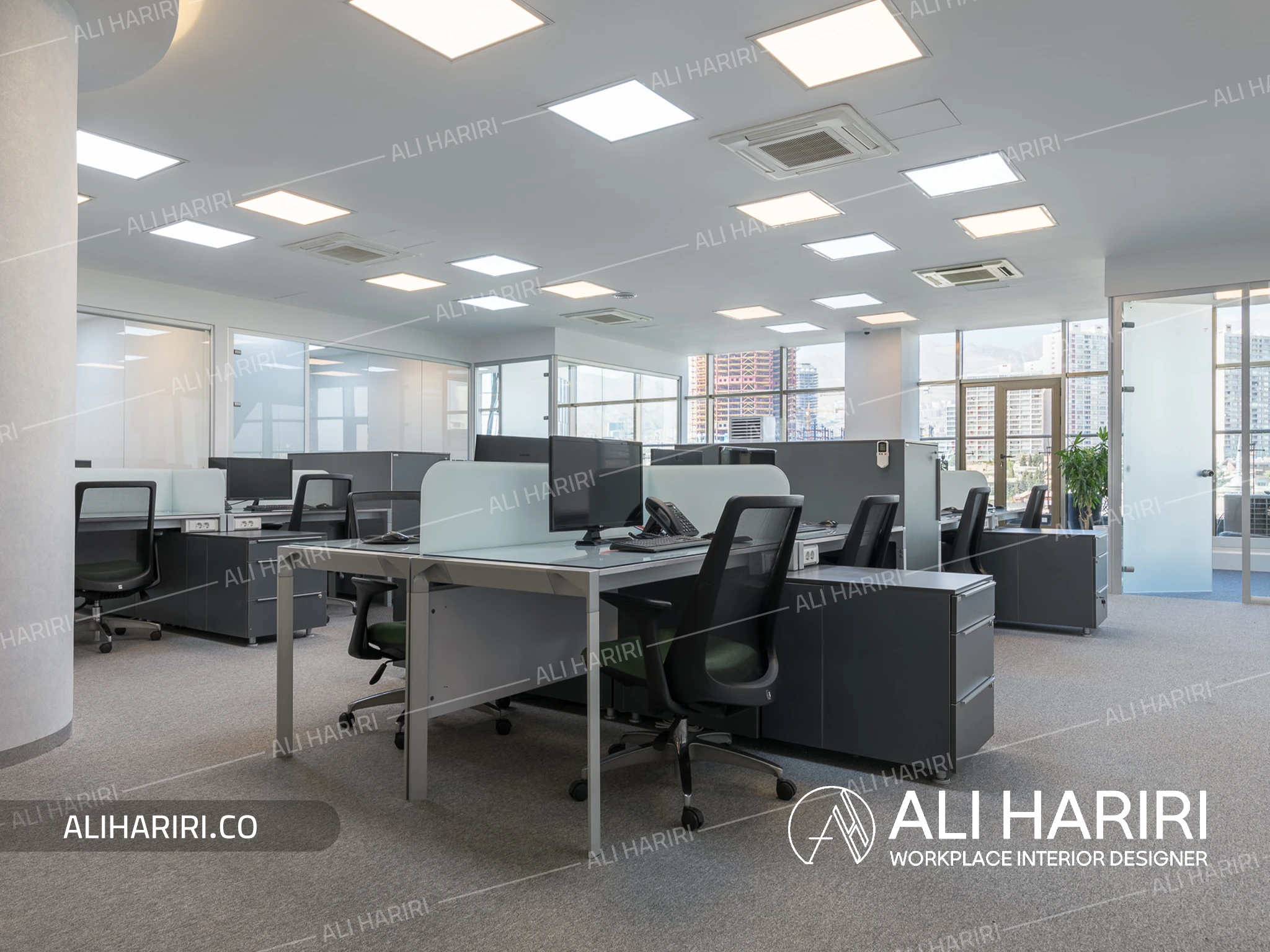 در این نوع فضاها، چیدمان میزهای کار بهگونهای طراحی میشود که ضمن استفاده بهینه از سطح موجود، مسیرهای حرکتی روان و دسترسی آسان میان بخشها فراهم شود. استفاده از میزهای گروهی و ایستگاههای کاری منظم، باعث ایجاد هماهنگی بصری در محیط شده و به افزایش بهرهوری کارکنان کمک میکند. طراحی پارتیشنهای کوتاه یا تقسیمکنندههای سبک نیز به حفظ حریم نسبی افراد بدون از بین رفتن حس ارتباط و یکپارچگی فضا کمک میکند.