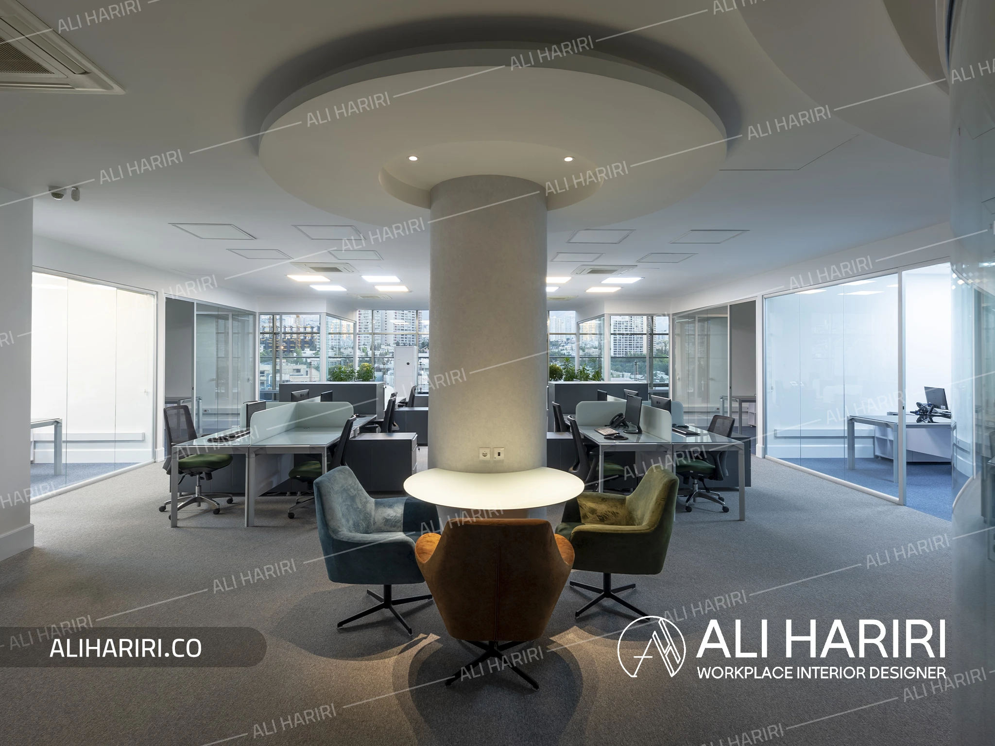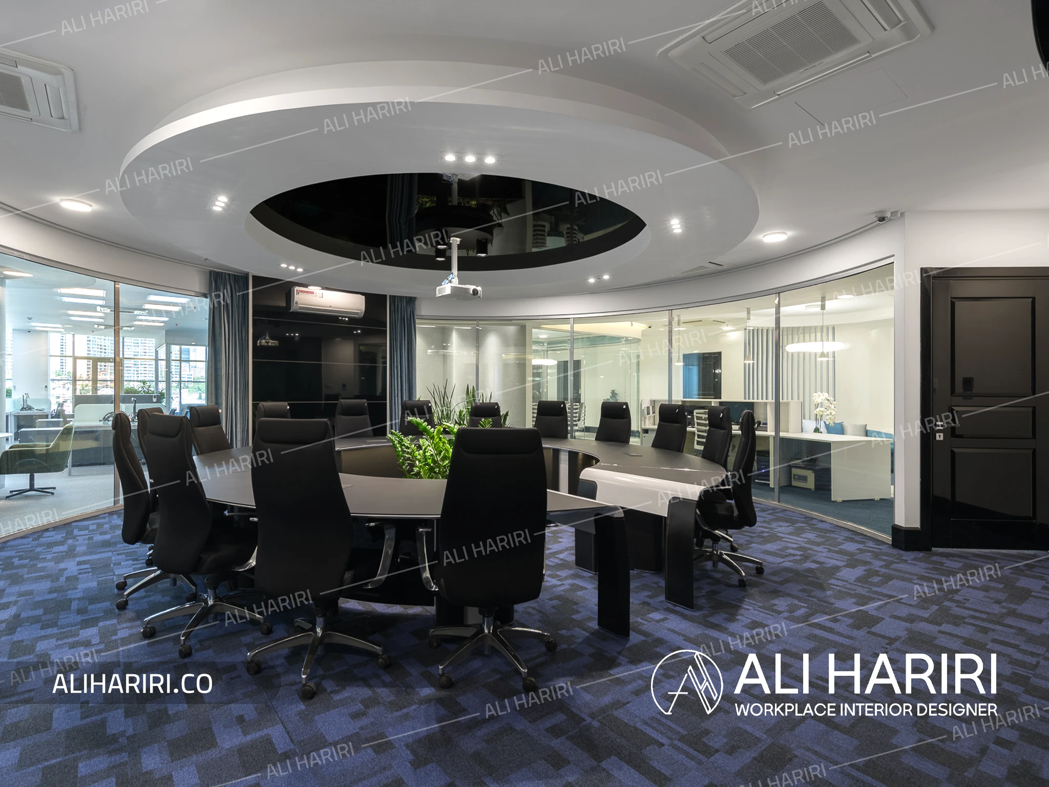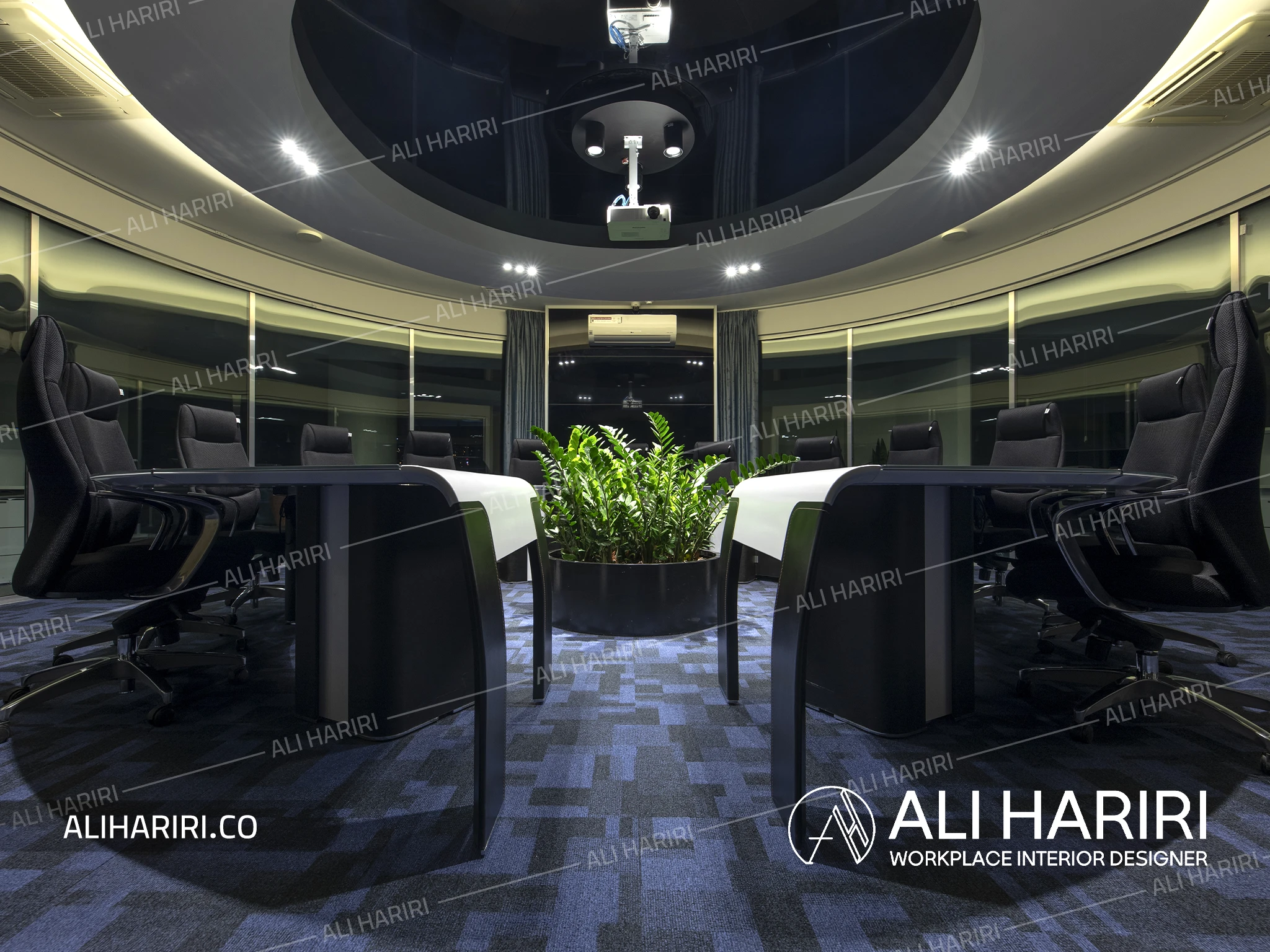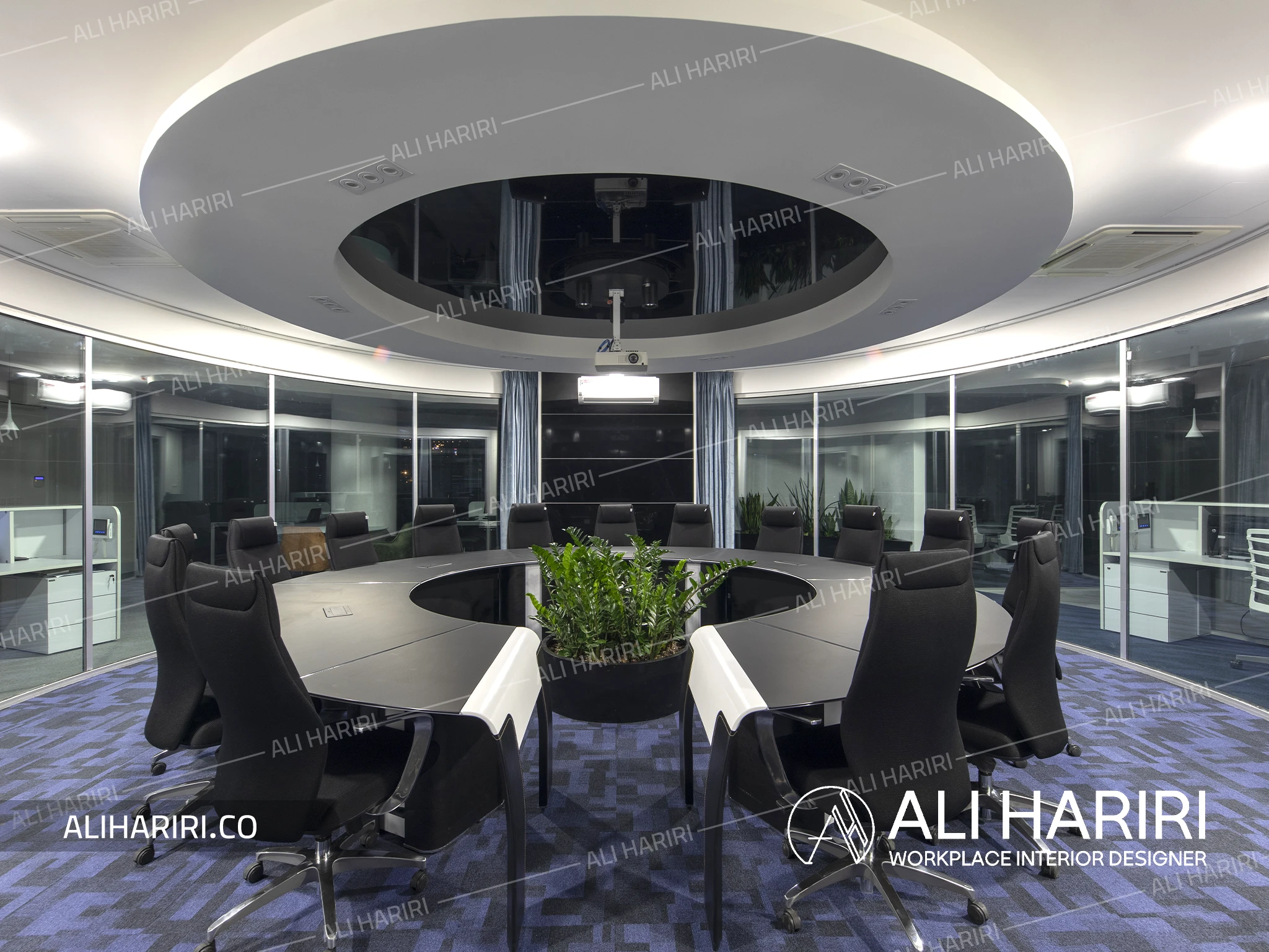 میز کنفرانس با شکل دایره ای طراحی گردید و سقف براق مشکی و لاین نورپردازی کرو و شیشه های سه جداره دور، طرحی کاملا مدرن در مرکز ثقل فضای شرکت ایجاد نمود و در بخش کارمندی، اتاق های شیشه ای کارشناسان و معاونین دور تا دور فضای باز اداری با میزهای کارگروهی ، شفافیت را به حداکثر میزان خود میرساند.