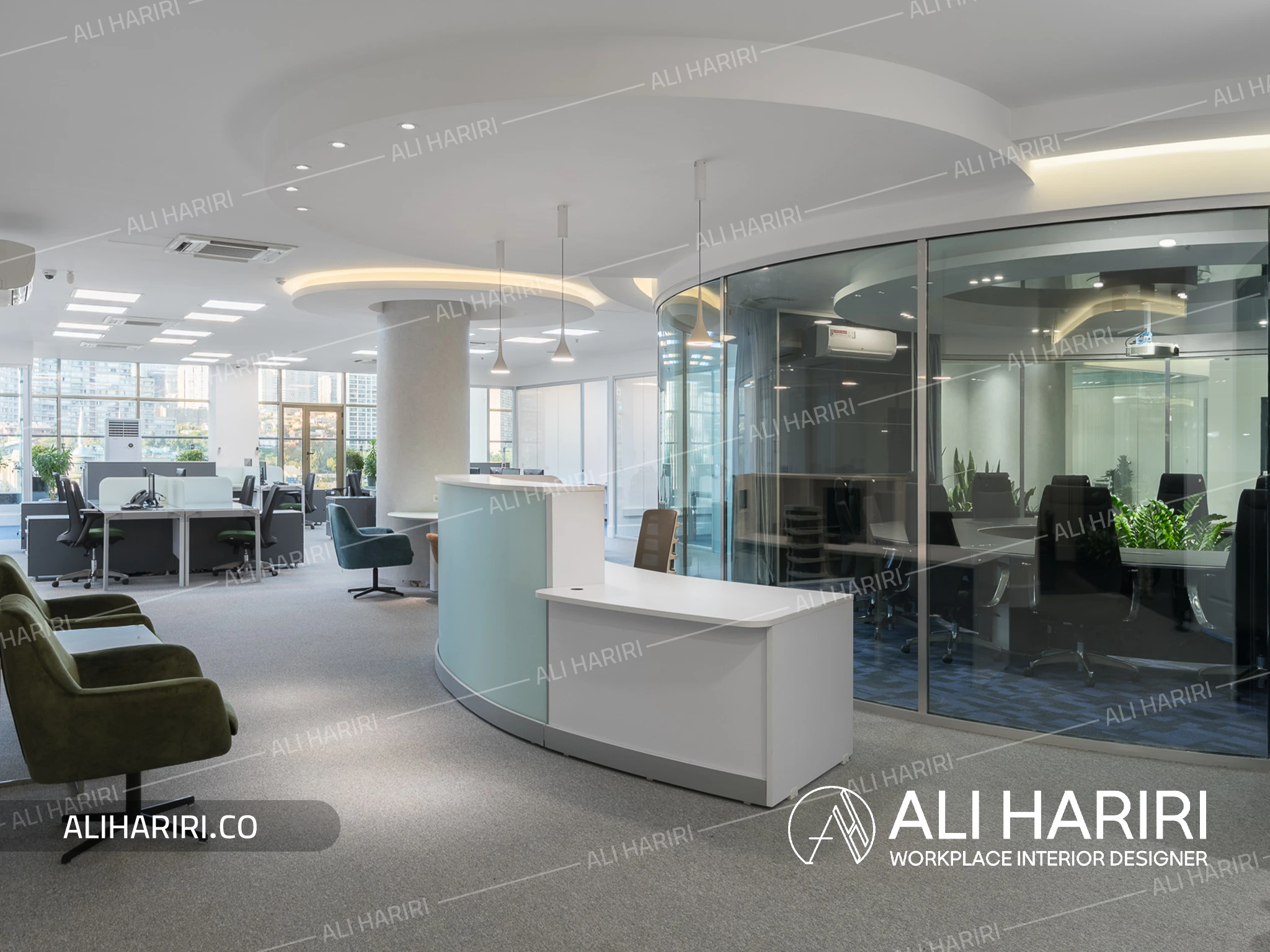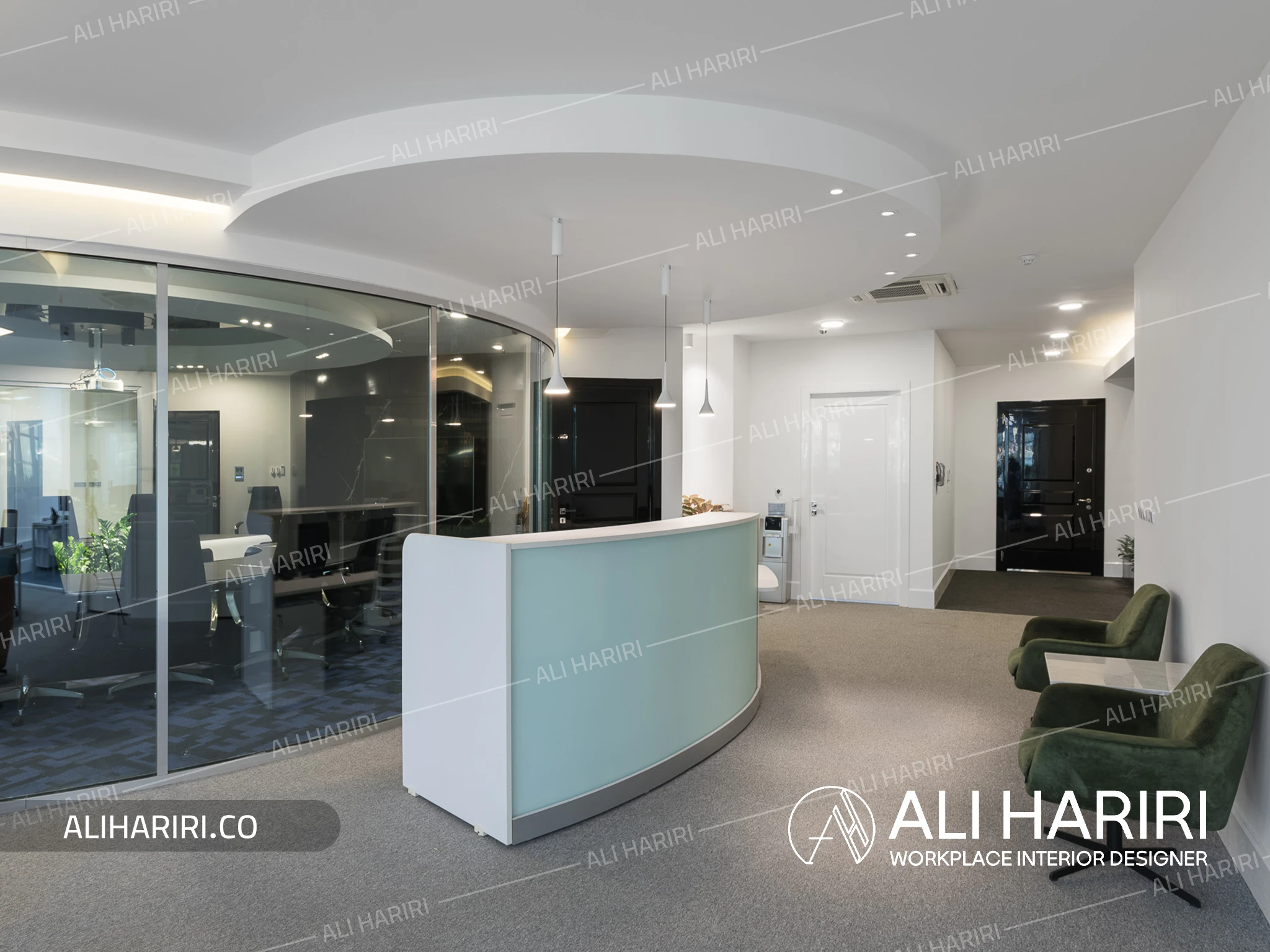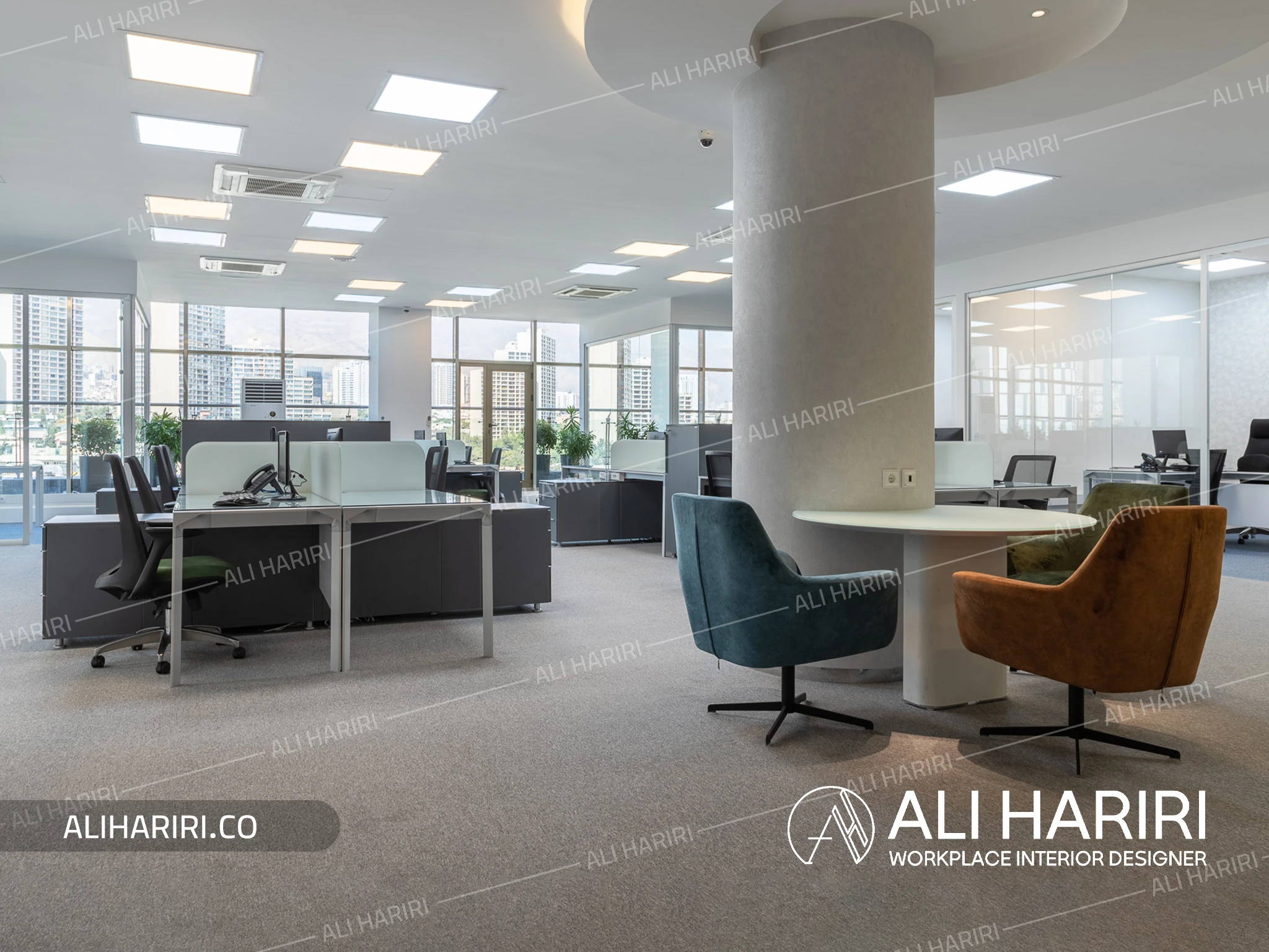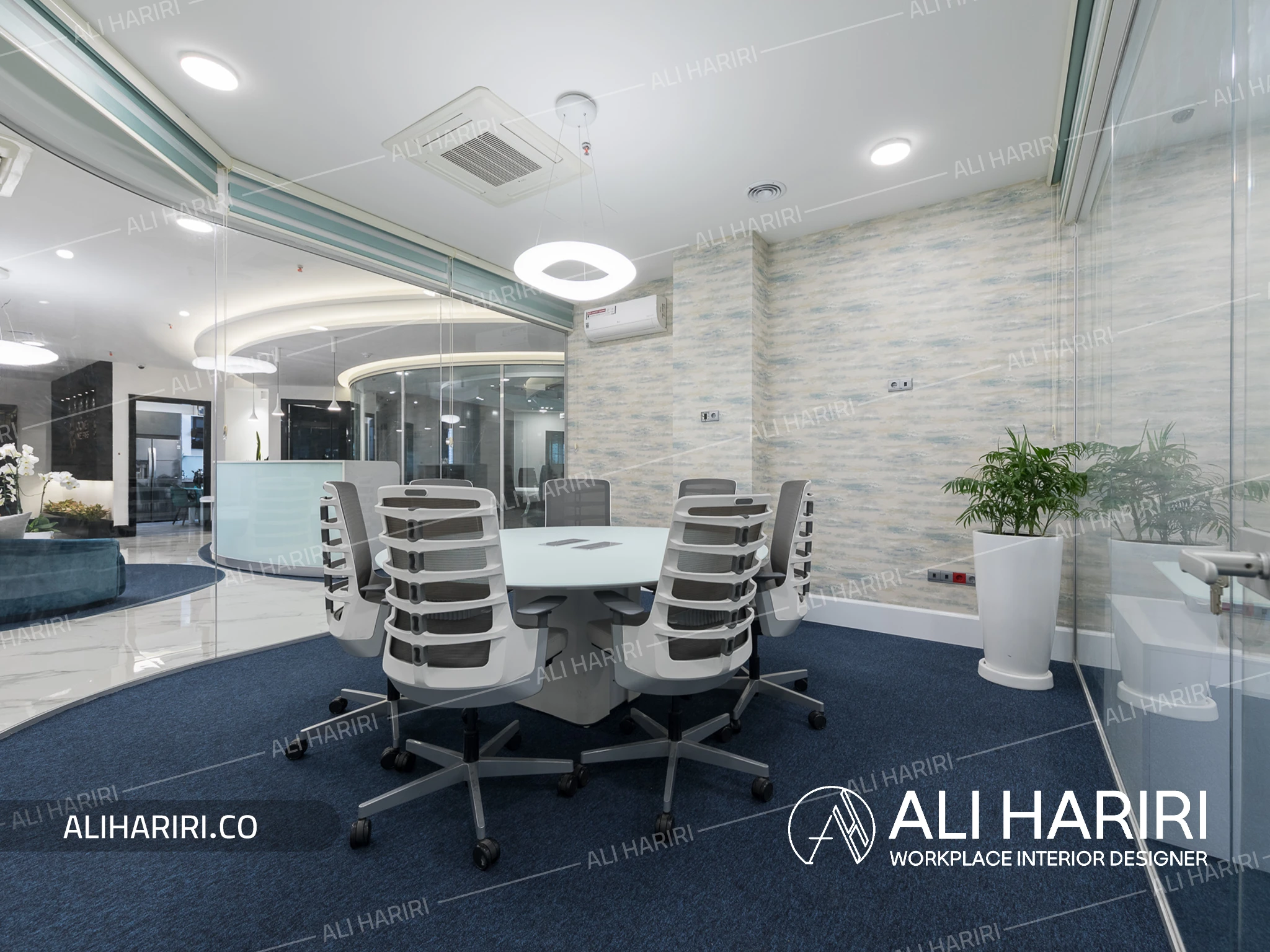 میز کنفرانس با شکل دایره ای طراحی گردید و سقف براق مشکی و لاین نورپردازی کرو و شیشه های سه جداره دور، طرحی کاملا مدرن در مرکز ثقل فضای شرکت ایجاد نمود و در بخش کارمندی، اتاق های شیشه ای کارشناسان و معاونین دور تا دور فضای باز اداری با میزهای کارگروهی ، شفافیت را به حداکثر میزان خود میرساند.