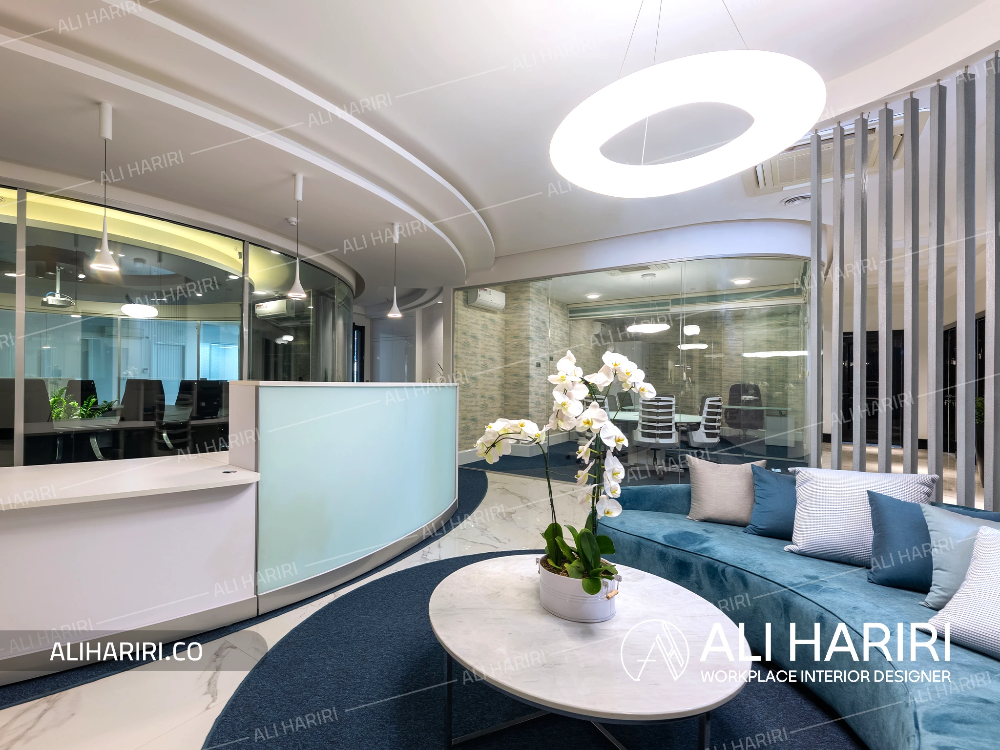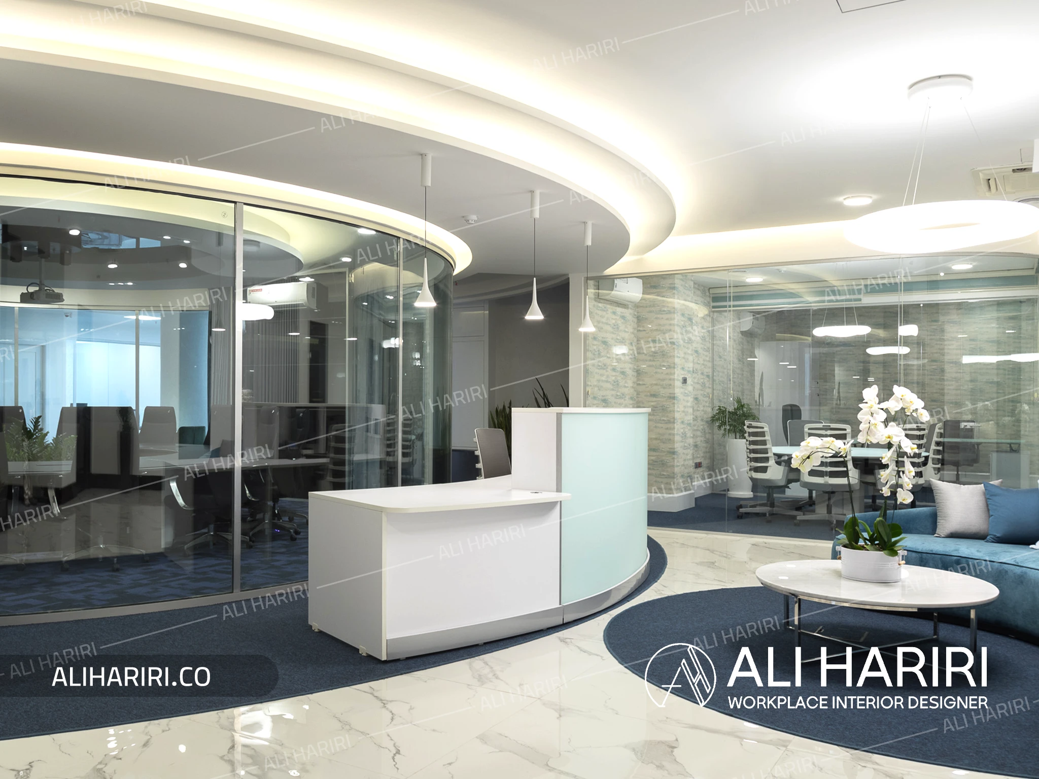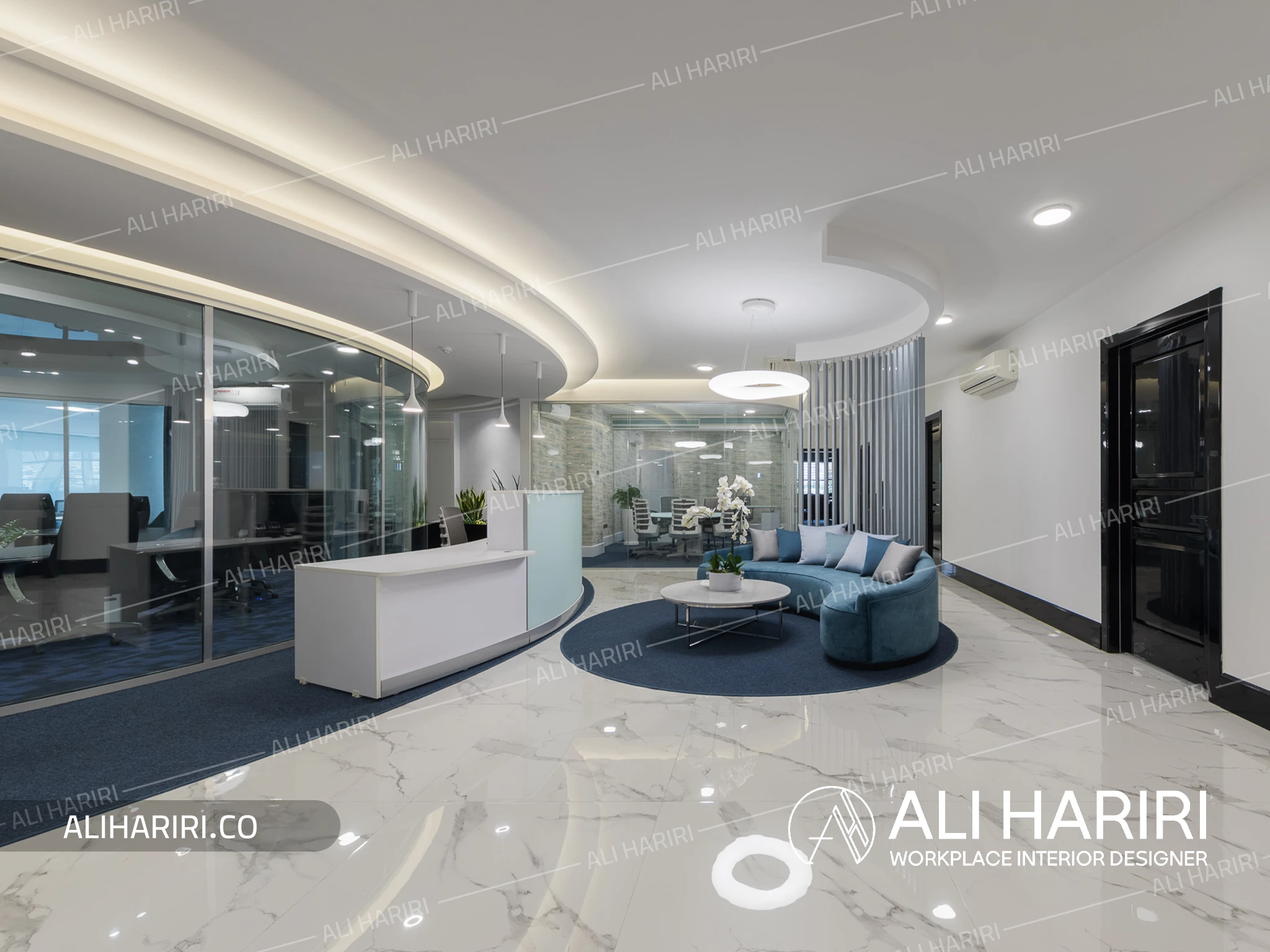 لابی بزرگ با مبلمان و دکور چوبی خاص و نورپردازی کرو پیرامون اتاق کنفرانس به همراه سنگ سفید و موکت آبی در ورودی بخش مدیریت ، اعتبار سازمانی مجموعه را به شکلی مدرن و ماندگار بازتاب می دهد.