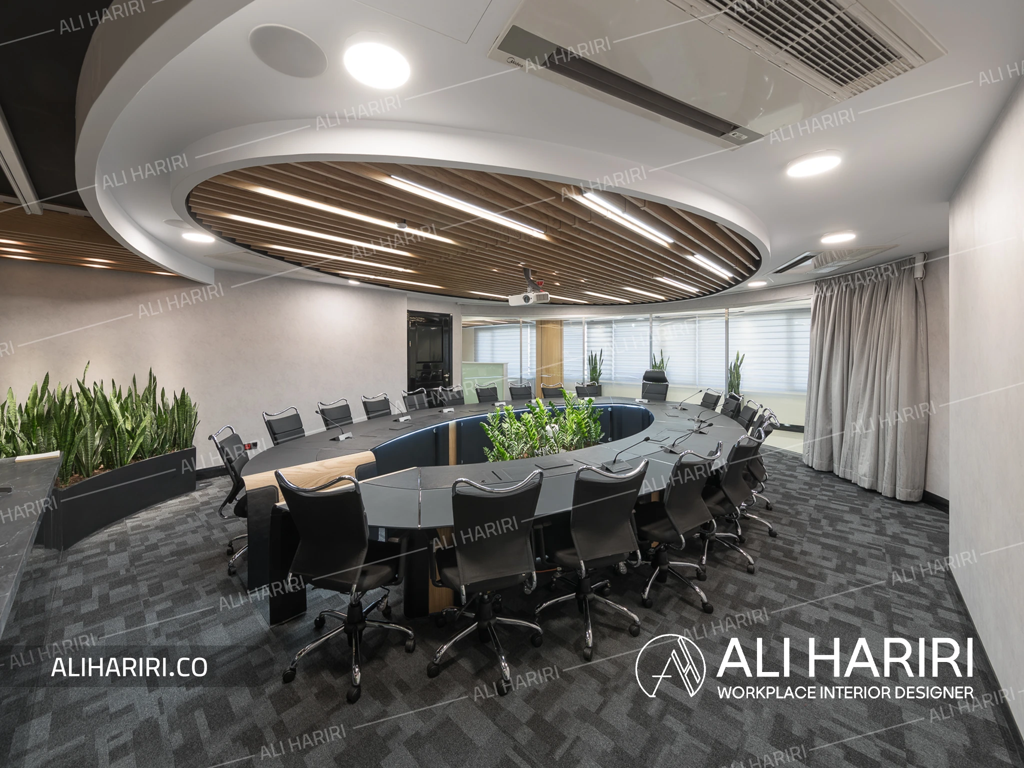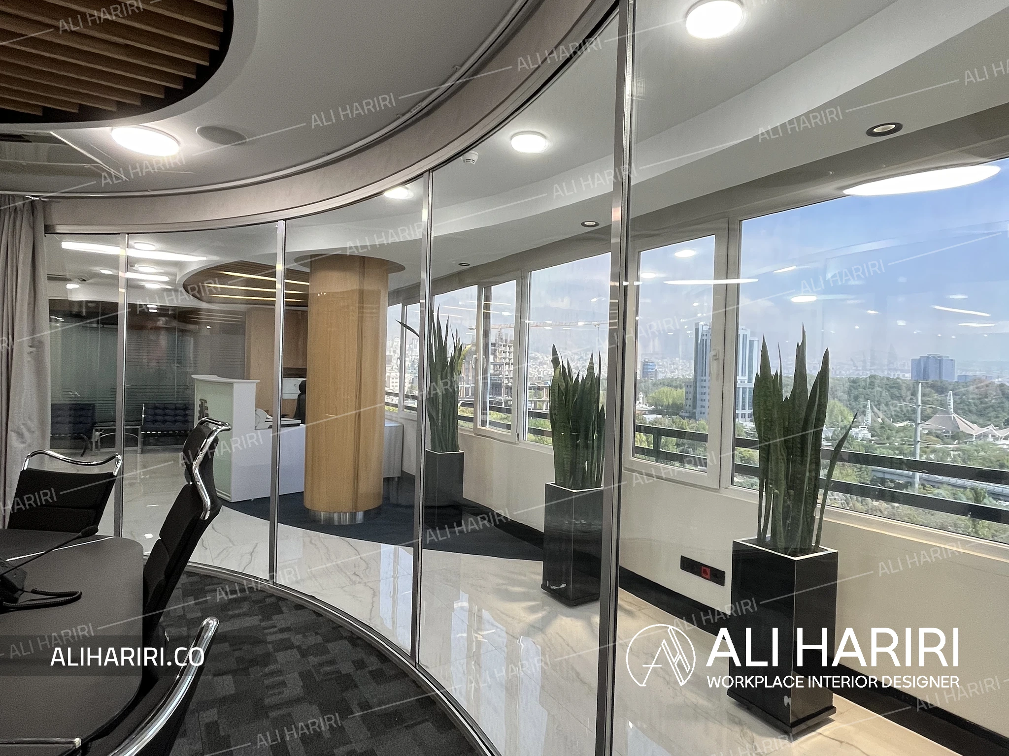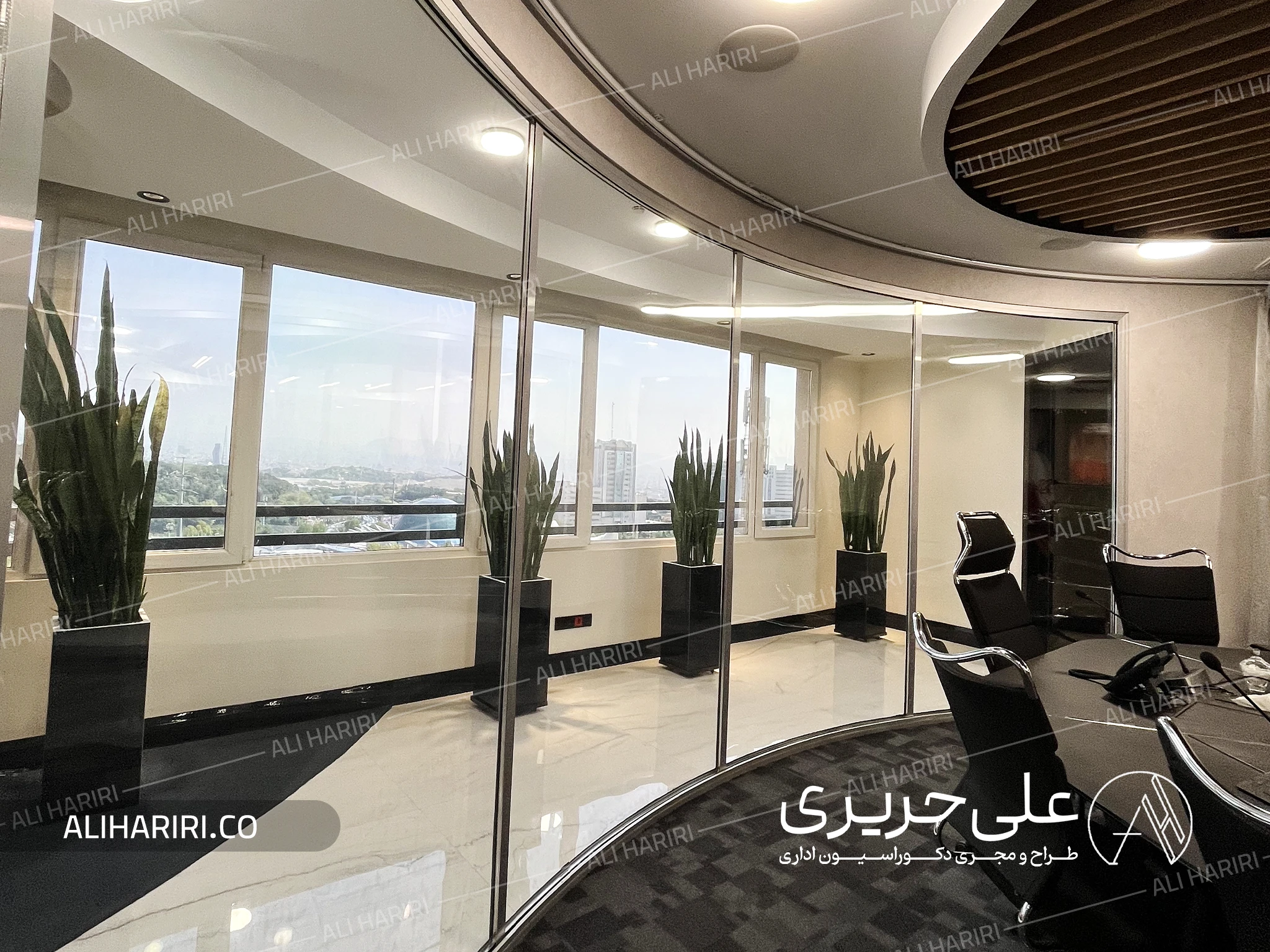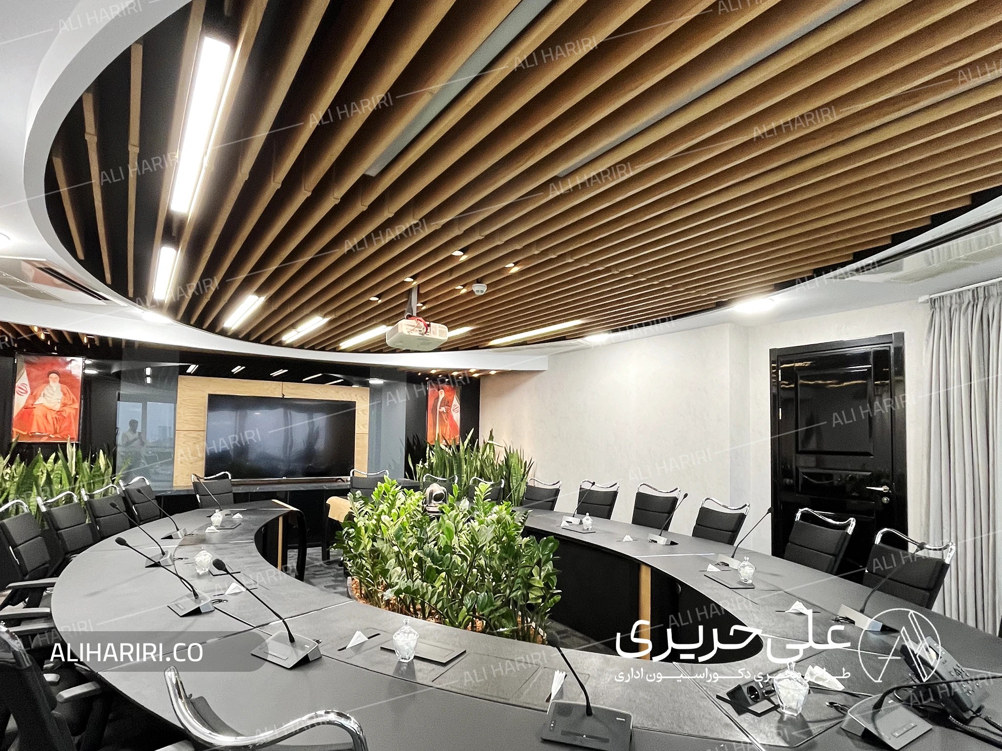 از سوی دیگر، اتاق جلسات اصلی با میز کنفرانسی منحنیشکل، نورپردازی خطی، سقف اسلیتی و حضور سبزینگی در مرکز، به فضایی تبدیل شده که علاوه بر قدرت بصری، آرامش و تمرکز را برای تصمیمگیریهای مهم فراهم میکند. پانلهای شیشهای قوسی، مرز میان فضاها بیرون ساختمان و اتاق کنفرانس را بدون قطع جریان نور از بین میبرند و پیوستگی فضایی چشمنوازی ایجاد میکنند و در عین حال دکوراسیون اتاق کنفرانس را به بخشی از دکراسیون لابی تبدیل می نماید.