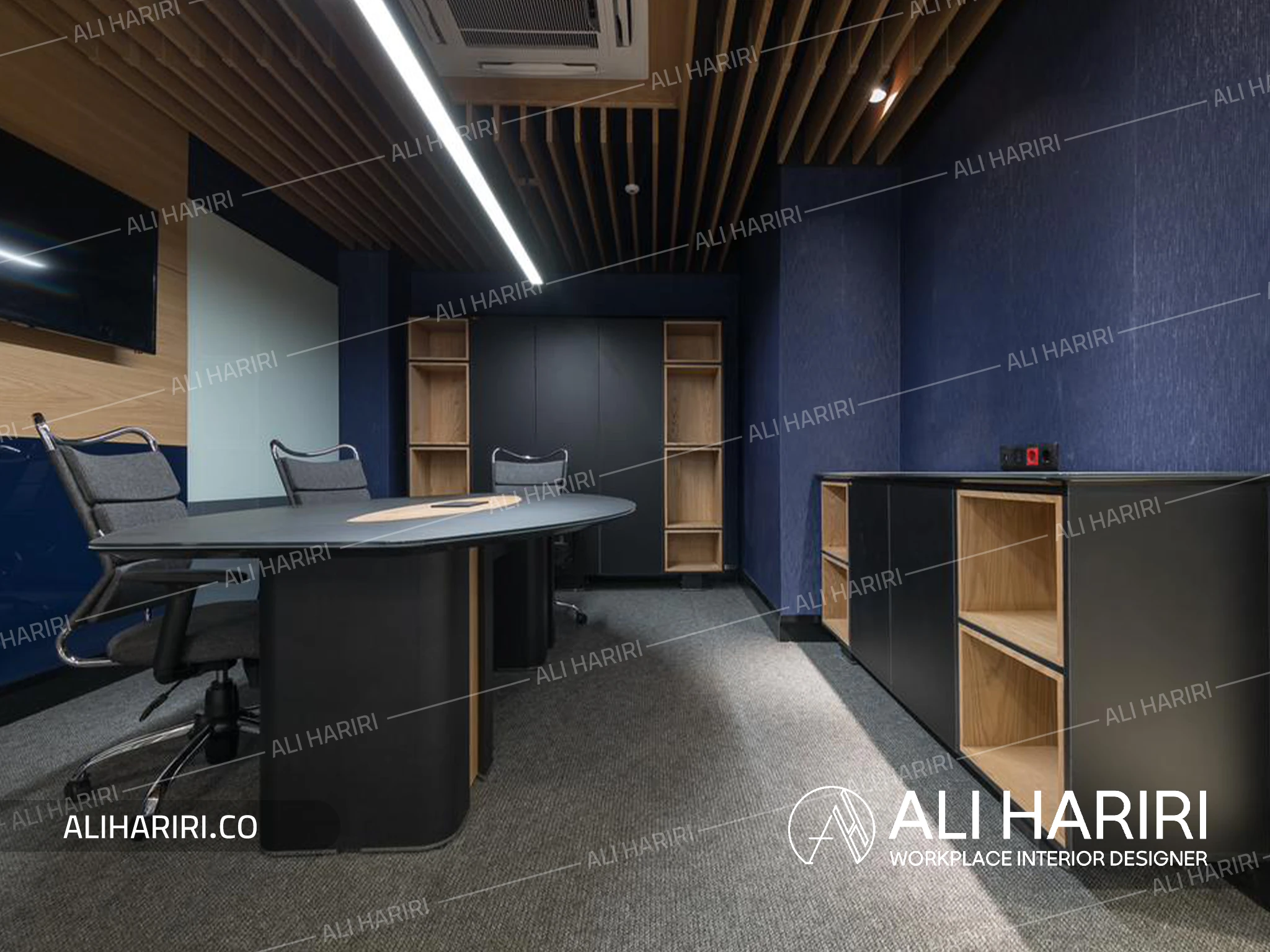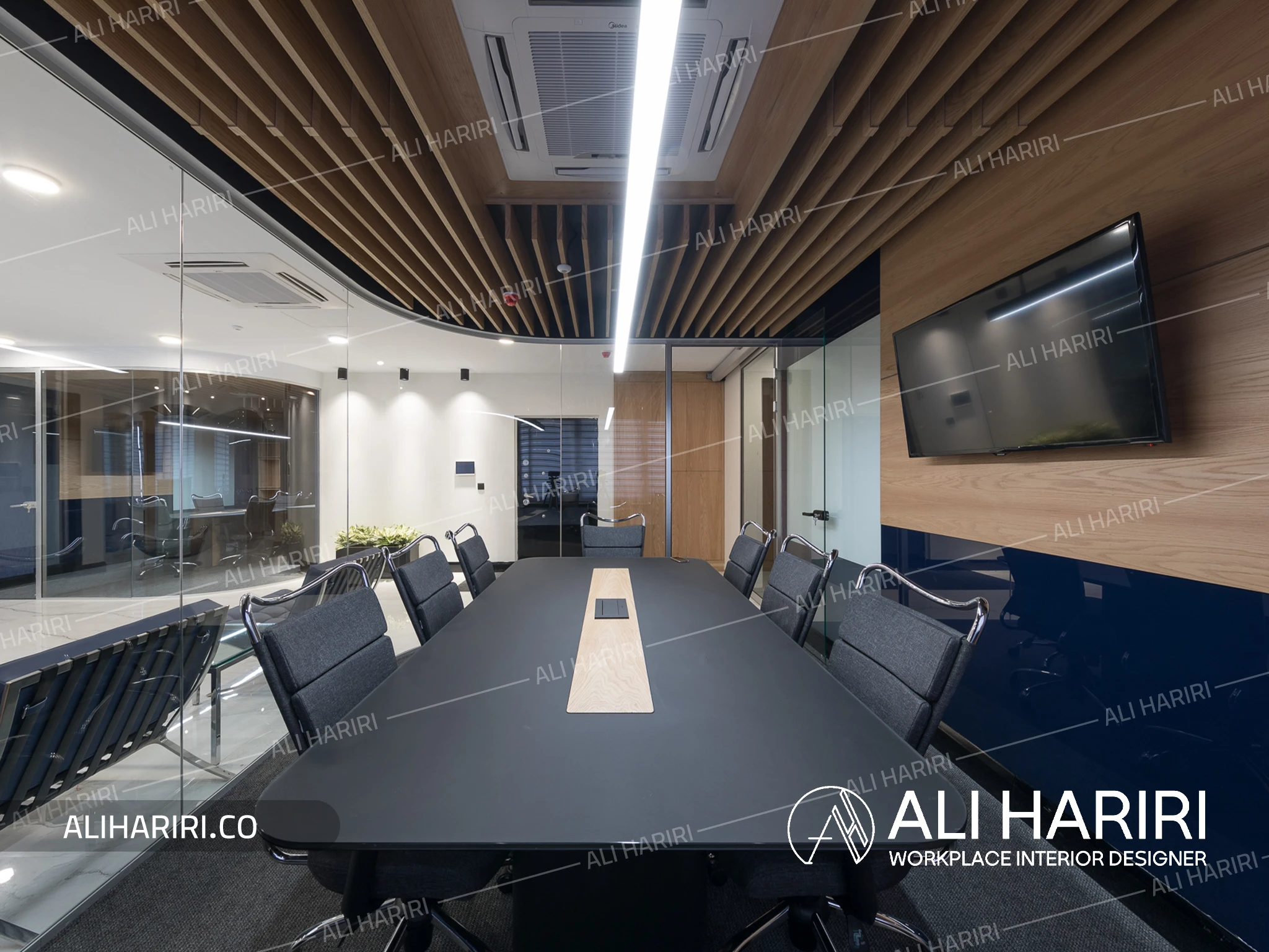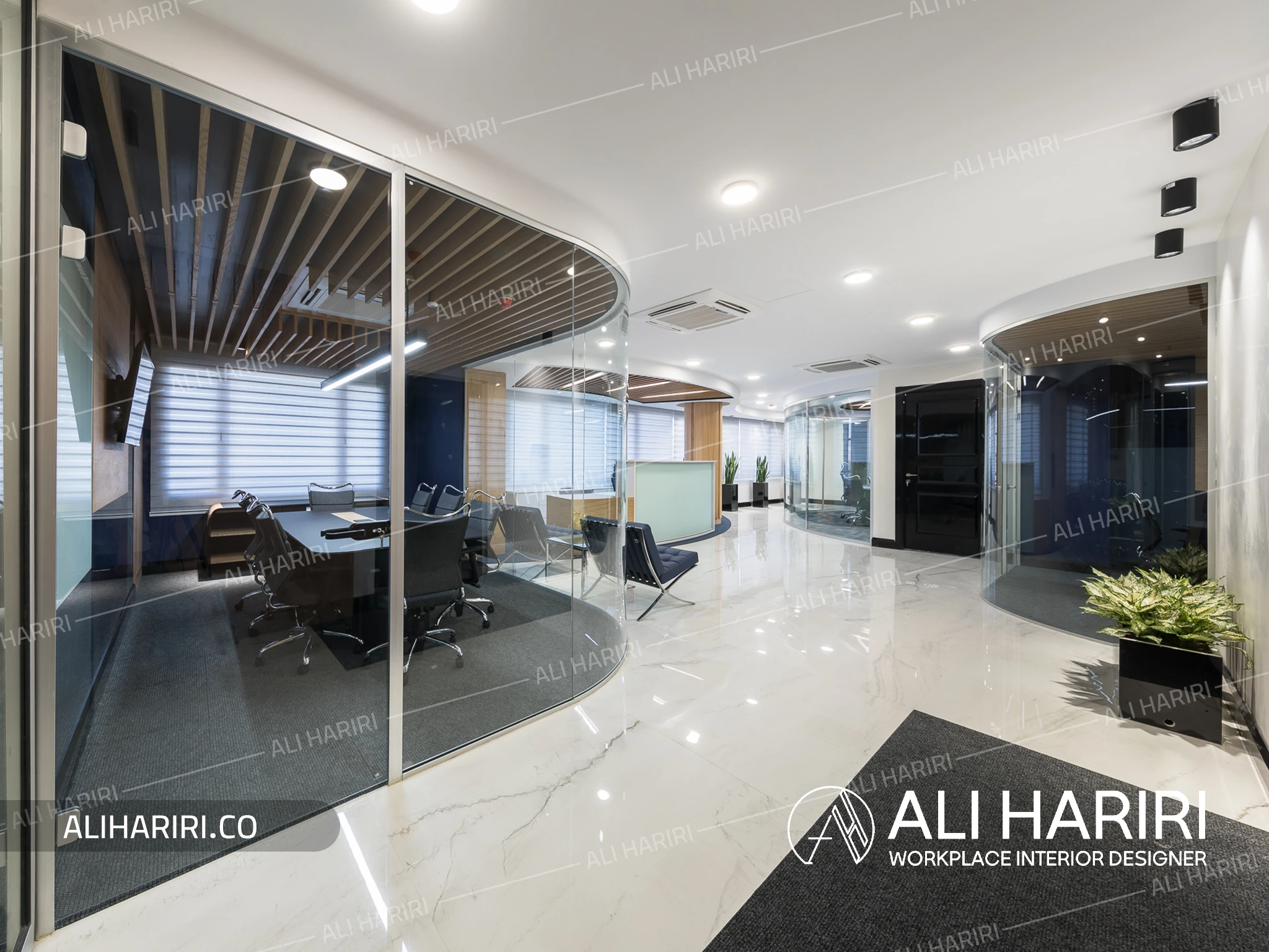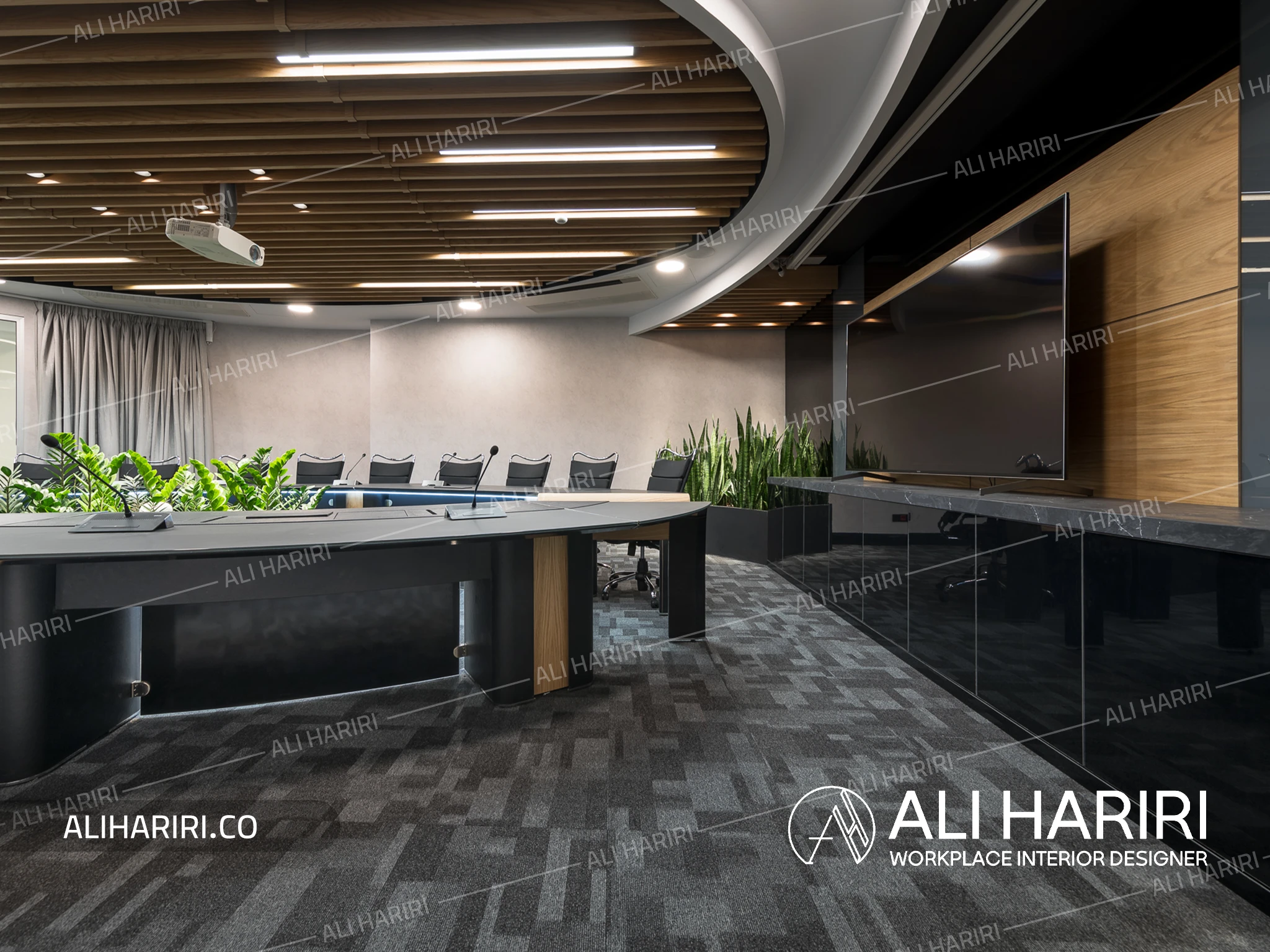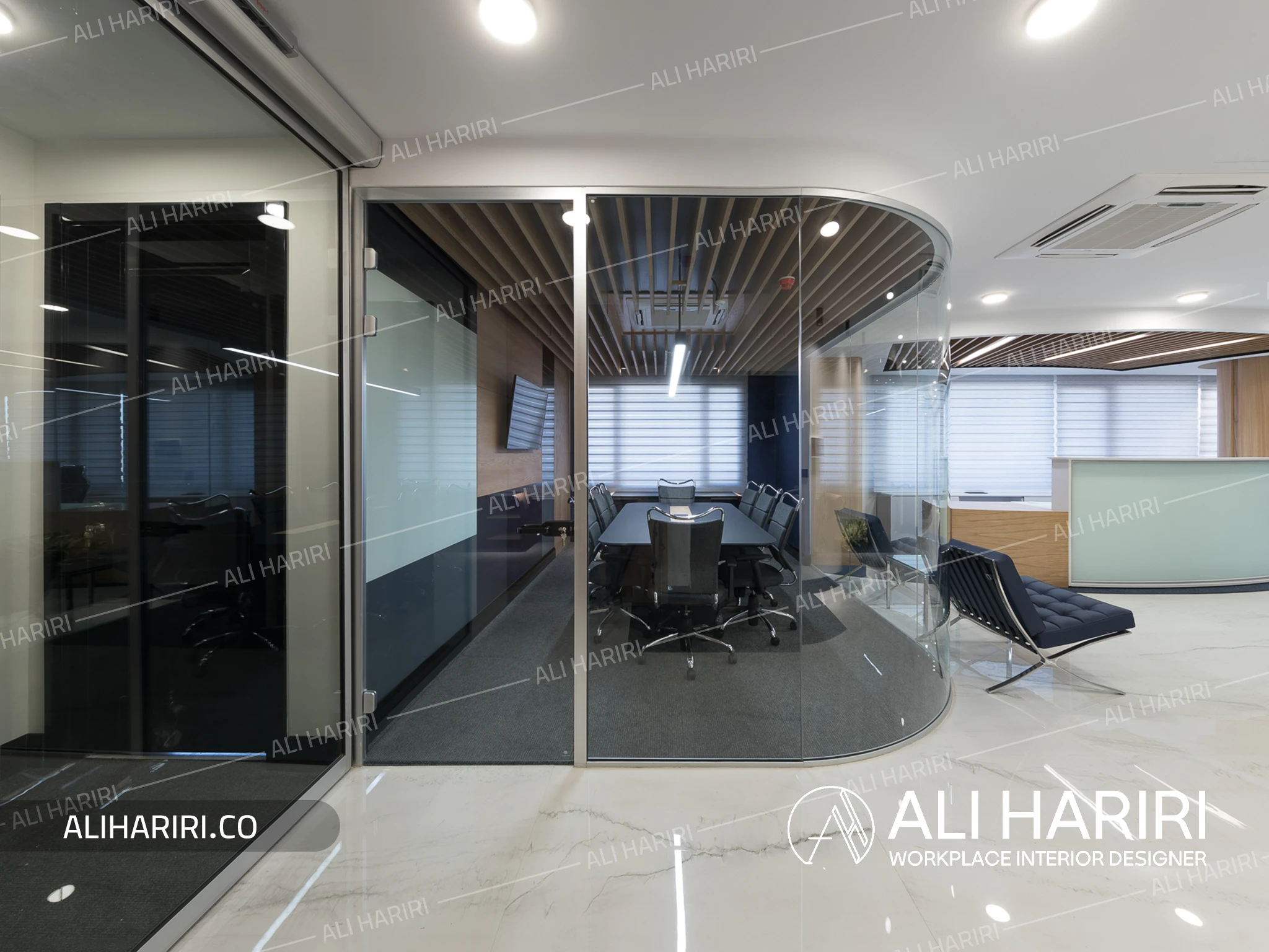 از سوی دیگر، اتاق جلسات اصلی با میز کنفرانسی منحنیشکل، نورپردازی خطی، سقف اسلیتی و حضور سبزینگی در مرکز، به فضایی تبدیل شده که علاوه بر قدرت بصری، آرامش و تمرکز را برای تصمیمگیریهای مهم فراهم میکند. پانلهای شیشهای قوسی، مرز میان فضاها بیرون ساختمان و اتاق کنفرانس را بدون قطع جریان نور از بین میبرند و پیوستگی فضایی چشمنوازی ایجاد میکنند و در عین حال دکوراسیون اتاق کنفرانس را به بخشی از دکراسیون لابی تبدیل می نماید.