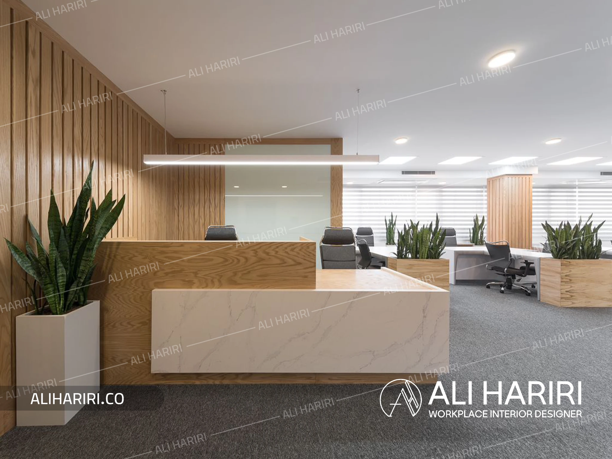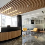 بخش ورودی و لابی با استفاده از ستونهای چوبی، سقفهای اسلیتی با ریتم منظم، و کفپوش سنگی براق، هویتی لوکس و مدیریتی پیدا کرده است. بازی میان چوب و سنگ، تضادی کنترلشده میسازد که هم حس استحکام را منتقل میکند و هم گرمایش لازم برای یک فضای اداری سطحبالا را به همراه دارد. کانتر پذیرش با انحنای نرم خود، اولین نشانه از زبان طراحی پویا و یکپارچهی پروژه است.