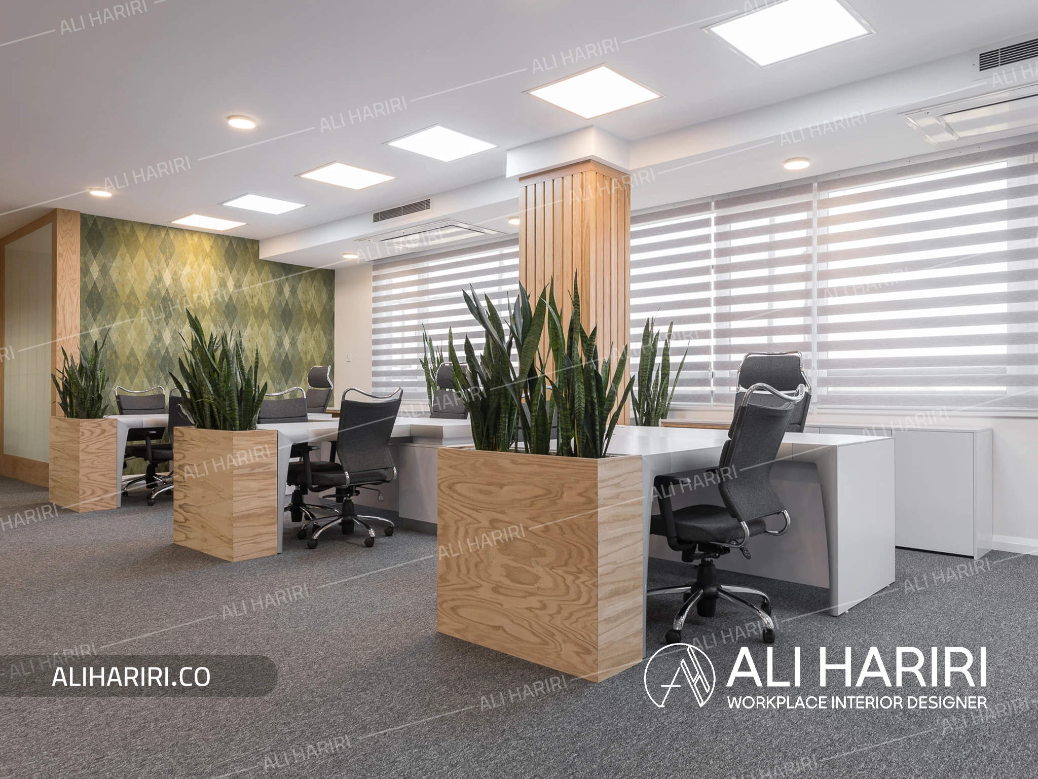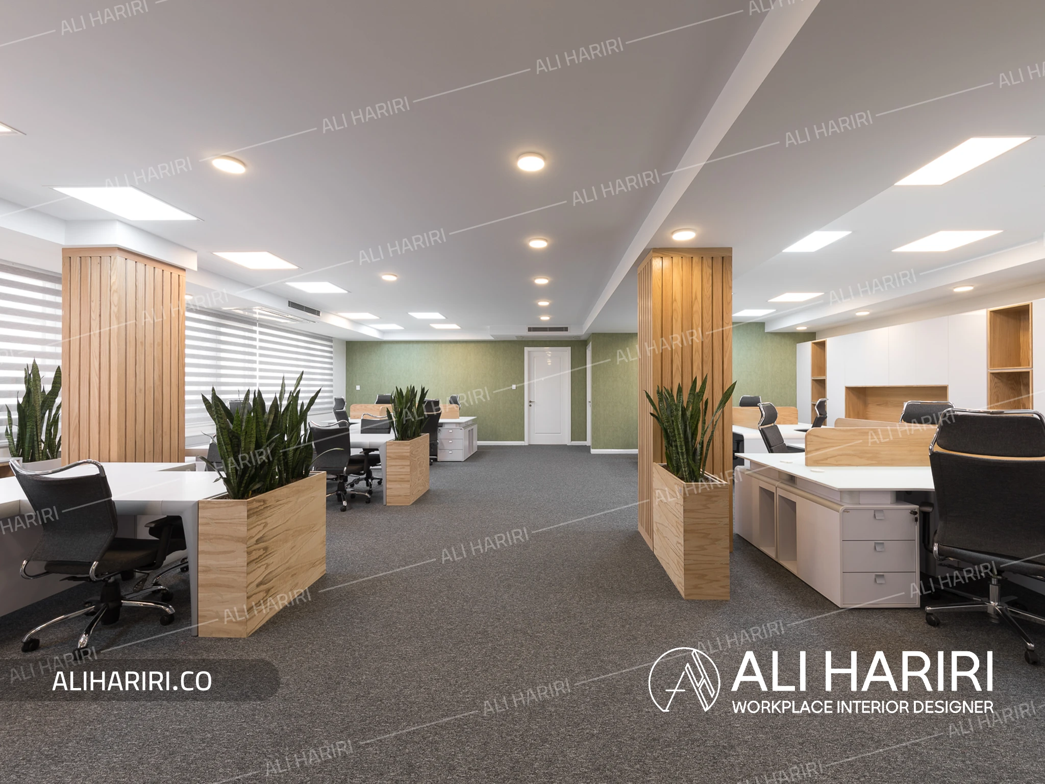 طراحی مسیرهای حرکتی با خطوط سفید منحنی سقف، ارتباطی نرم میان بخشهای مختلف ایجاد کرده و ضمن هدایت کاربران، بر هویت سیال پروژه تأکید دارد. حضور گیاهان در نقاط کلیدی نیز علاوه بر افزایش کیفیت بصری، حس طراوت و پویایی را در فضای رسمی سازمان تقویت کرده است.