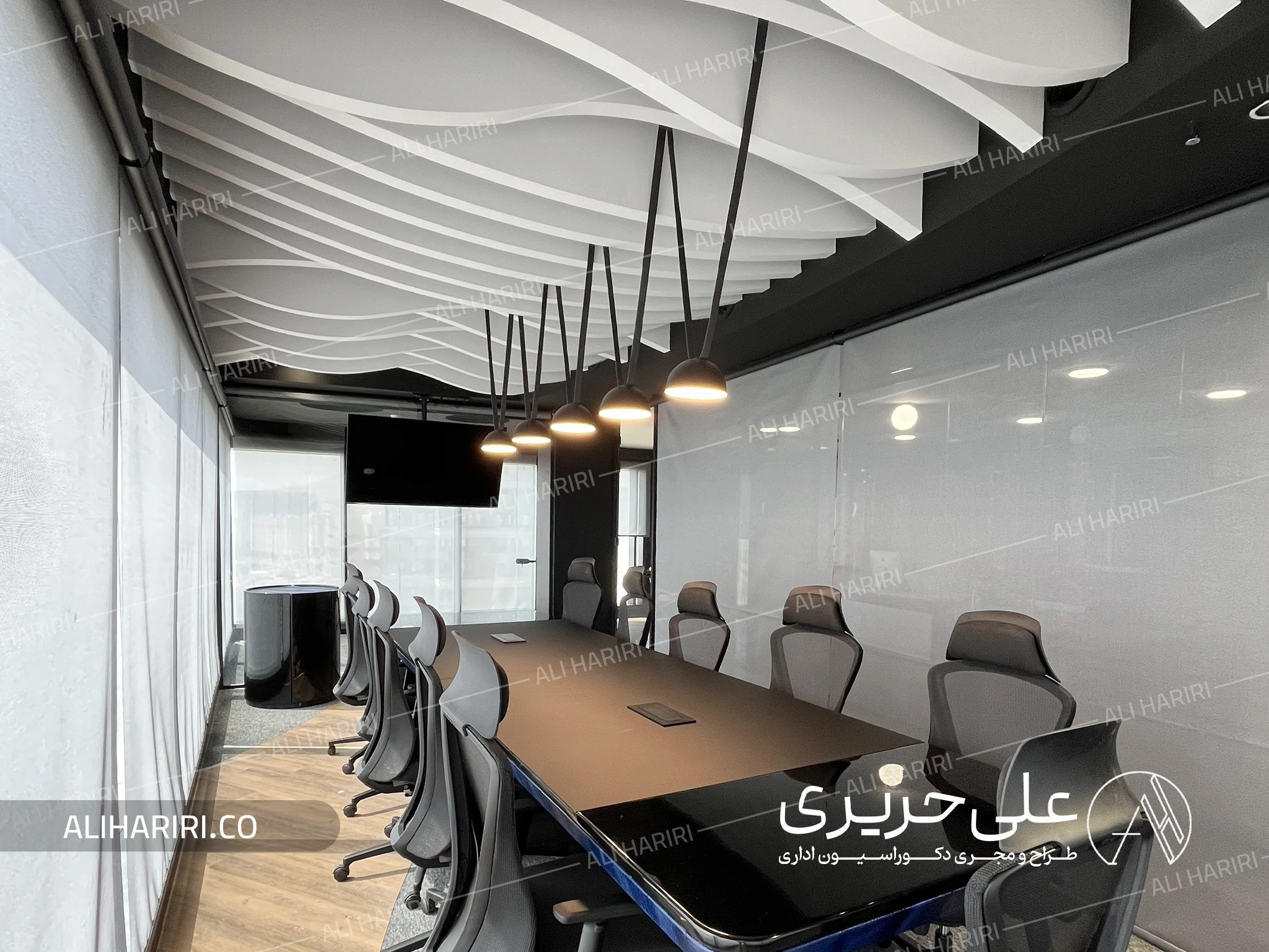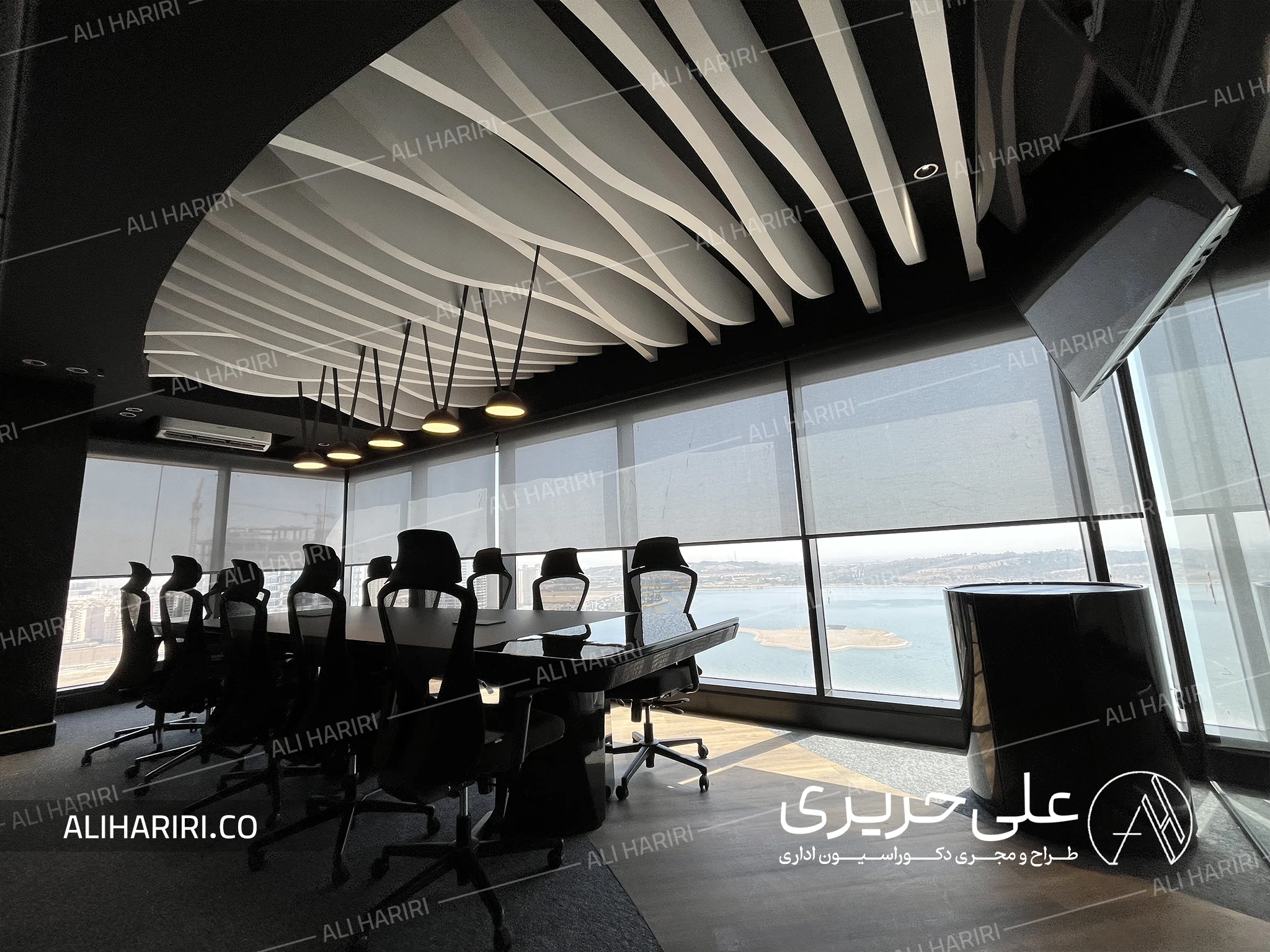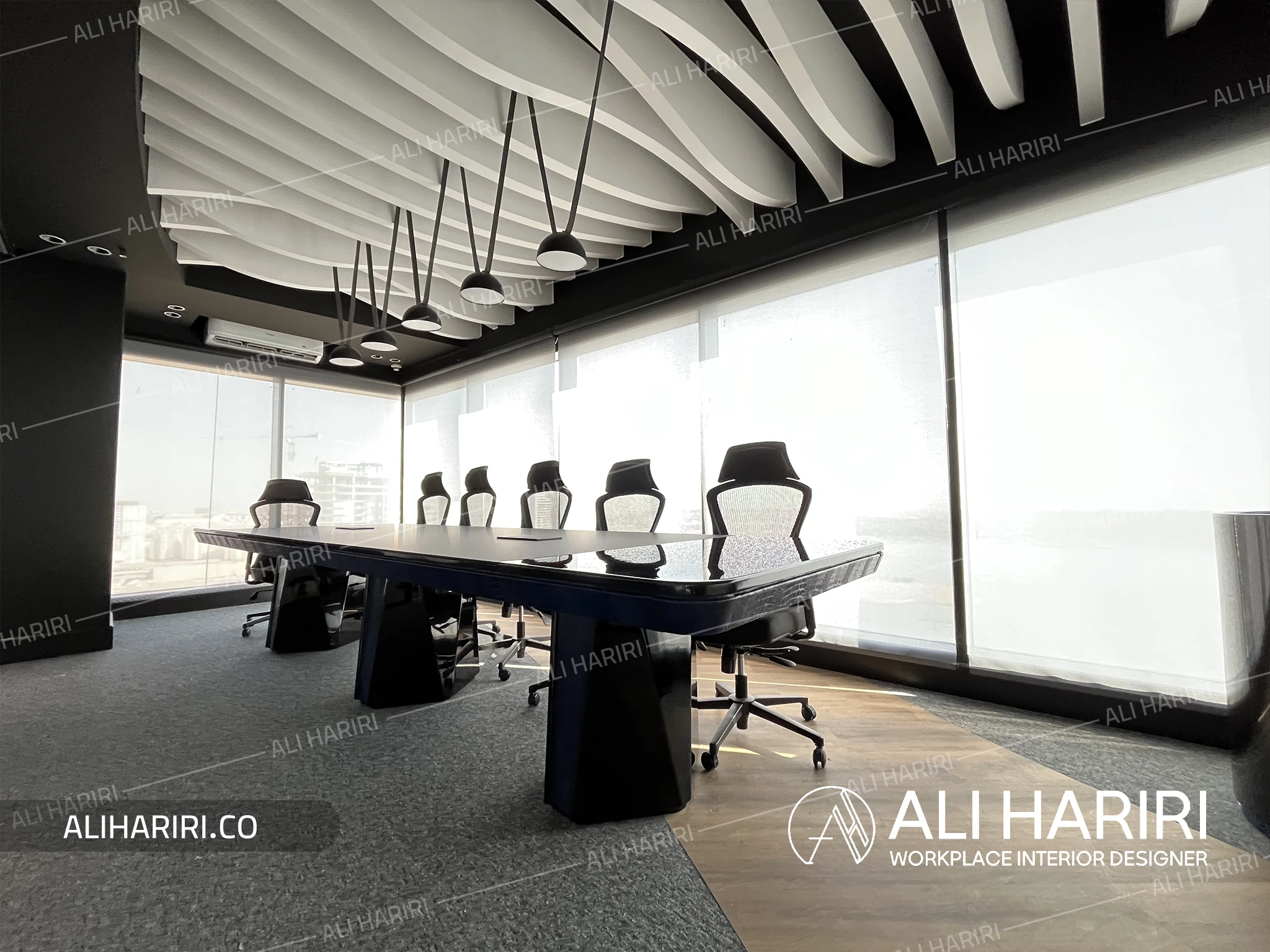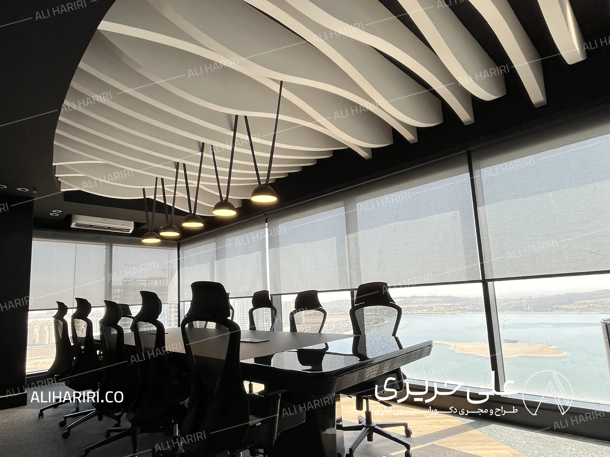 یکی از شاخصترین بخشهای پروژه، اتاق کنفرانس با سقف مواج سفید است؛ فرمی سیال و پویا که علاوهبر زیبایی بصری، نقش مهمی در بهبود آکوستیک و کنترل بازتاب صدا دارد. این فرمهای منحنی با نورهای خطی مینیمال ترکیب شدهاند و محیطی ایدهآل برای جلسات راهبردی، وبینارها و ارائههای رسمی ایجاد کردهاند.