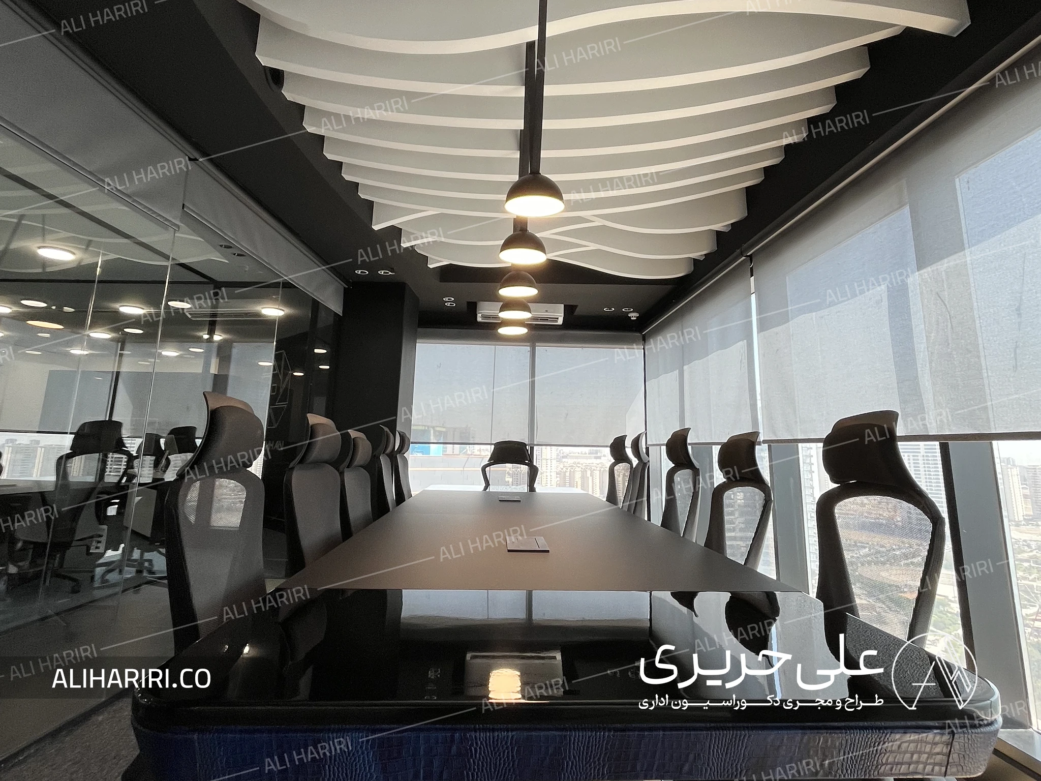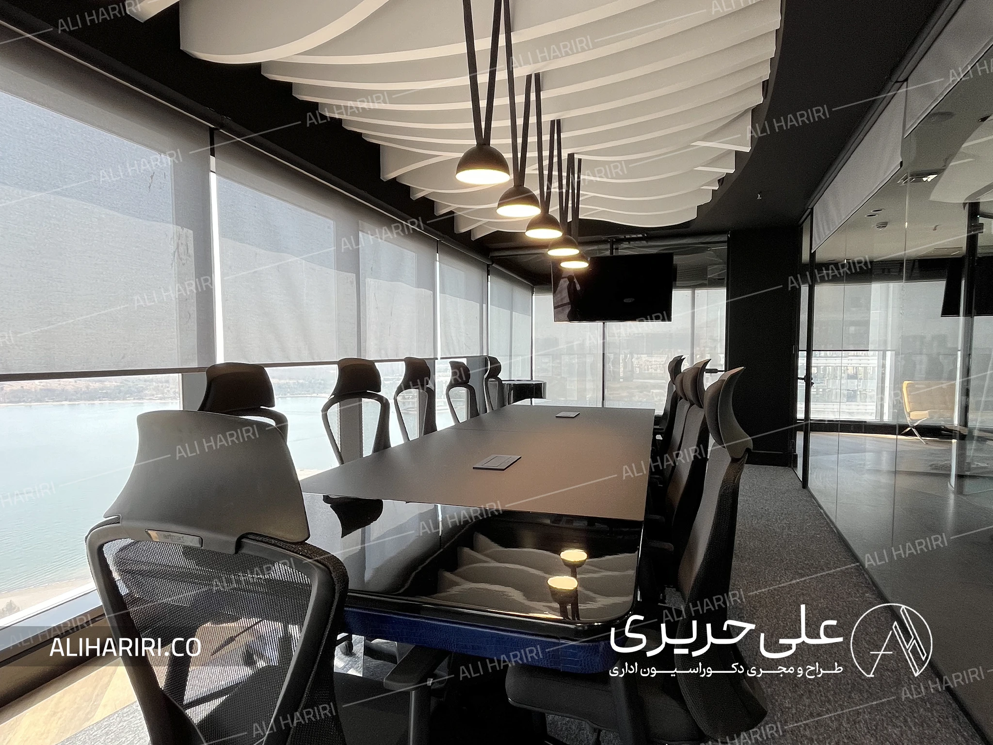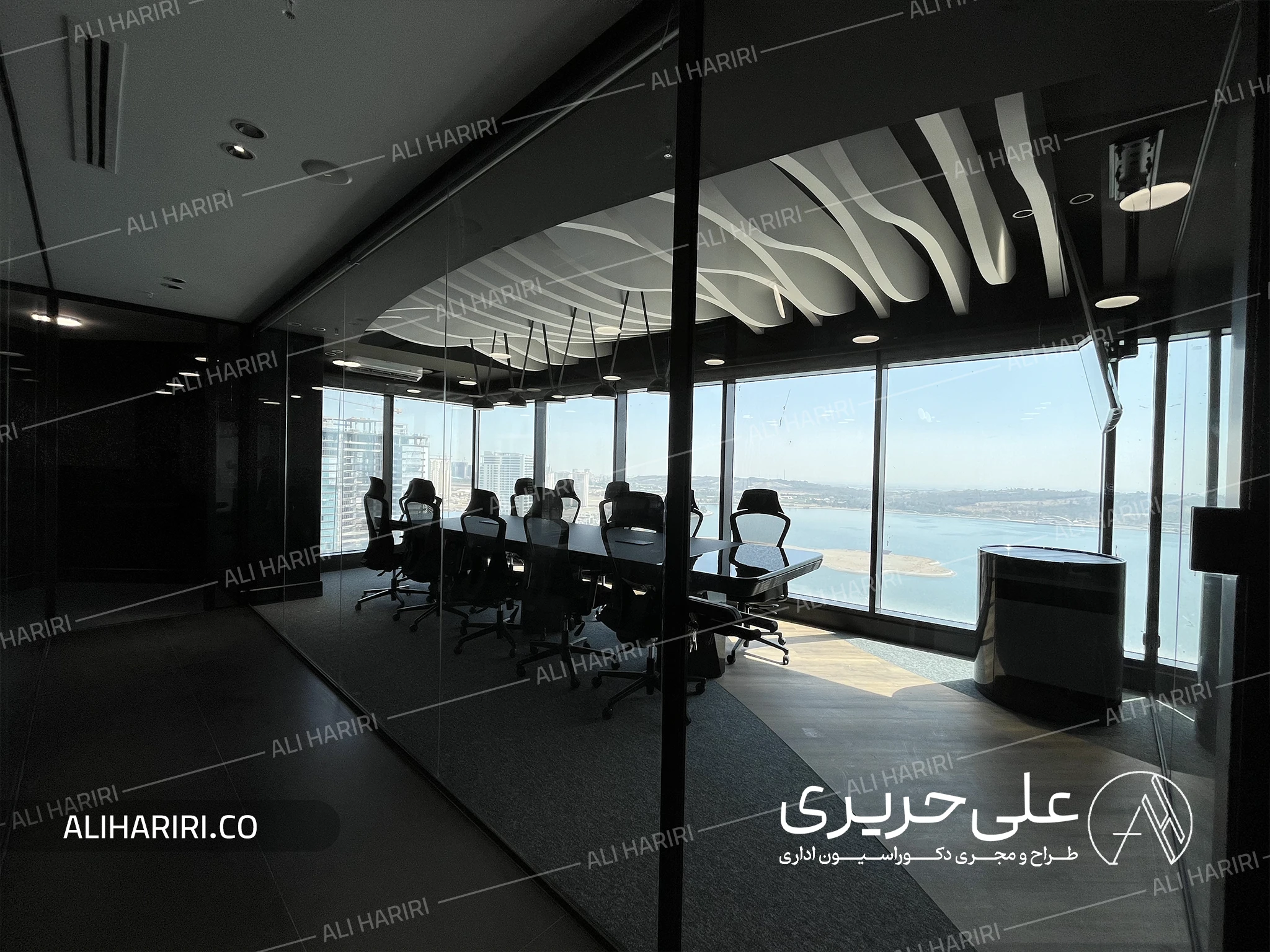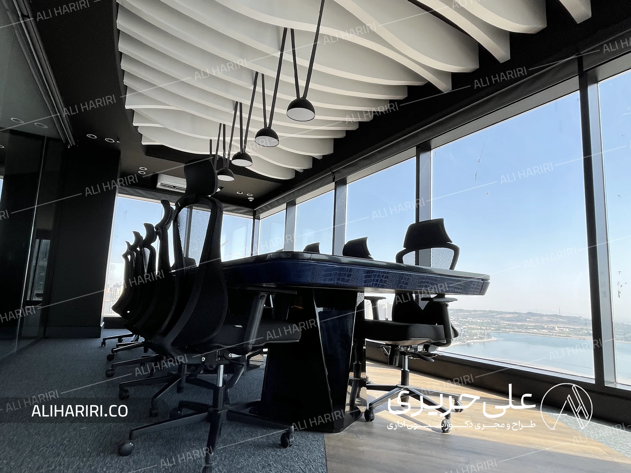 یکی از شاخصترین بخشهای پروژه، اتاق کنفرانس با سقف مواج سفید است؛ فرمی سیال و پویا که علاوهبر زیبایی بصری، نقش مهمی در بهبود آکوستیک و کنترل بازتاب صدا دارد. این فرمهای منحنی با نورهای خطی مینیمال ترکیب شدهاند و محیطی ایدهآل برای جلسات راهبردی، وبینارها و ارائههای رسمی ایجاد کردهاند.
