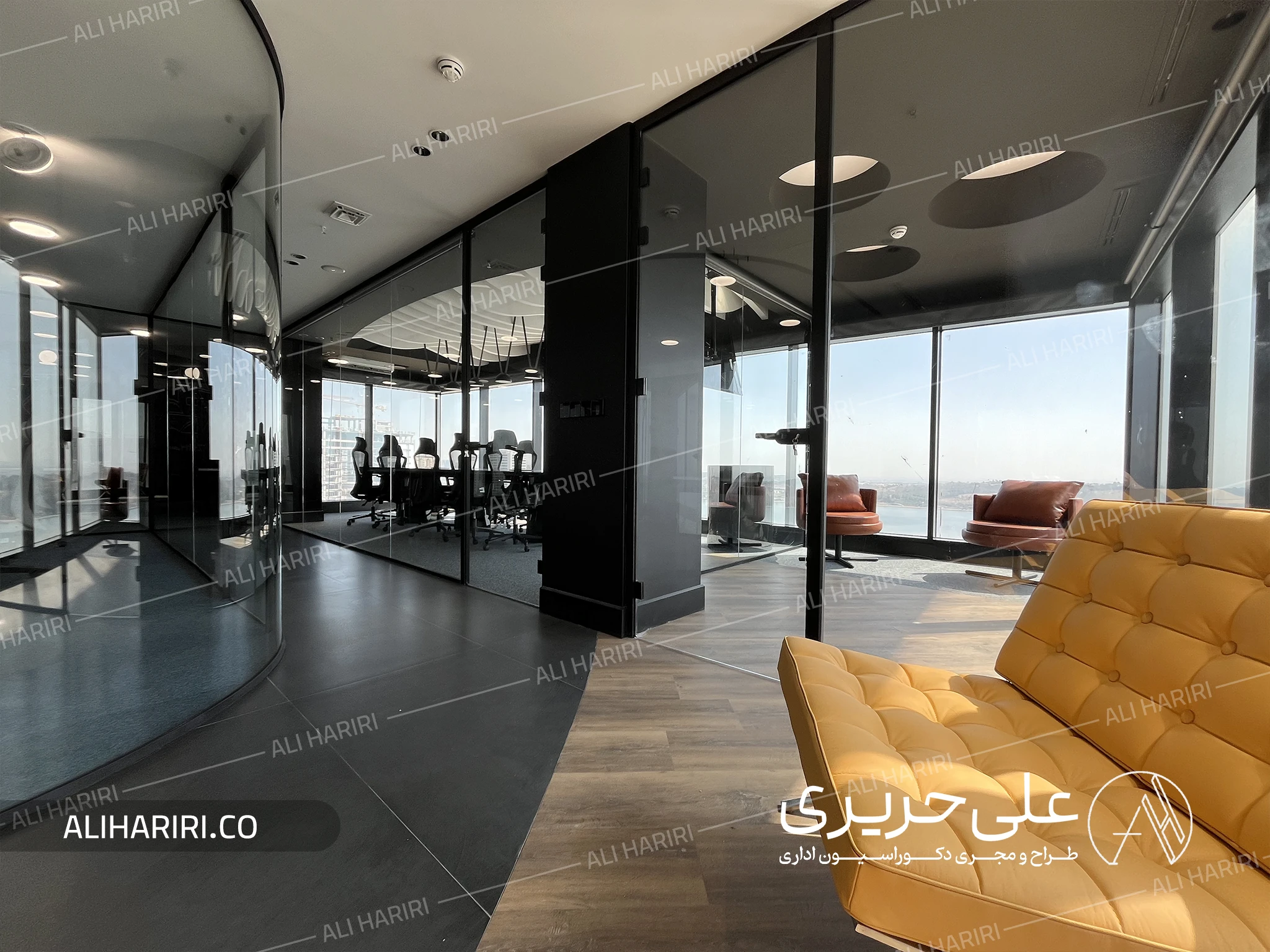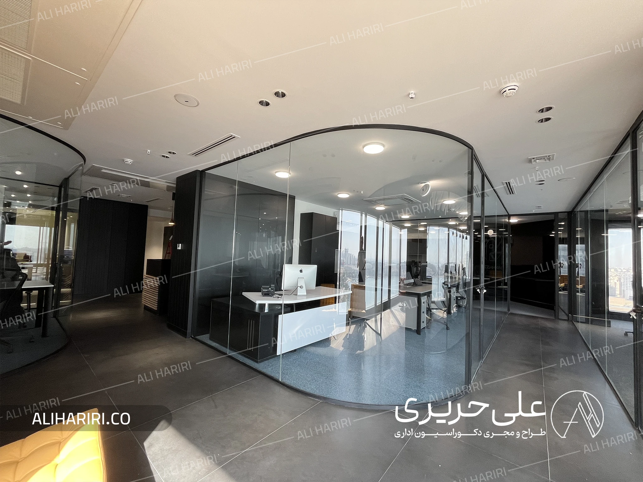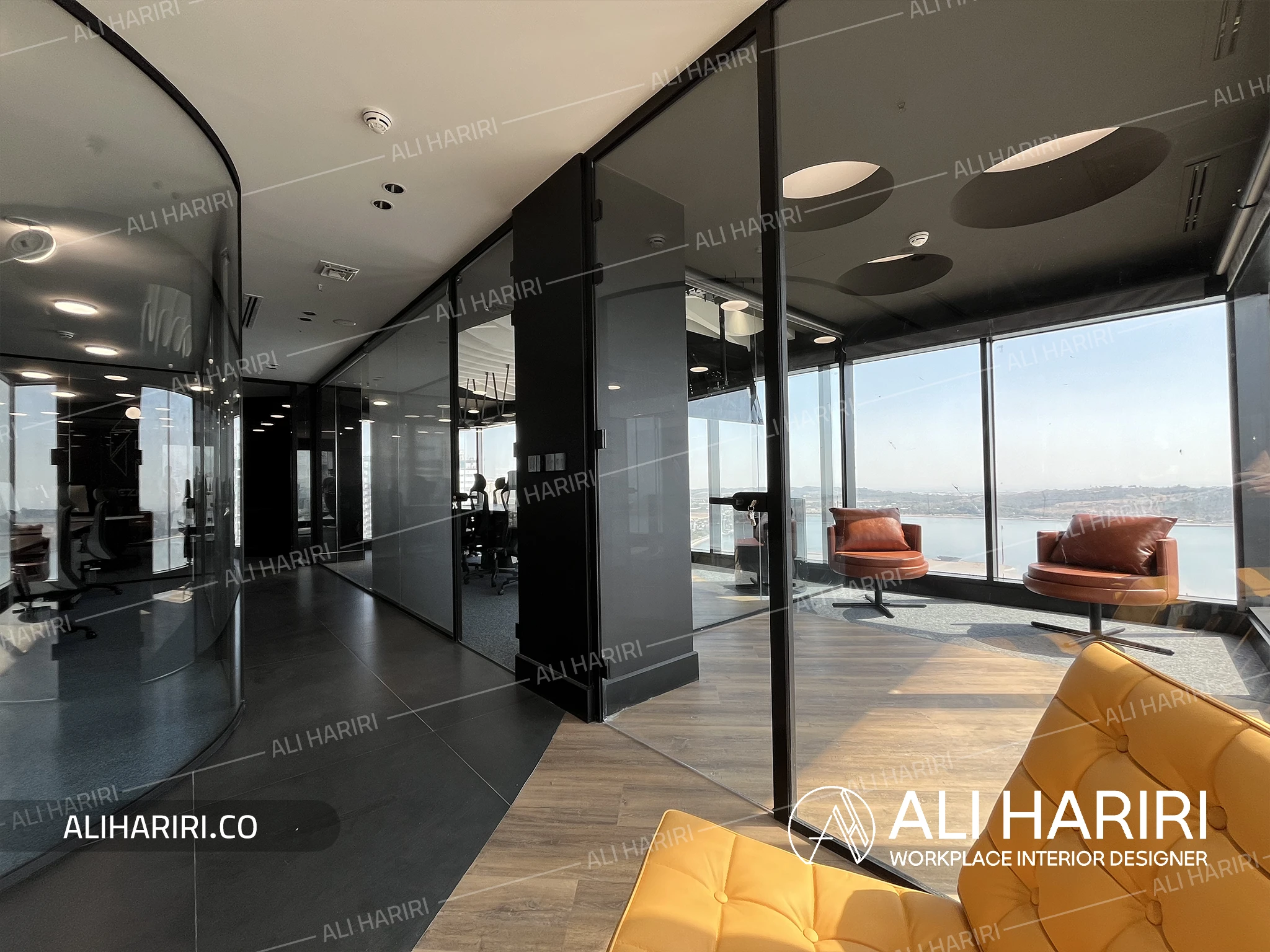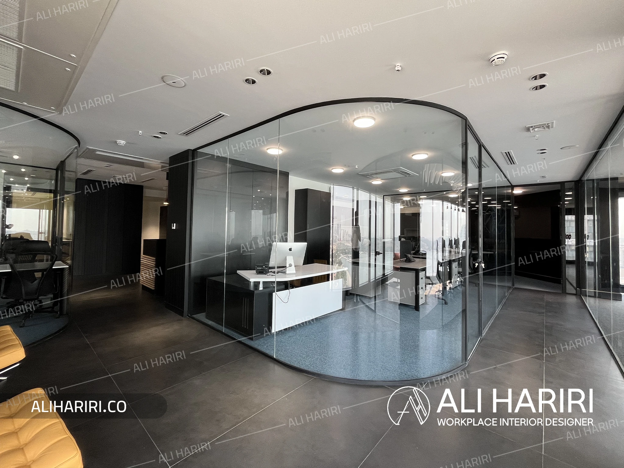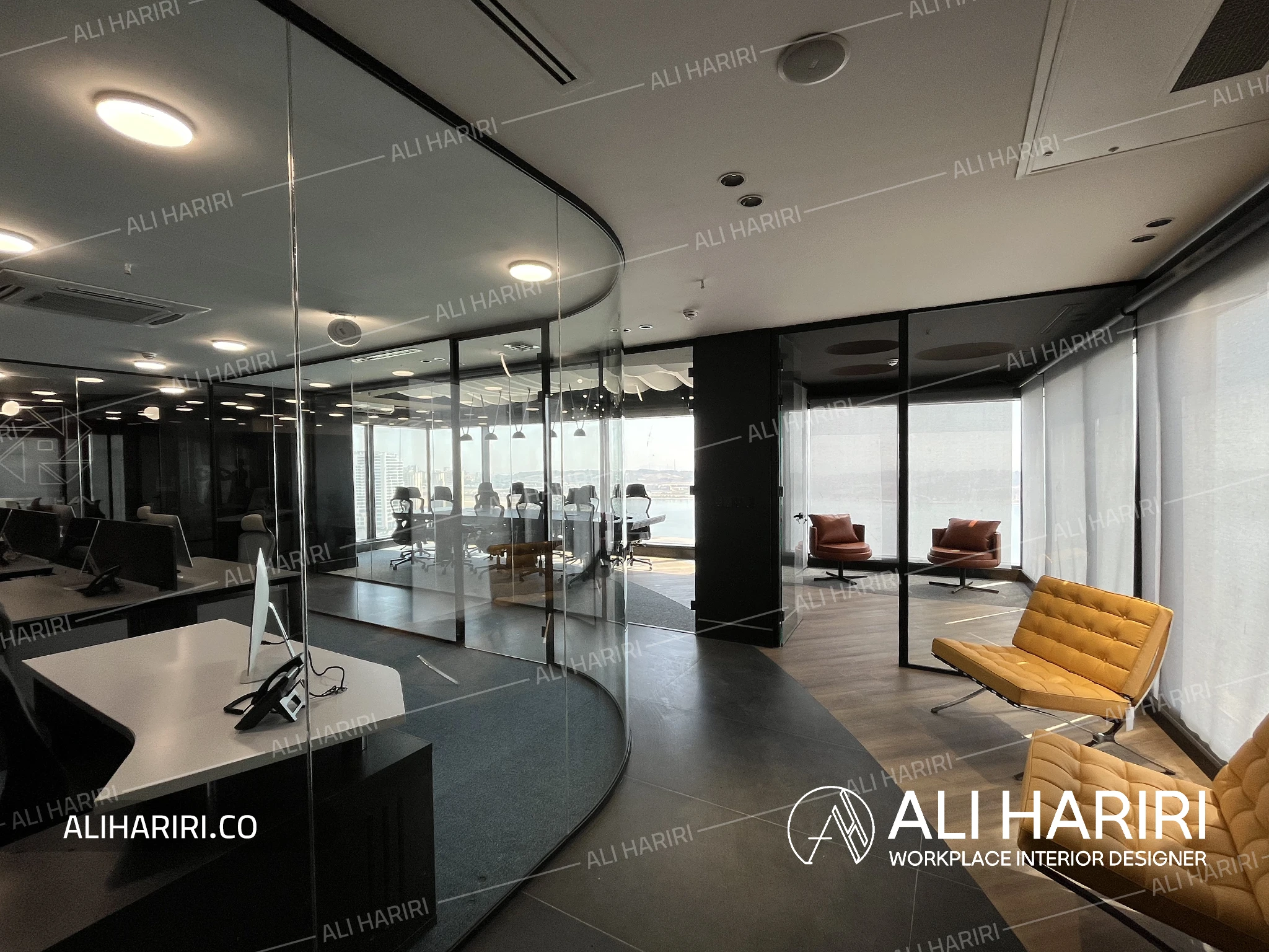 انحنای هوشمندانه در پارتیشنها، سطوح شیشهای، مسیرهای حرکتی روان و ترکیب کفپوش چوب و موکت—all create a sophisticated yet warm environment. هر بخش این فضا با هدف افزایش تمرکز، بهبود راحتی کارمندان و ارائه تصویری قوی از برند طراحی شده است.
