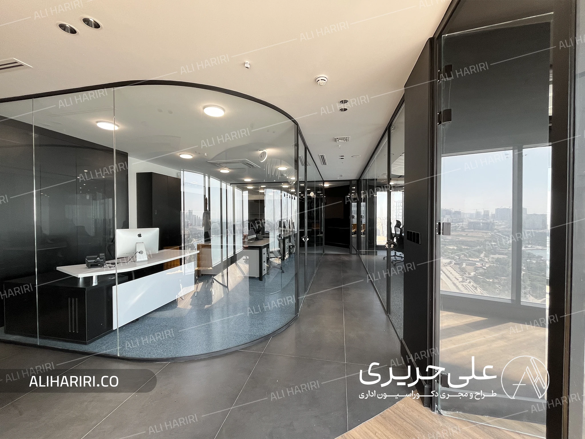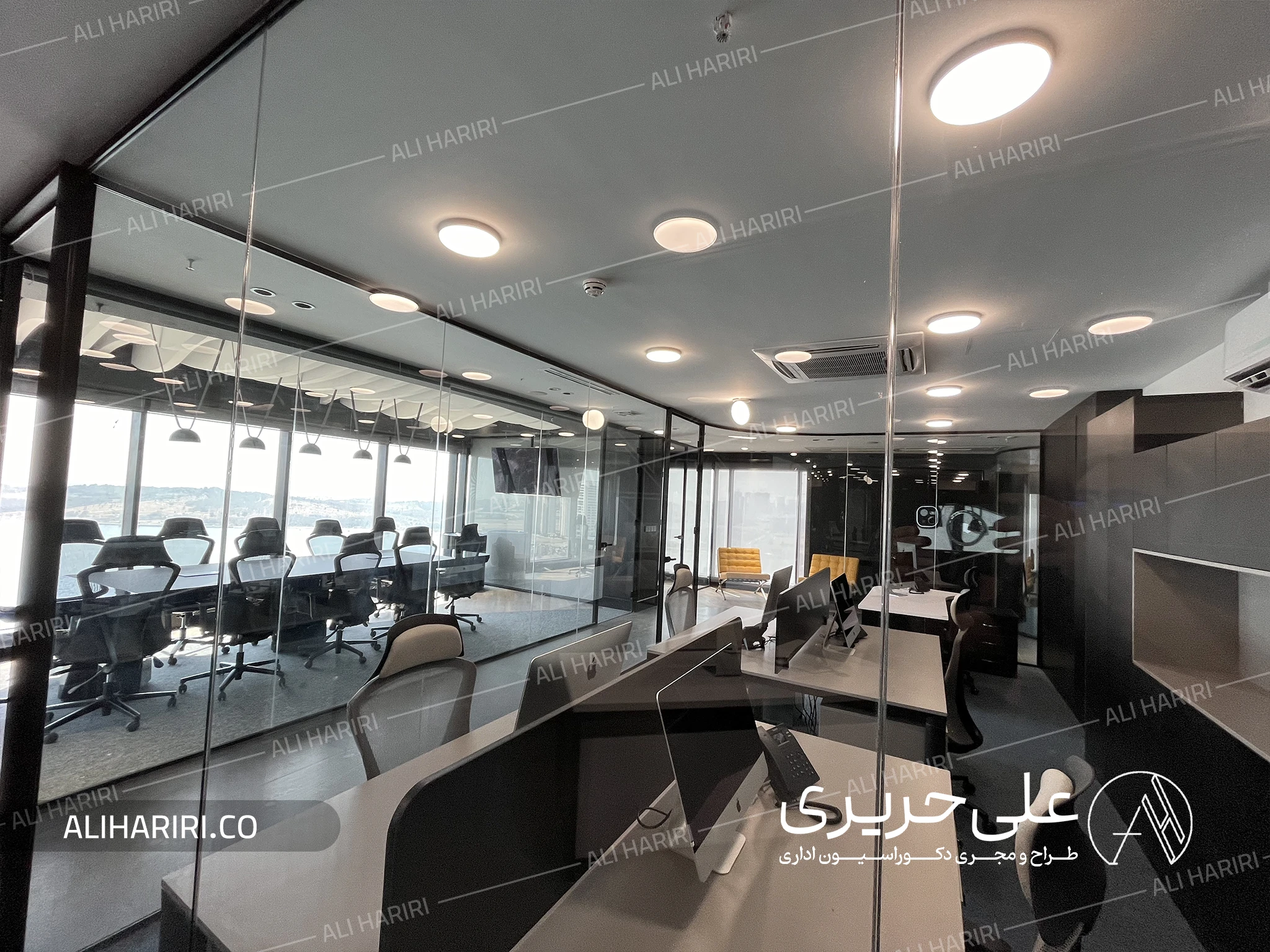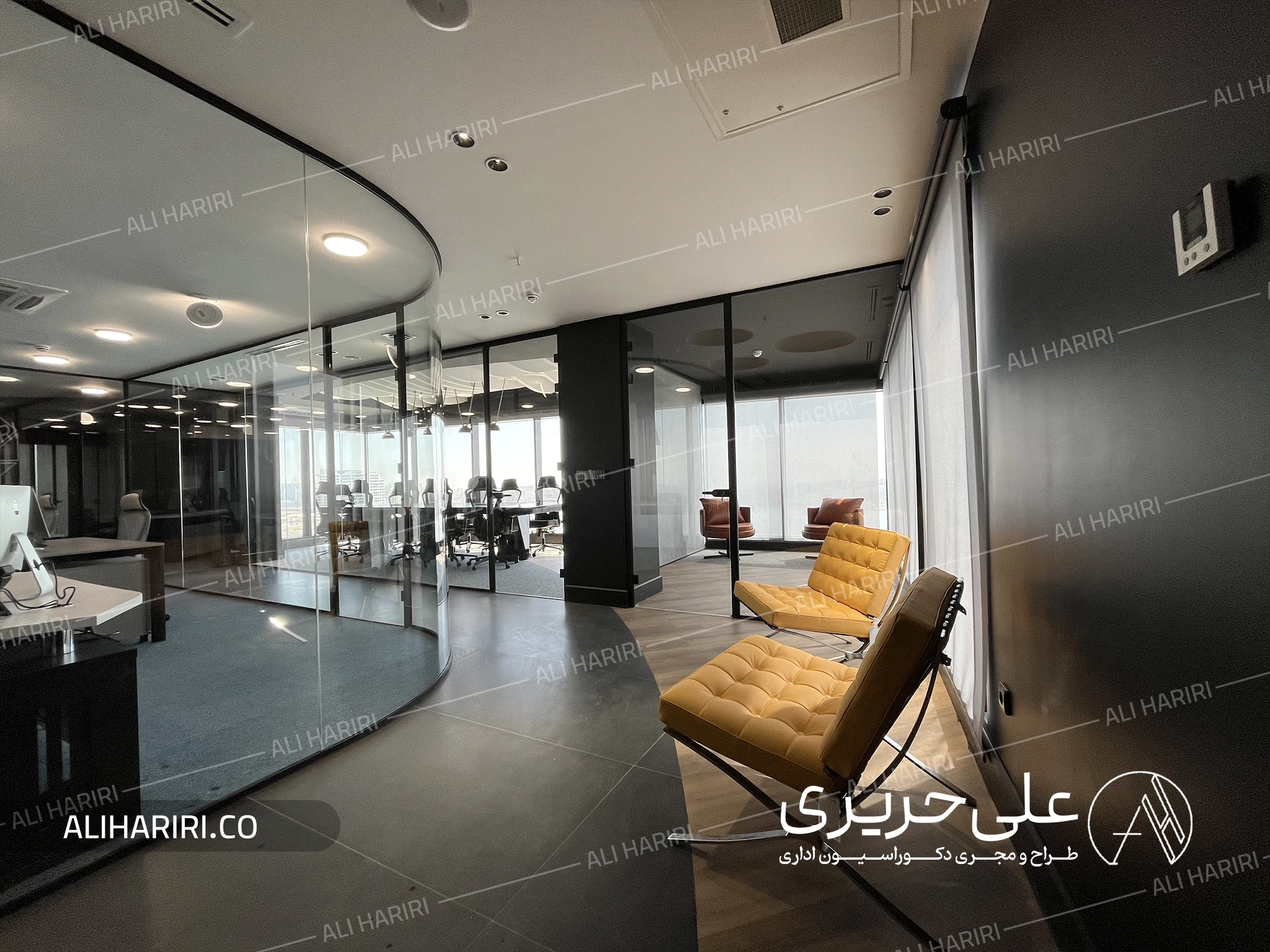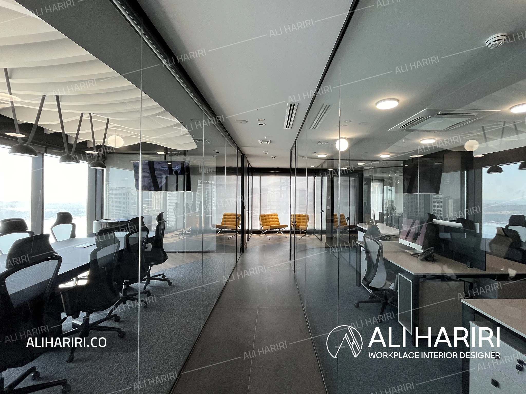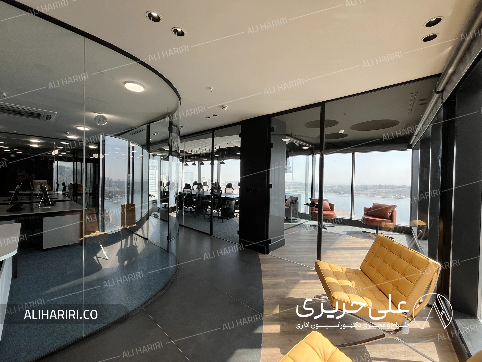 انحنای هوشمندانه در پارتیشنها، سطوح شیشهای، مسیرهای حرکتی روان و ترکیب کفپوش چوب و موکت—all create a sophisticated yet warm environment. هر بخش این فضا با هدف افزایش تمرکز، بهبود راحتی کارمندان و ارائه تصویری قوی از برند طراحی شده است.