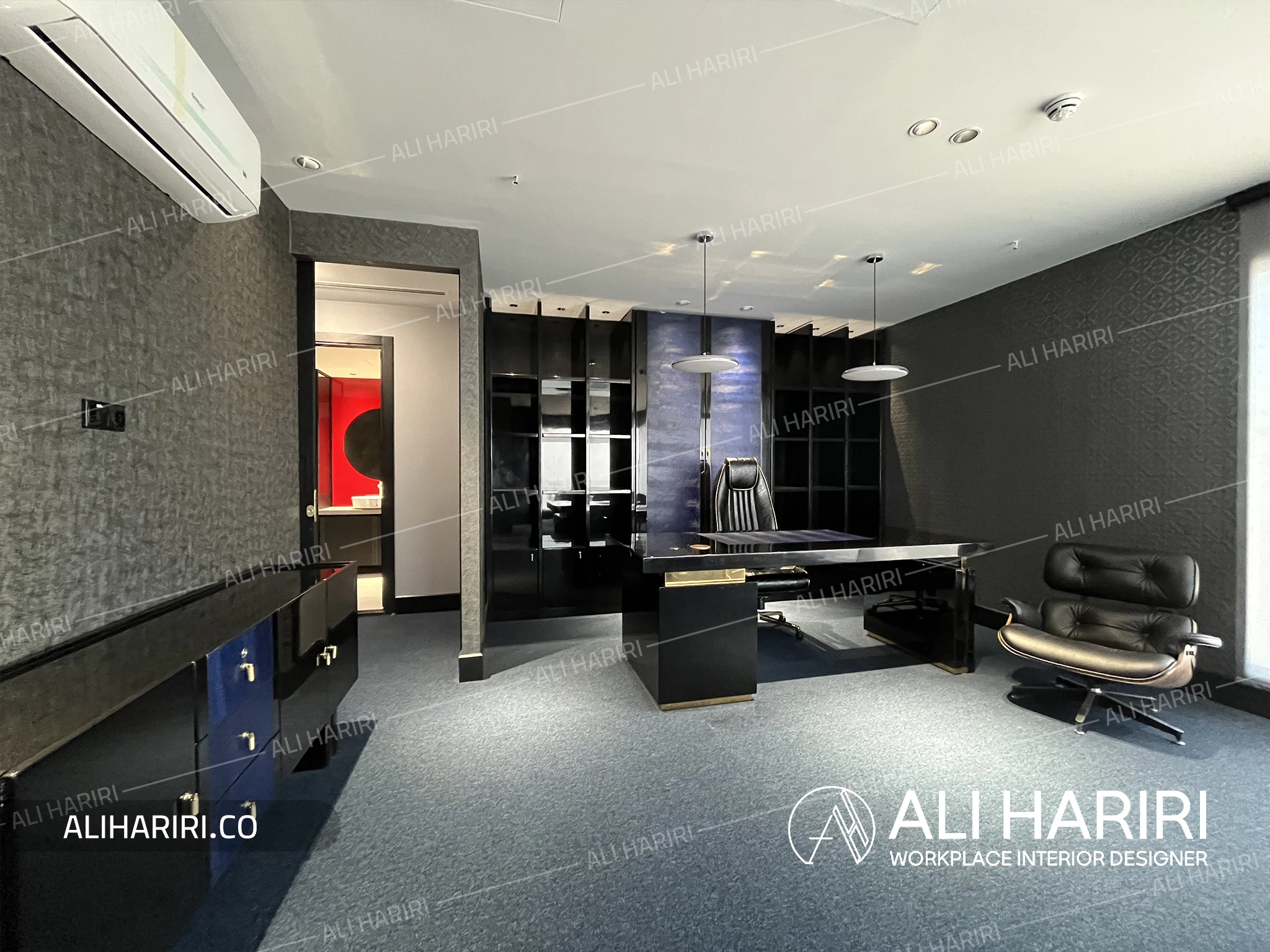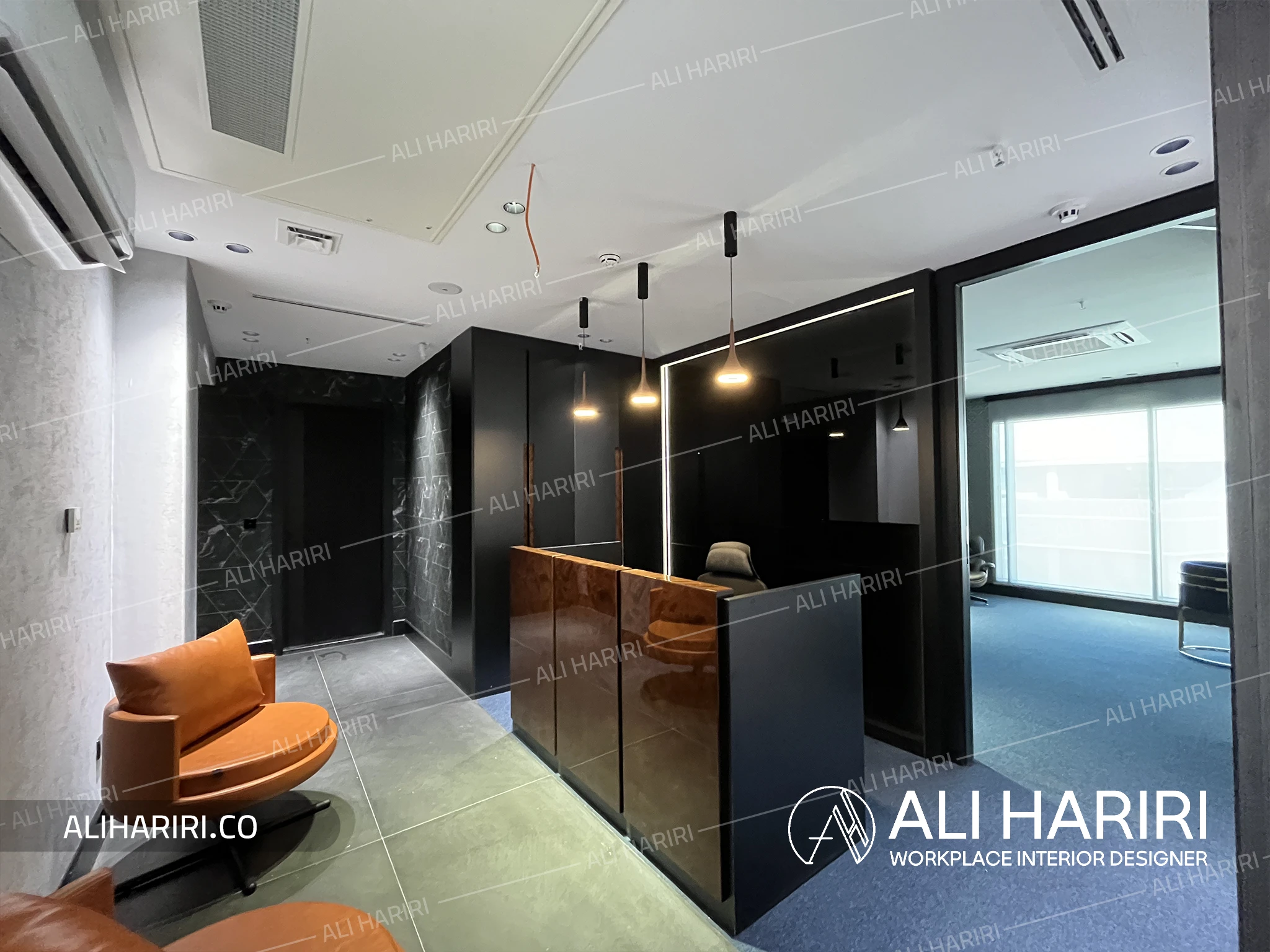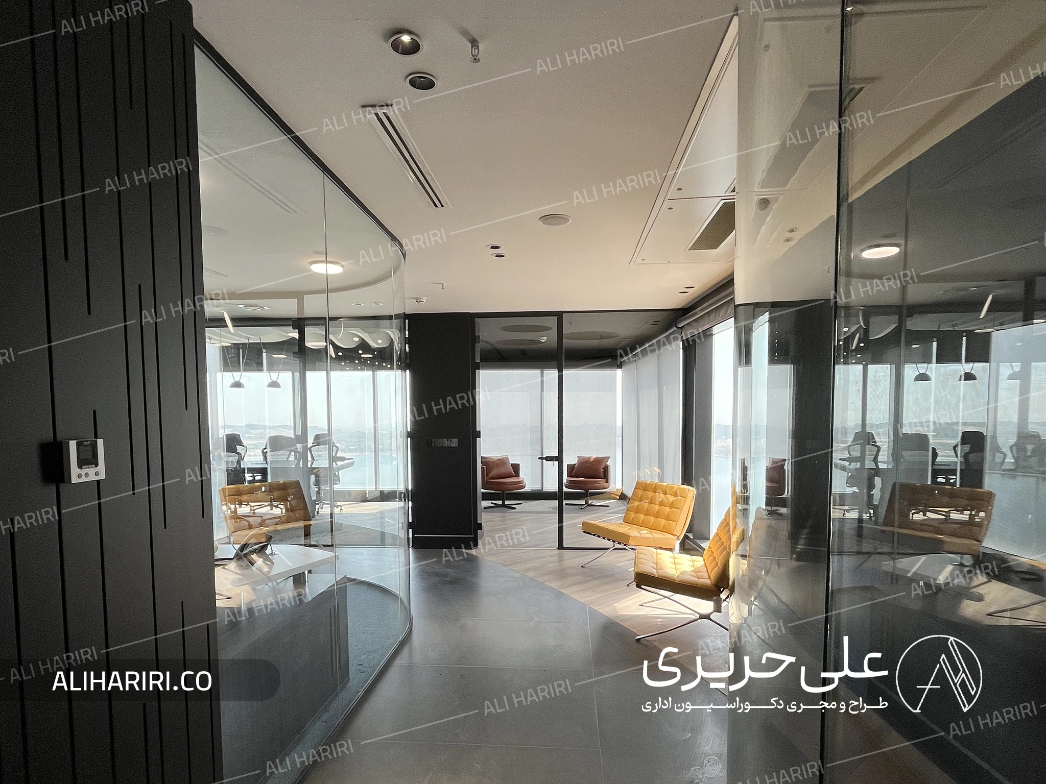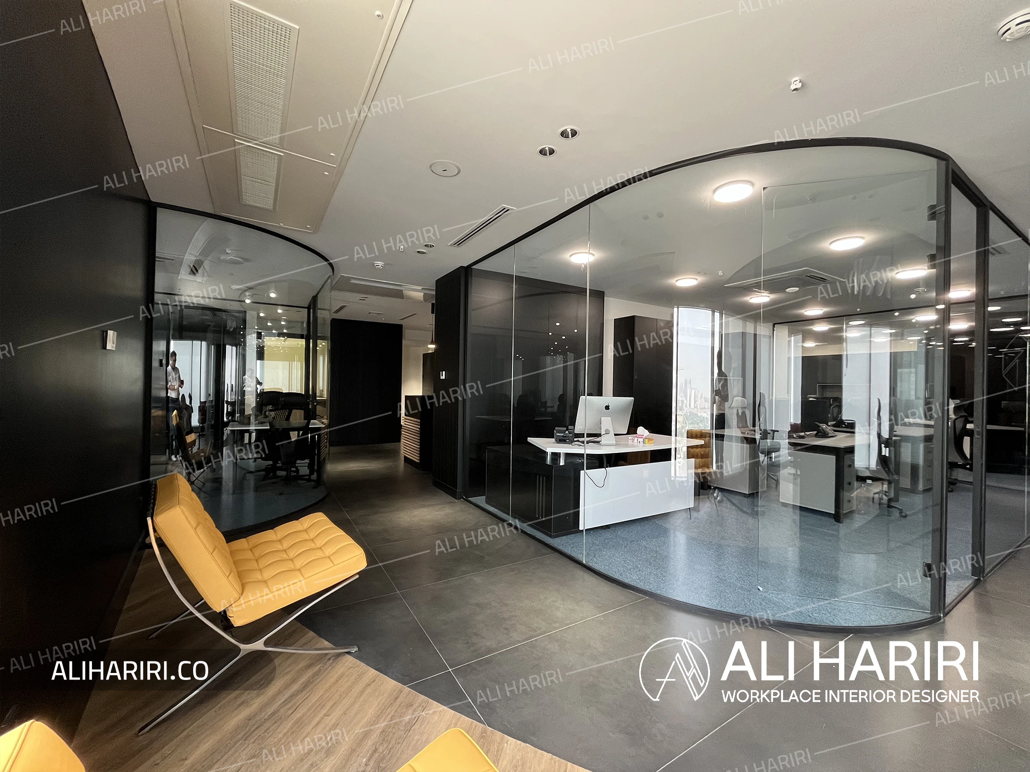 در این پروژه تلاش شد تعادلی دقیق میان رنگهای تیرهٔ مدرن (Black Theme)، متریالهای لوکس مانند شیشه و صفحات براق، و بافتهای گرم مبلمان ایجاد شود. صندلیهای مدیریتی مشکی، دیوارهای تیره و قابهای شیشهای شفاف، فضایی یکپارچه و مینیمال به وجود آوردهاند؛ فضایی که حرفهای بودن شرکت را در نگاه اول منتقل میکند.