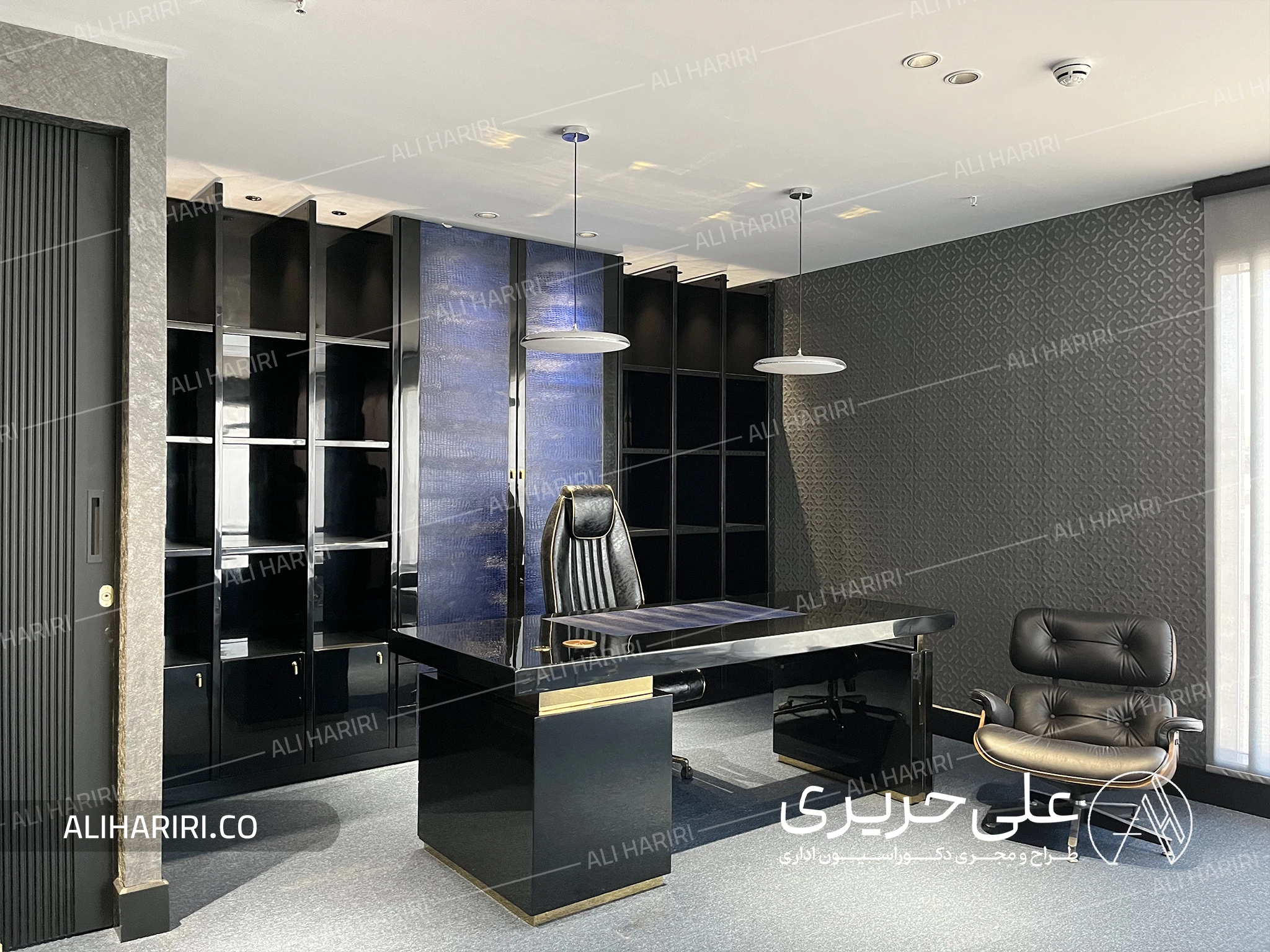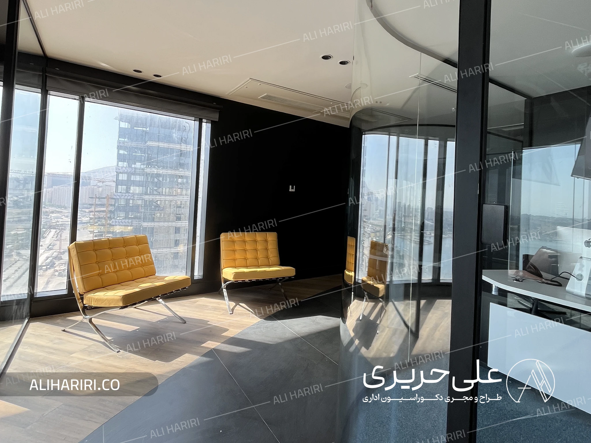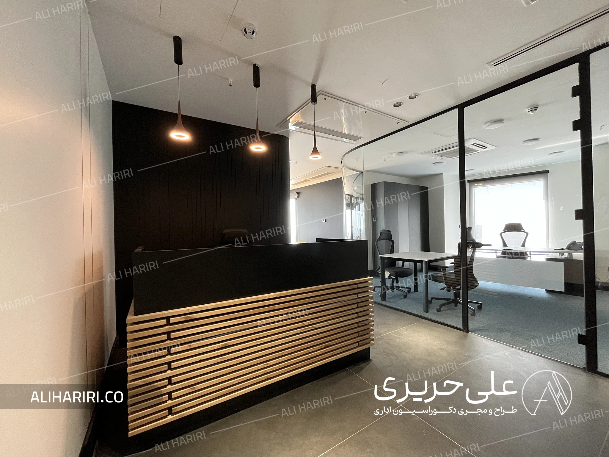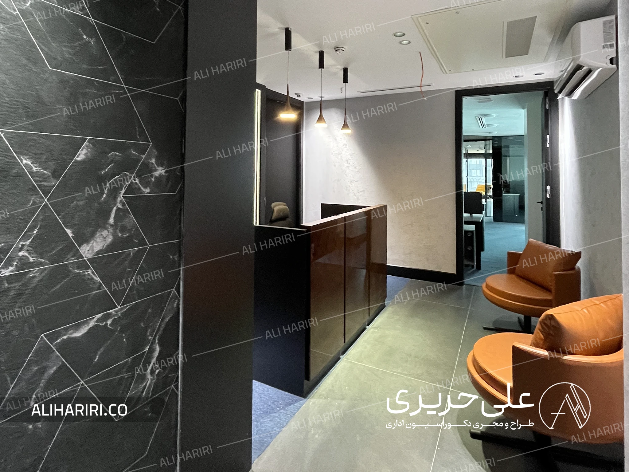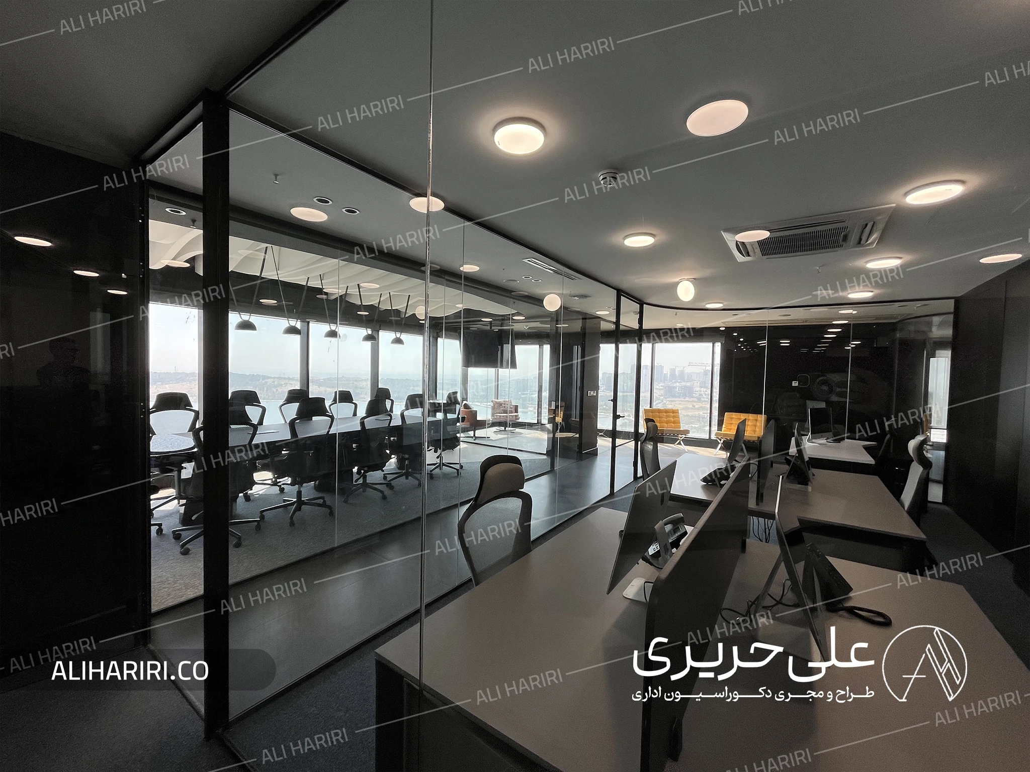 در این پروژه تلاش شد تعادلی دقیق میان رنگهای تیرهٔ مدرن (Black Theme)، متریالهای لوکس مانند شیشه و صفحات براق، و بافتهای گرم مبلمان ایجاد شود. صندلیهای مدیریتی مشکی، دیوارهای تیره و قابهای شیشهای شفاف، فضایی یکپارچه و مینیمال به وجود آوردهاند؛ فضایی که حرفهای بودن شرکت را در نگاه اول منتقل میکند.