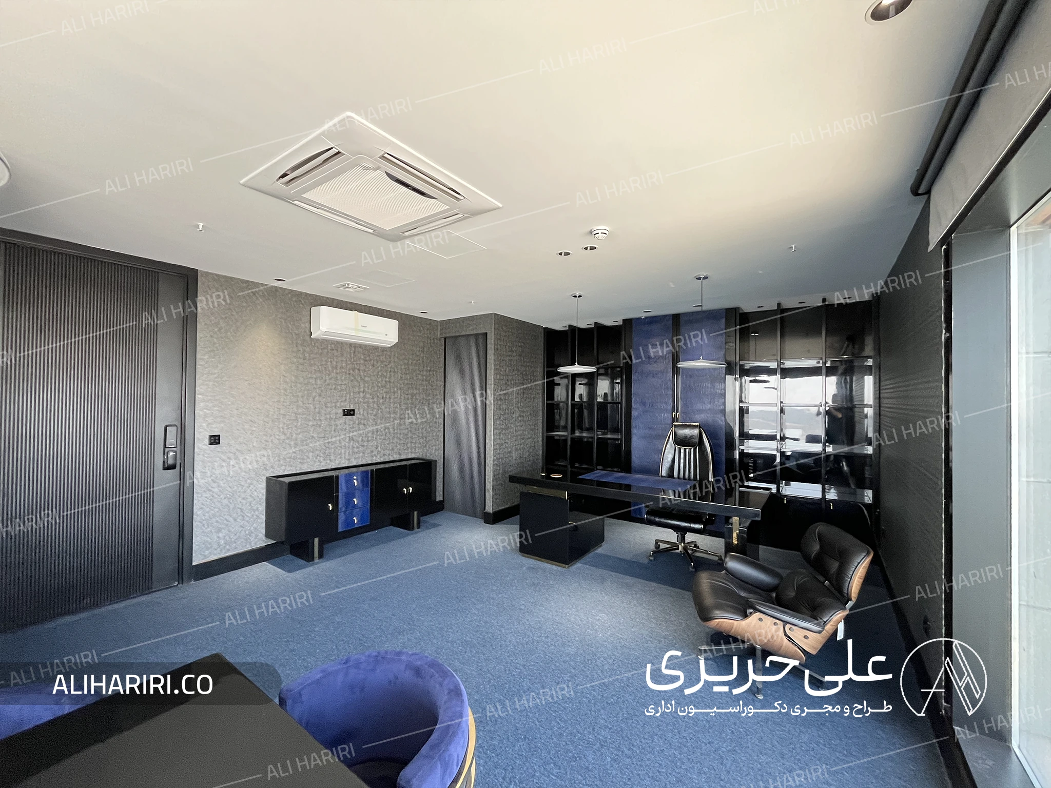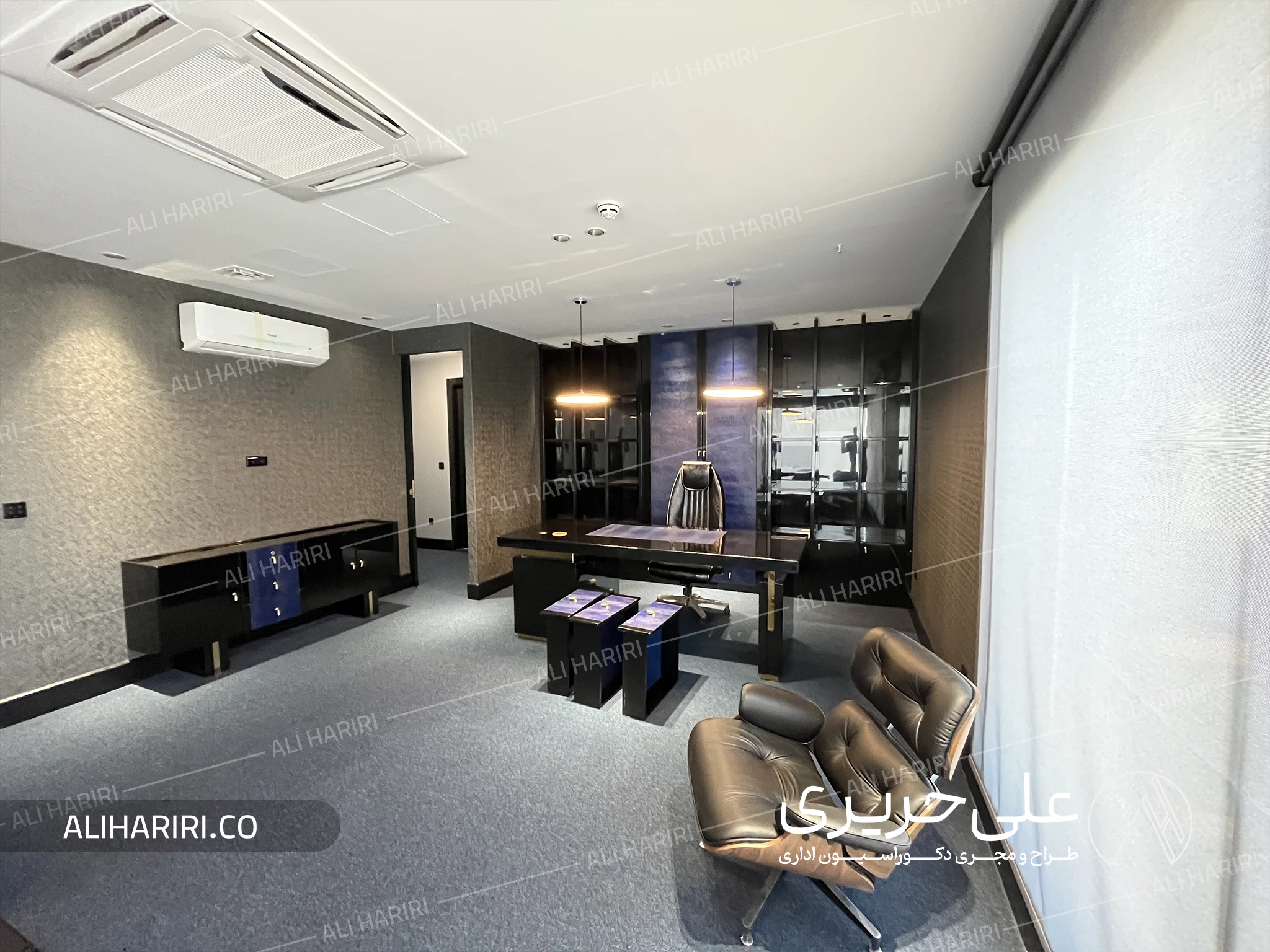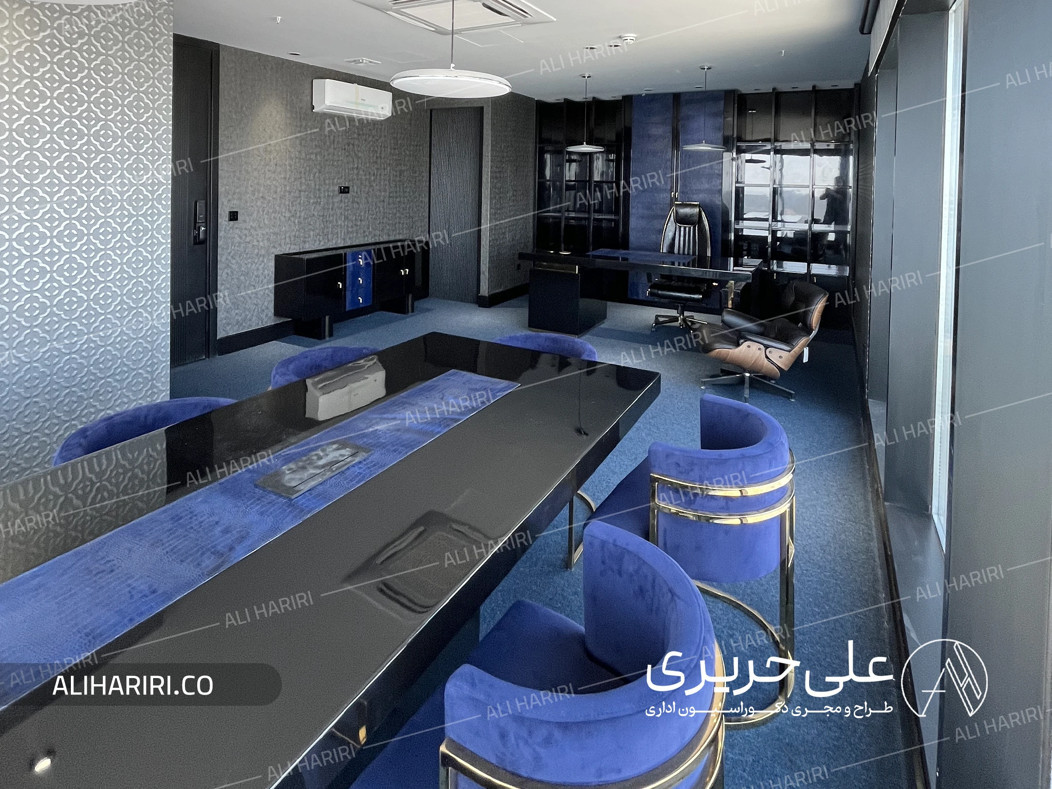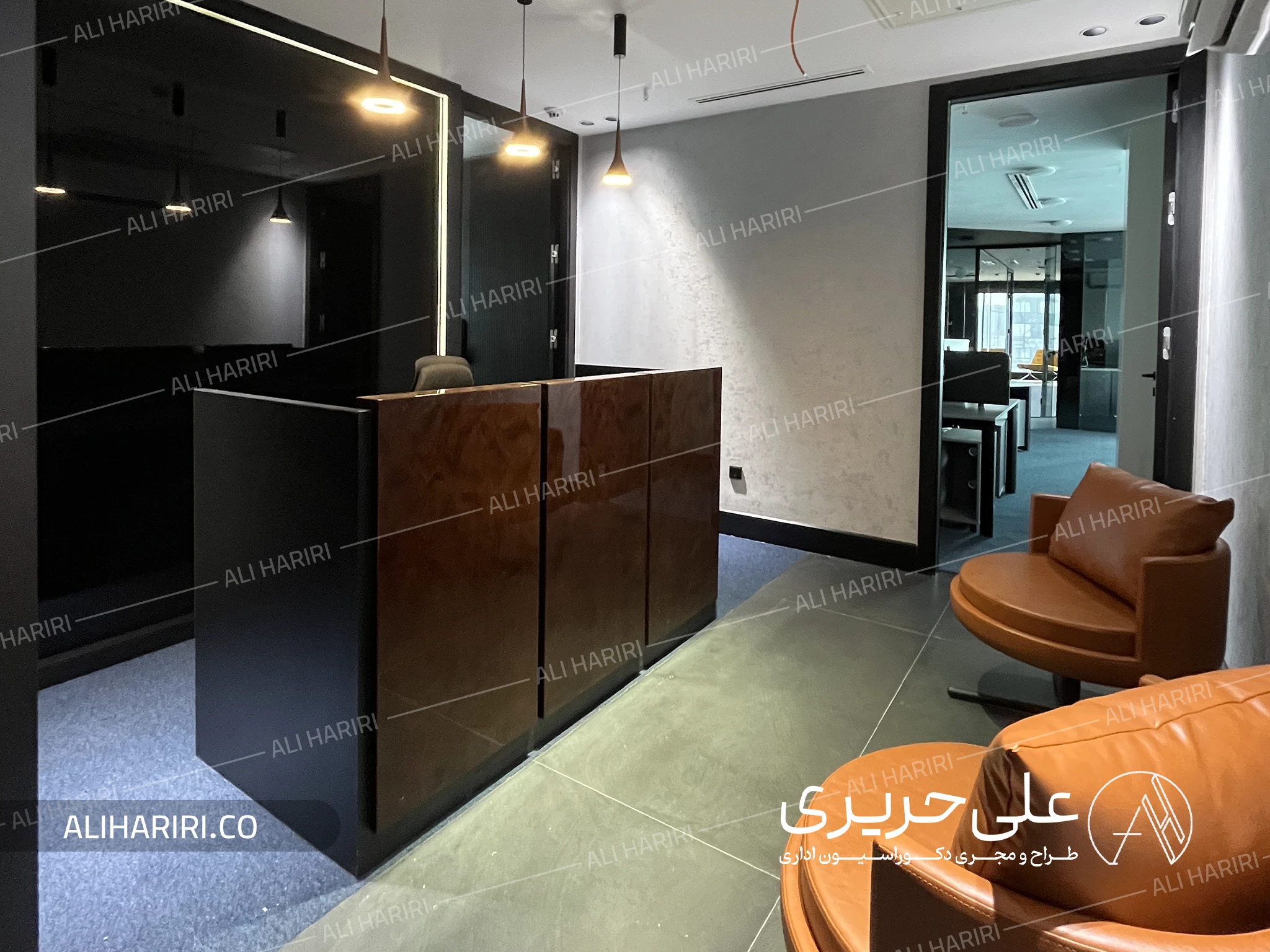 در این پروژه تلاش شد تعادلی دقیق میان رنگهای تیرهٔ مدرن (Black Theme)، متریالهای لوکس مانند شیشه و صفحات براق، و بافتهای گرم مبلمان ایجاد شود. صندلیهای مدیریتی مشکی، دیوارهای تیره و قابهای شیشهای شفاف، فضایی یکپارچه و مینیمال به وجود آوردهاند؛ فضایی که حرفهای بودن شرکت را در نگاه اول منتقل میکند.