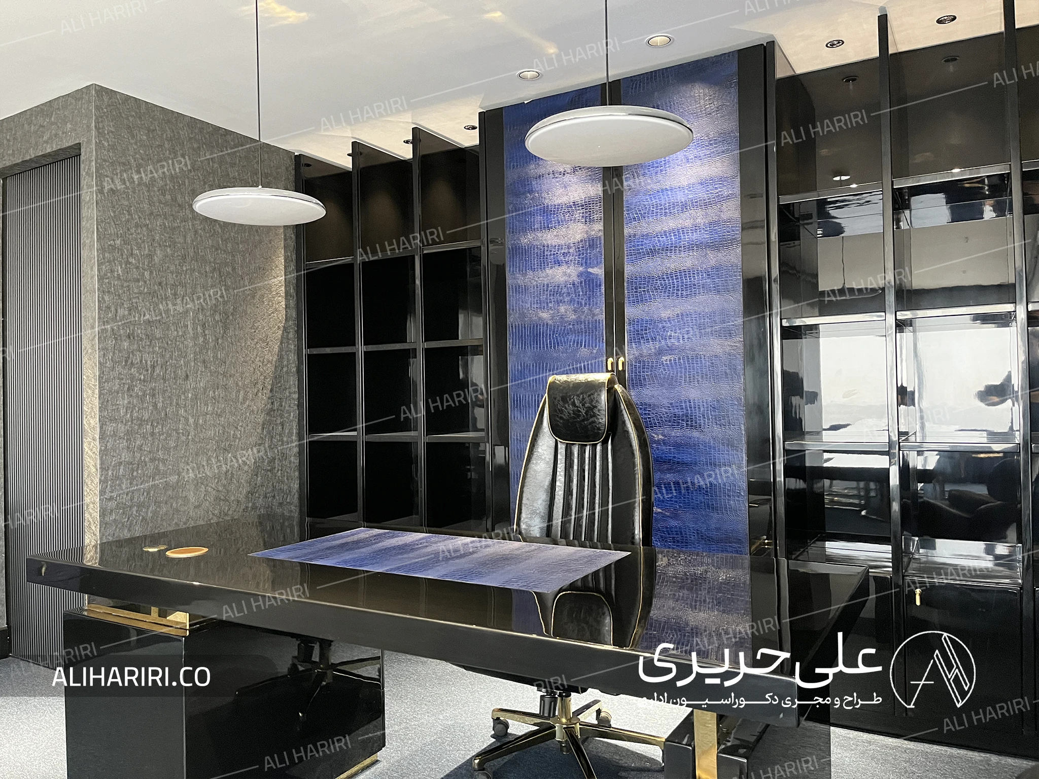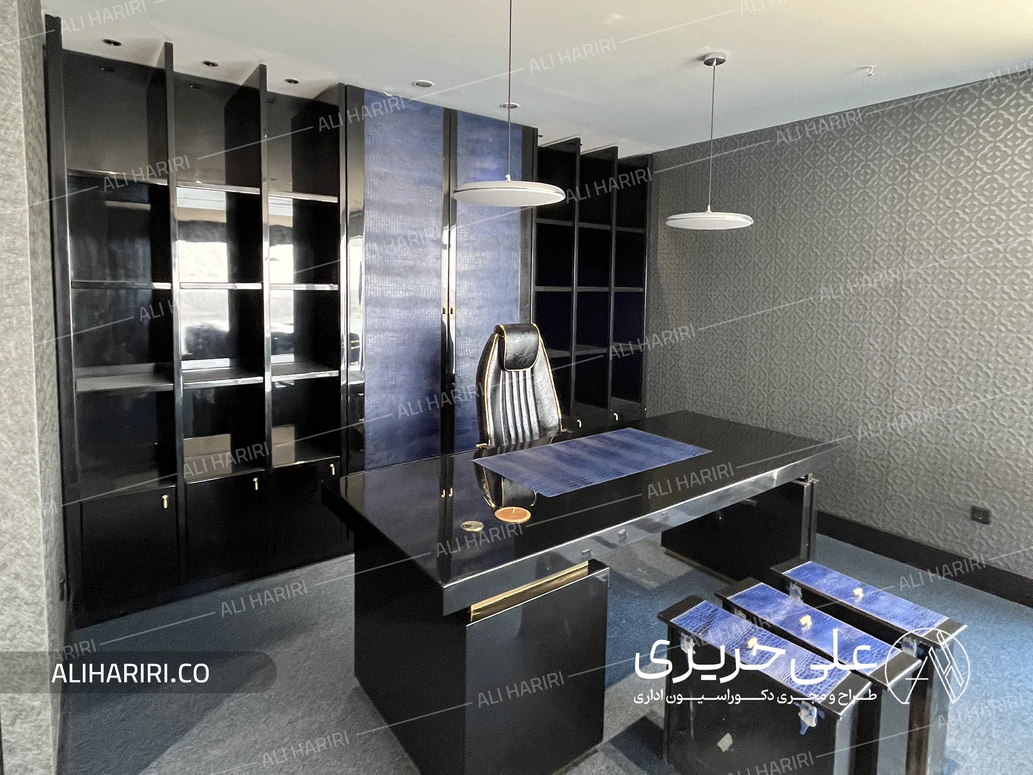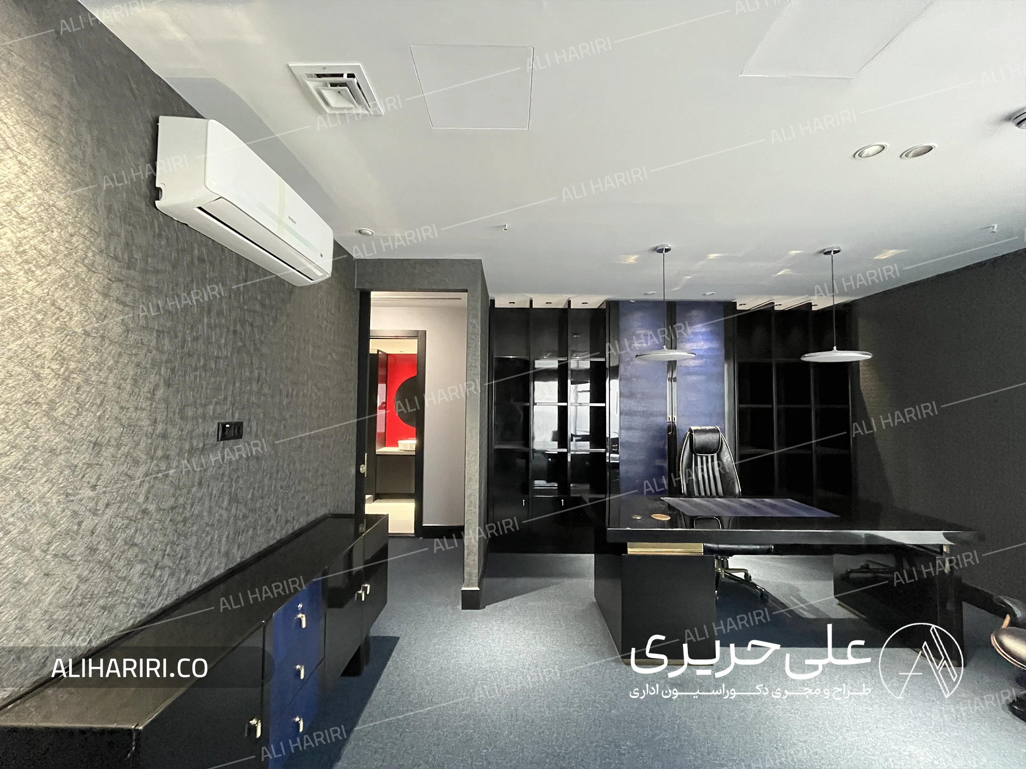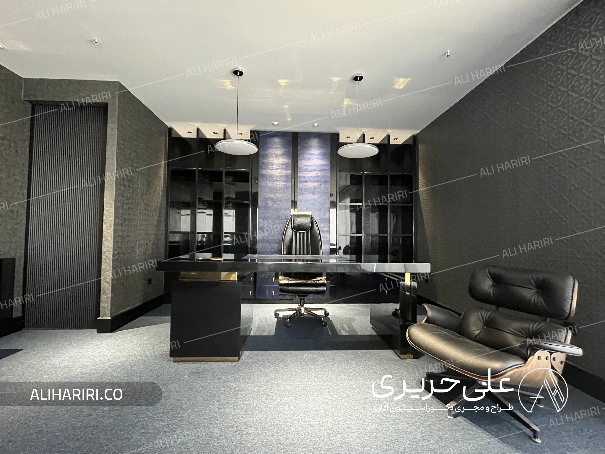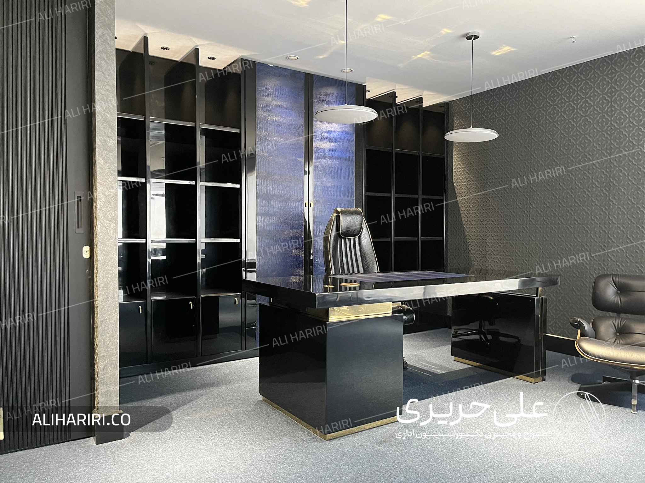 در این پروژه تلاش شد تعادلی دقیق میان رنگهای تیرهٔ مدرن (Black Theme)، متریالهای لوکس مانند شیشه و صفحات براق، و بافتهای گرم مبلمان ایجاد شود. صندلیهای مدیریتی مشکی، دیوارهای تیره و قابهای شیشهای شفاف، فضایی یکپارچه و مینیمال به وجود آوردهاند؛ فضایی که حرفهای بودن شرکت را در نگاه اول منتقل میکند.