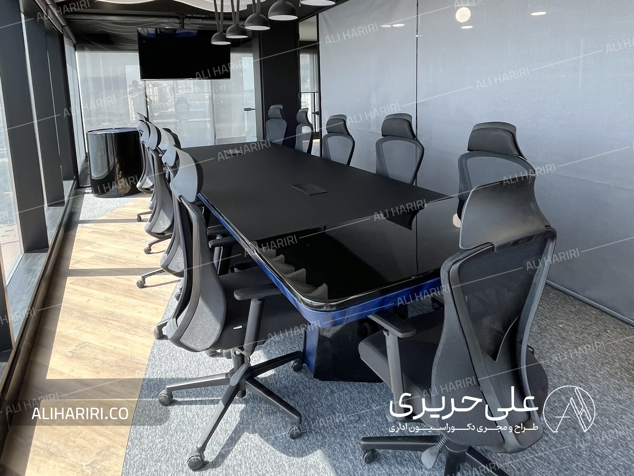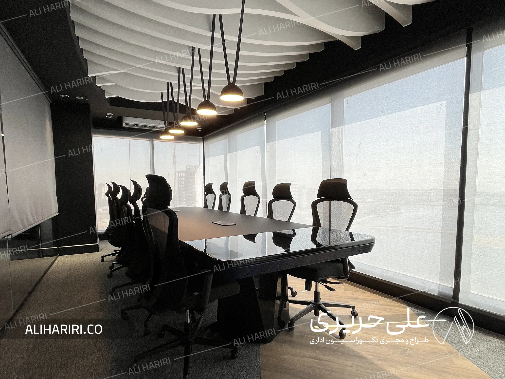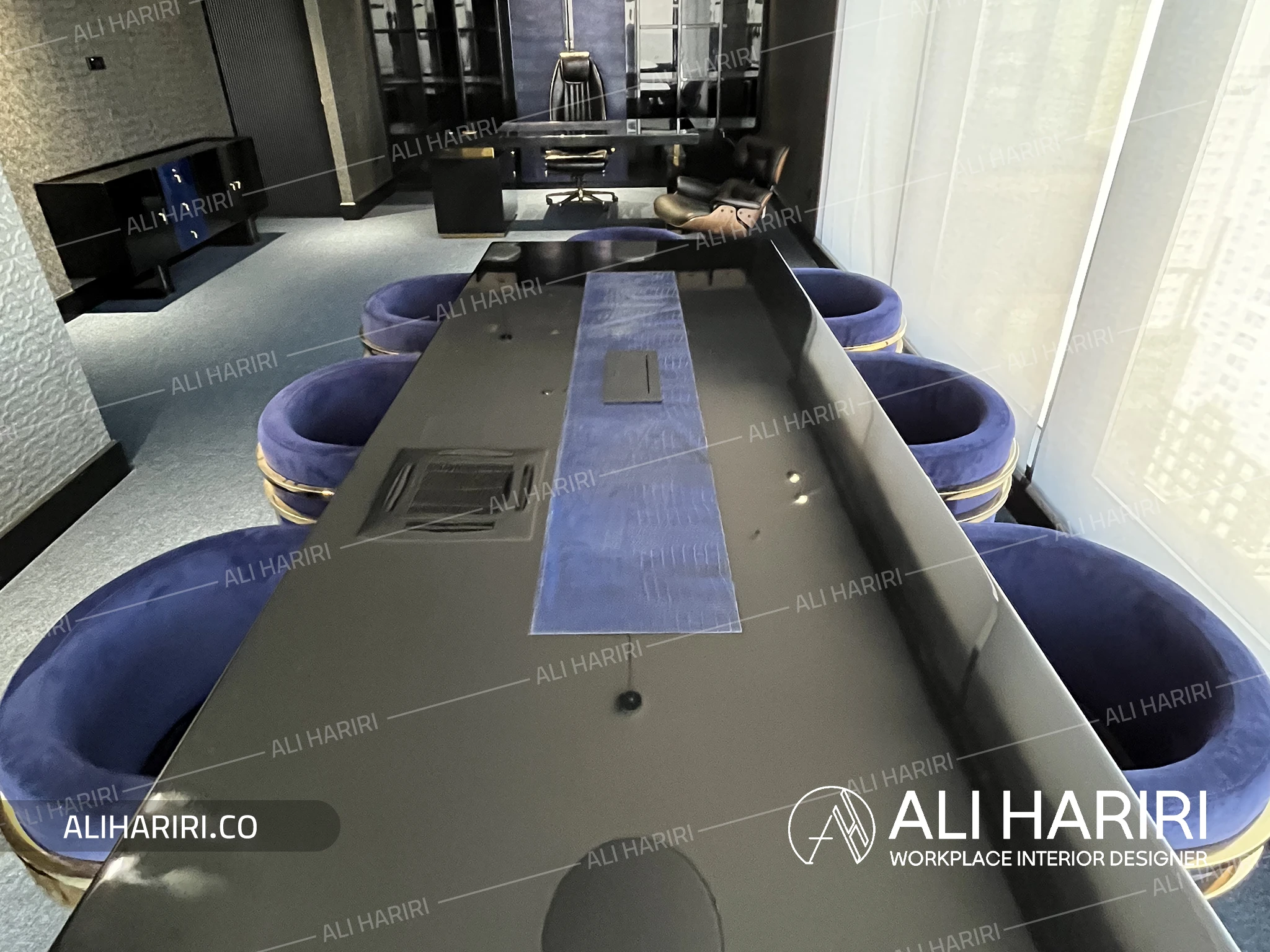 در امتداد این طراحی، میز کنفرانس با ابعاد استاندارد مدیریتی و صندلیهای ارگونومیک، تجربهای راحت و حرفهای برای استفادهکنندگان فراهم میکند.