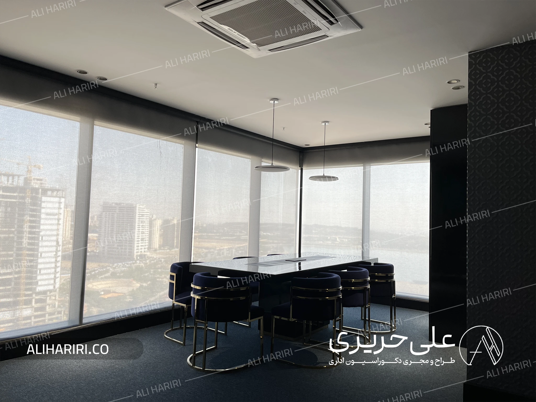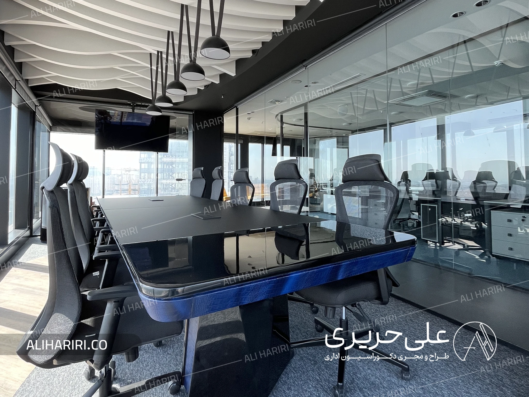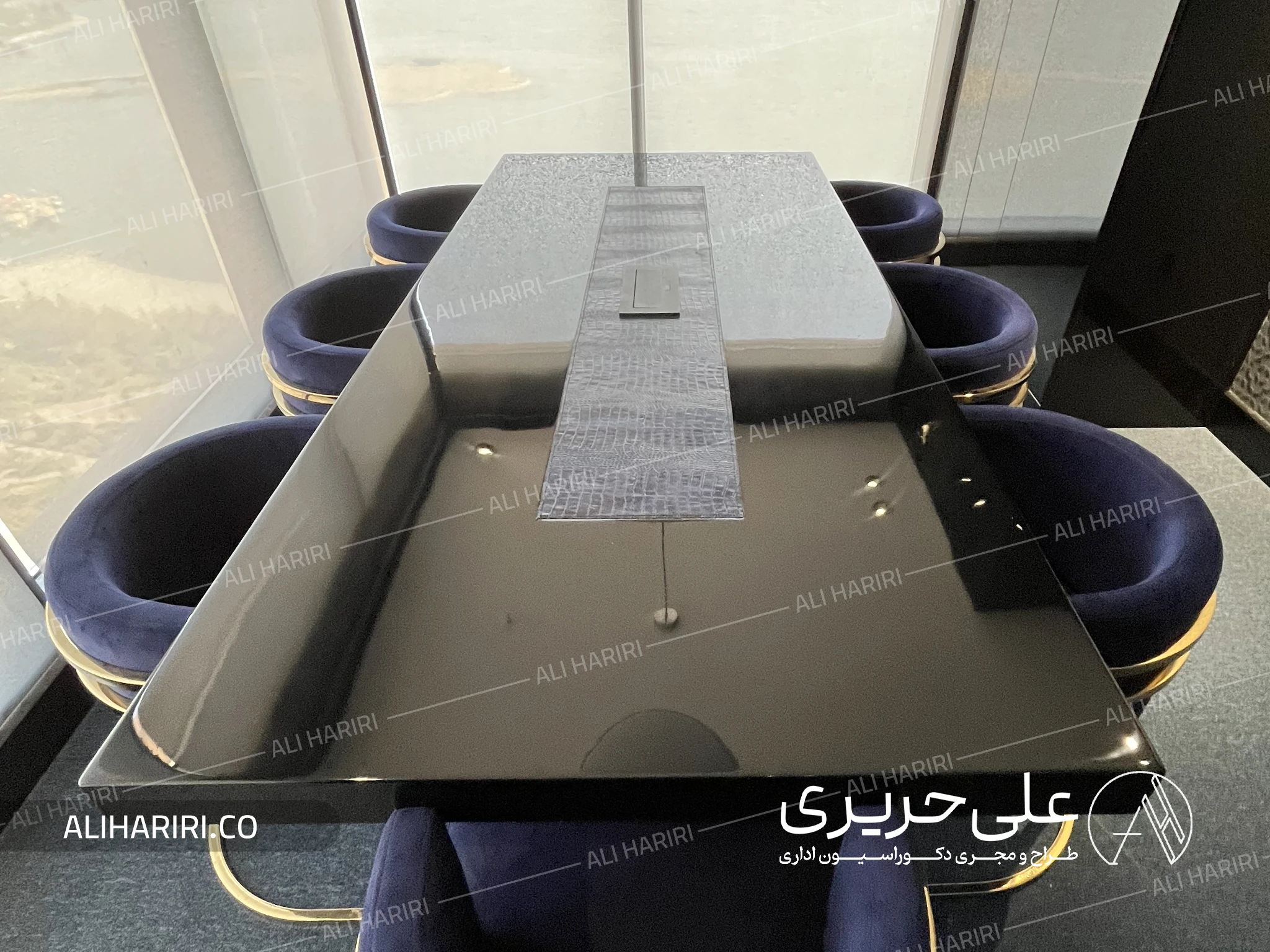در امتداد این طراحی، میز کنفرانس با ابعاد استاندارد مدیریتی و صندلیهای ارگونومیک، تجربهای راحت و حرفهای برای استفادهکنندگان فراهم میکند.