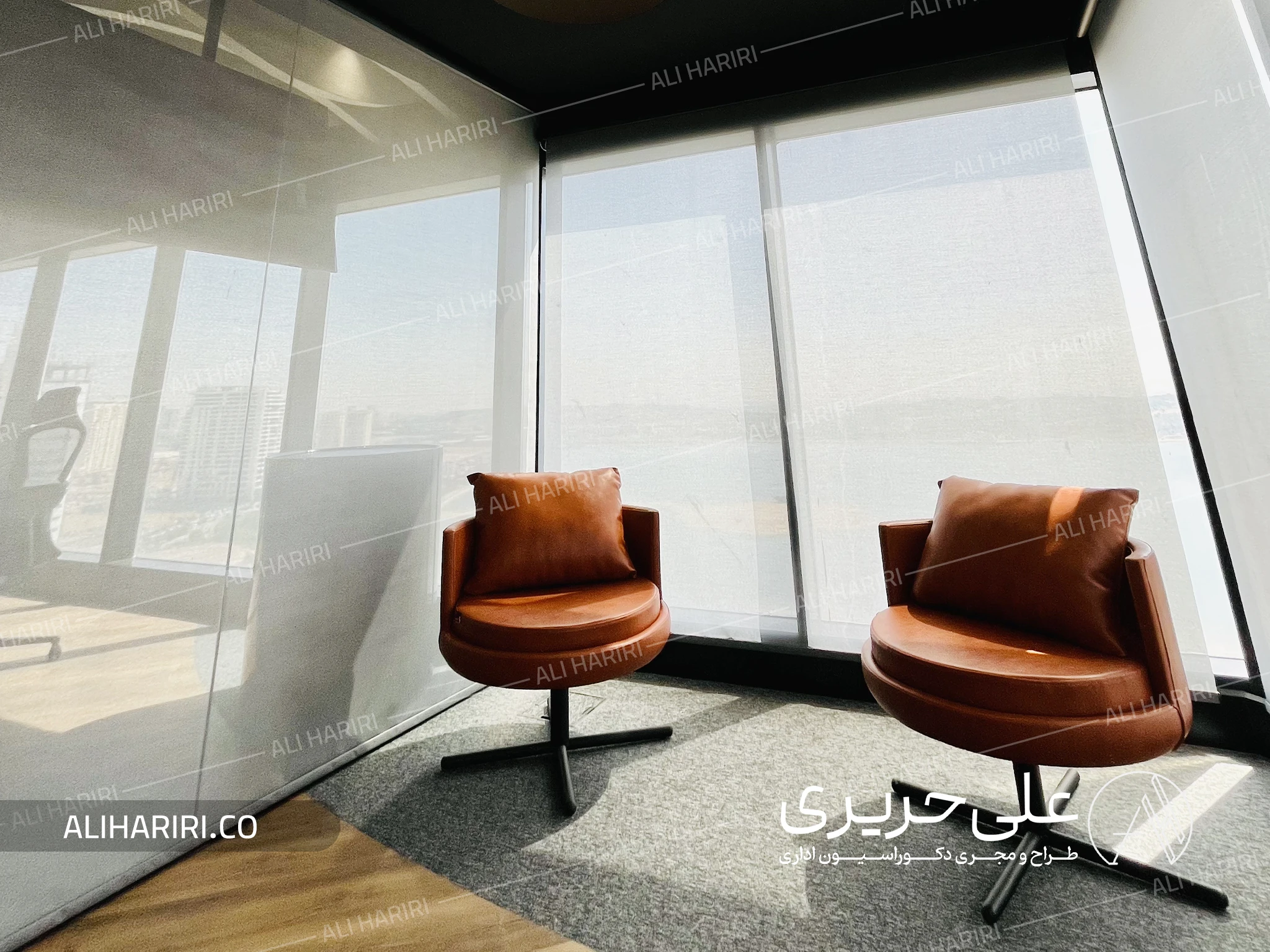 در کنار اتاق جلسات، نشیمنهای دونفره با مبلمان چرم و فرم مینیمال، فضای صمیمی اما رسمی برای گفتوگوهای کوتاه و ملاقاتها ایجاد کرده است. نور نرم این بخش، هماهنگ با طراحی کل پروژه، پیوستگی بصری مطلوبی ایجاد میکند.