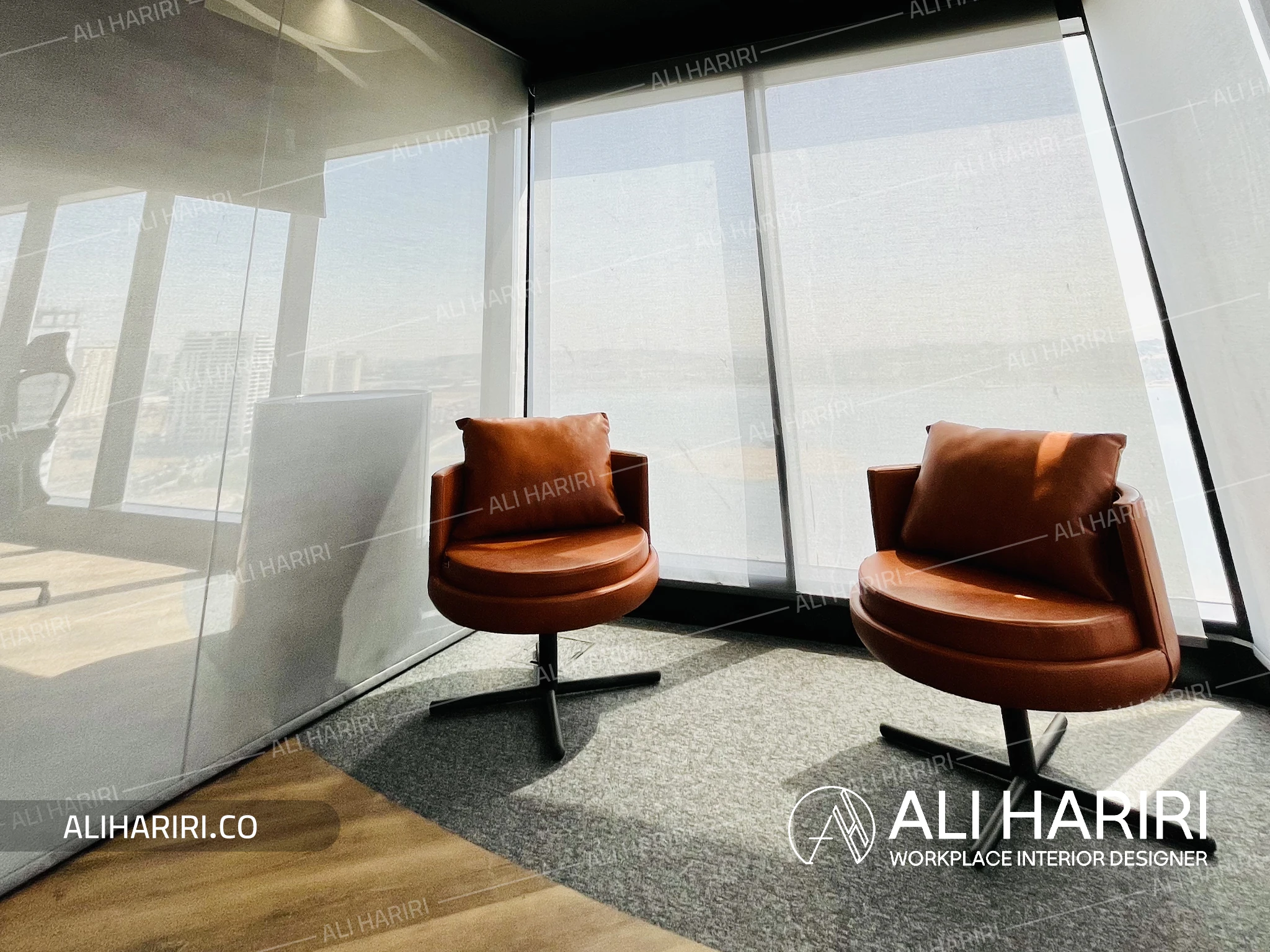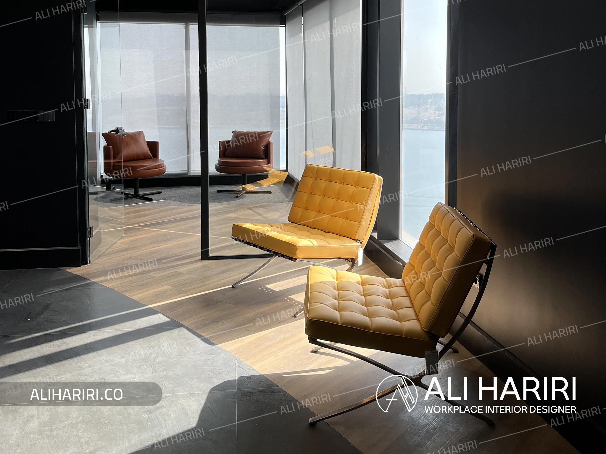 در کنار اتاق جلسات، اتاق فکر با مبلمان چرم و فرم مینیمال و در بیرون آن، فضای نشیمن دو نفره صمیمی اما رسمی برای گفتوگوهای کوتاه و ملاقاتها ایجاد کرده است. این بخش، هماهنگ با طراحی کل پروژه، پیوستگی بصری مطلوبی ایجاد میکند.