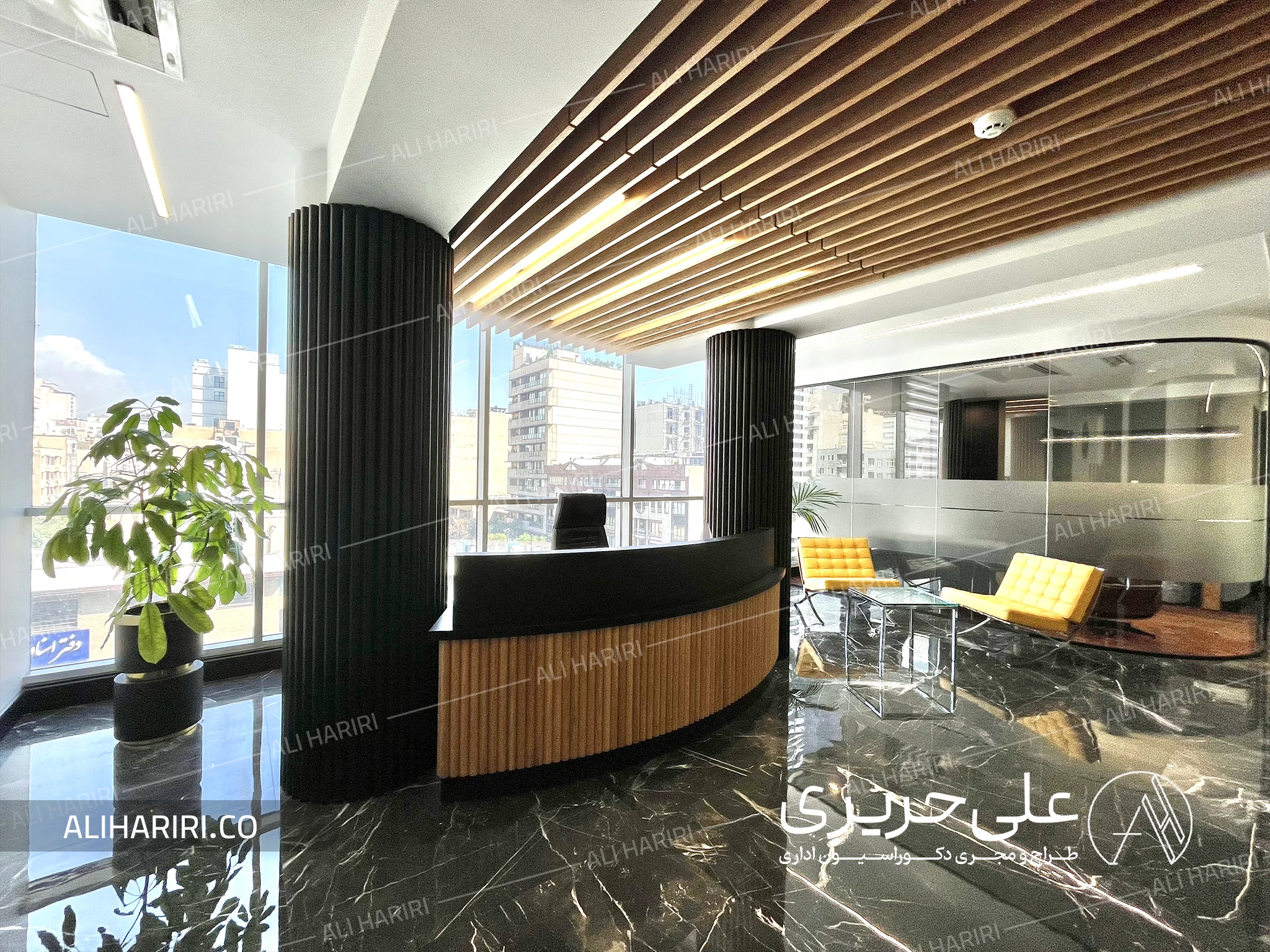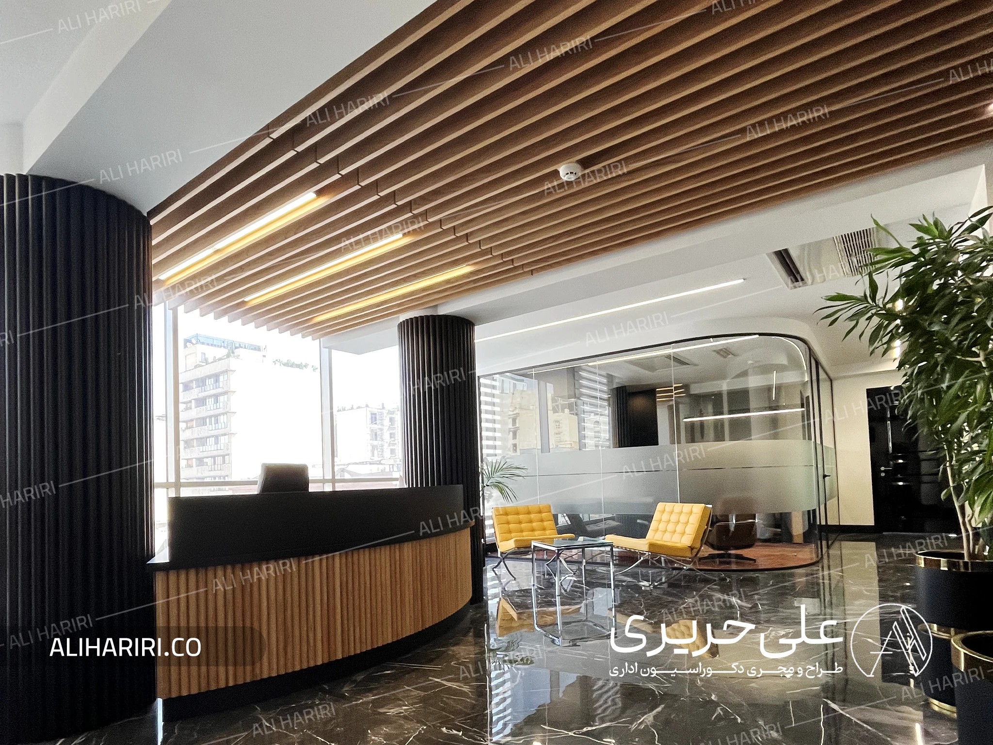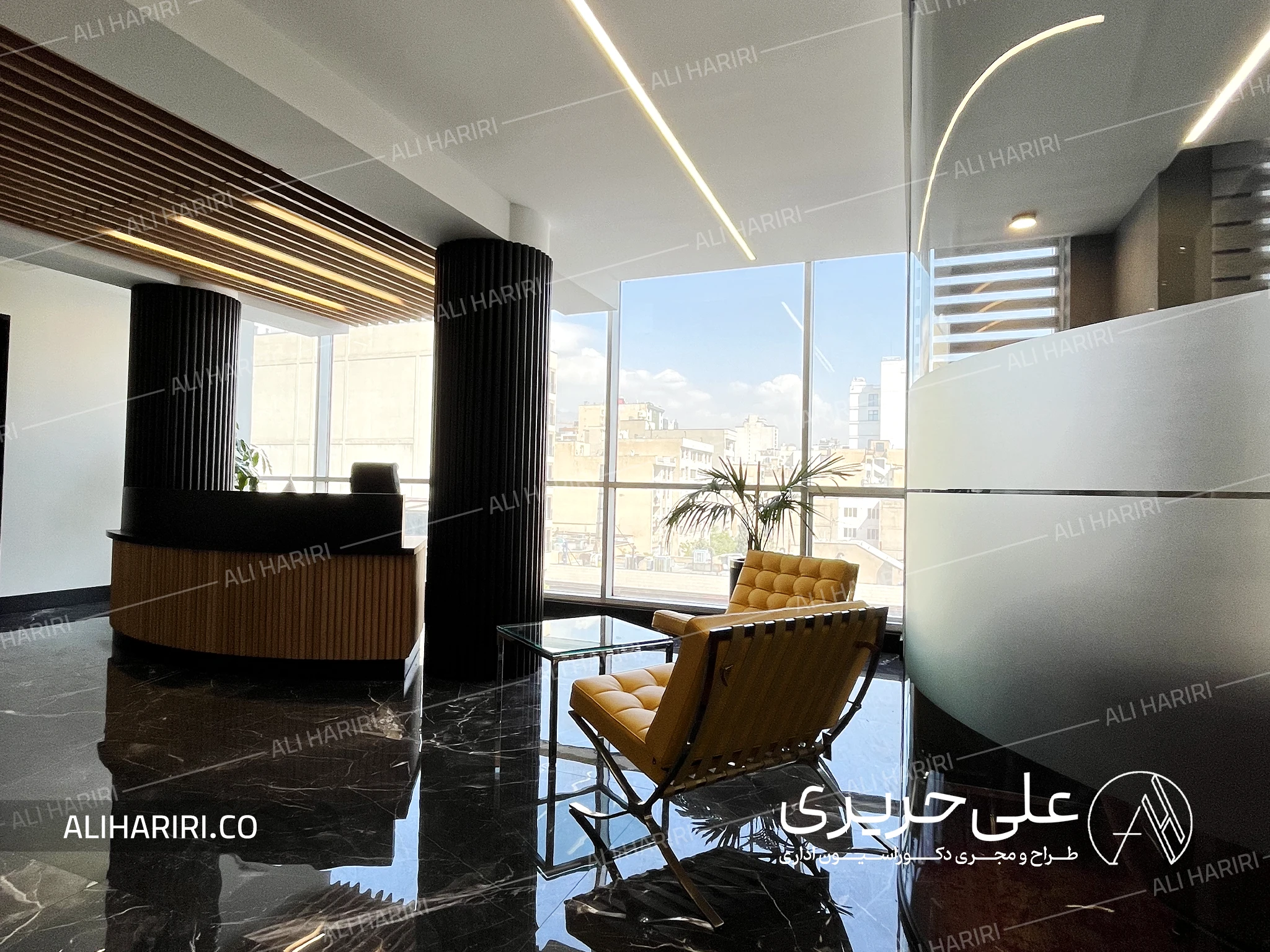 برای بخش لابی مدیریت فضایی نسبتا وسیع در نظر گرفته شد تا در بدو ورود مقیاس مناسبی از توانایی شرکت را به مخاطب القاء نماید و ترکیب سنگ تیره با رگههای ظریف، ستونهای عمودی با ریتم منظم، و کانتر پذیرش منحنی، سه عنصر اصلی هویت فضایی این بخش می باشند. سنگ کف با انعکاس نور طبیعی، عمق و بُعدی لوکس ایجاد میکند و خطوط چوبی سقف، گرما و تعادل را به این ترکیب میافزاید. حضور این دو متریال در کنار هم، فضایی خلق کرده که هم رسمی و مدیریتی است و هم حس آرامش و ثبات را به محیط کار منتقل میکند.
