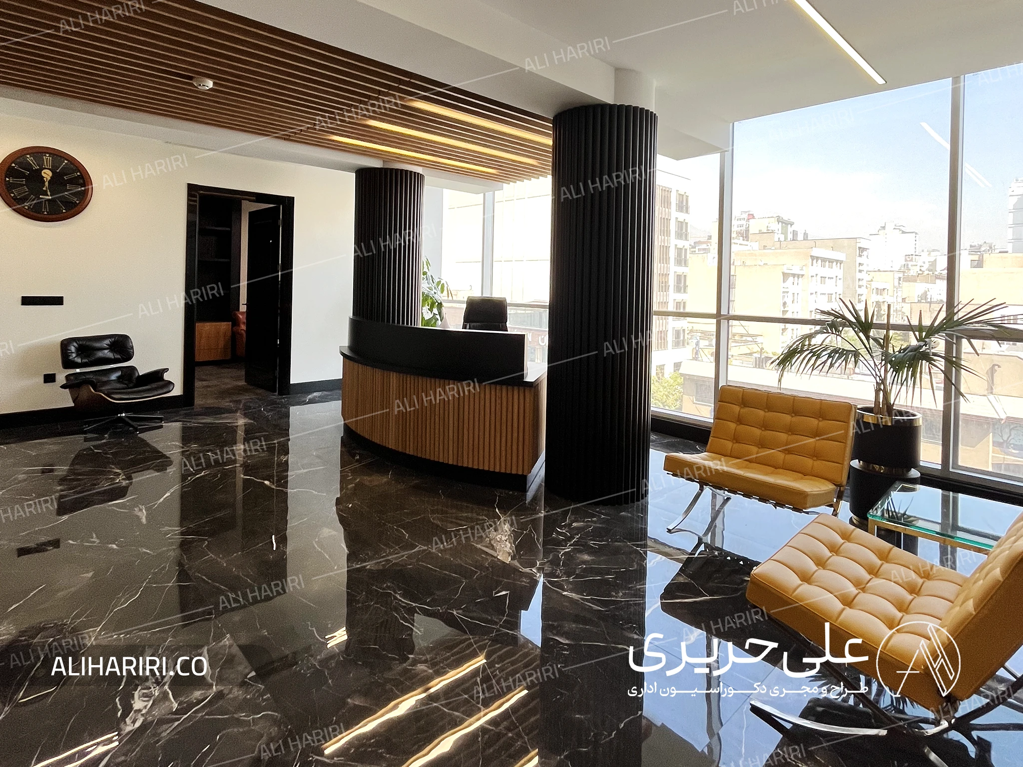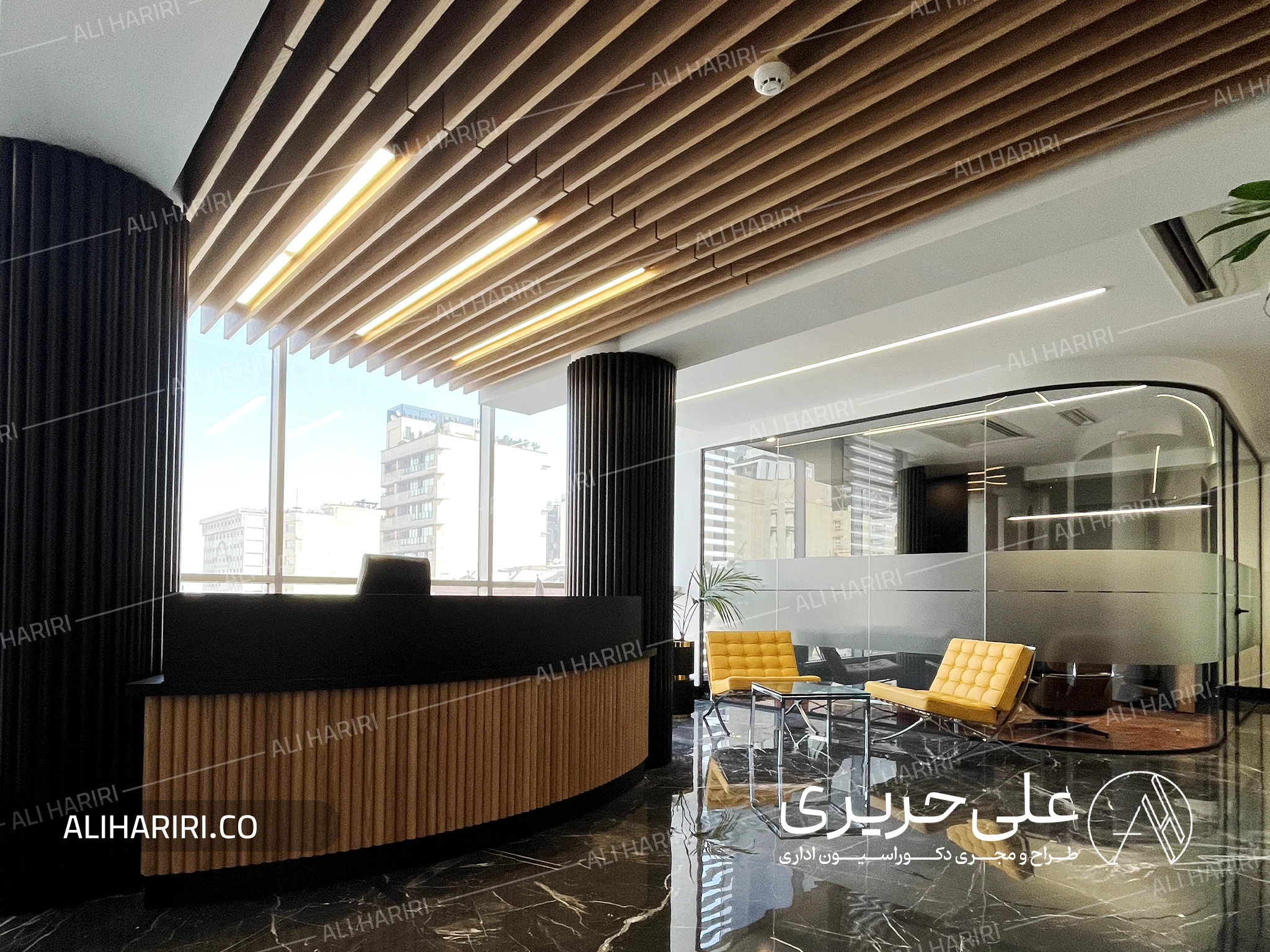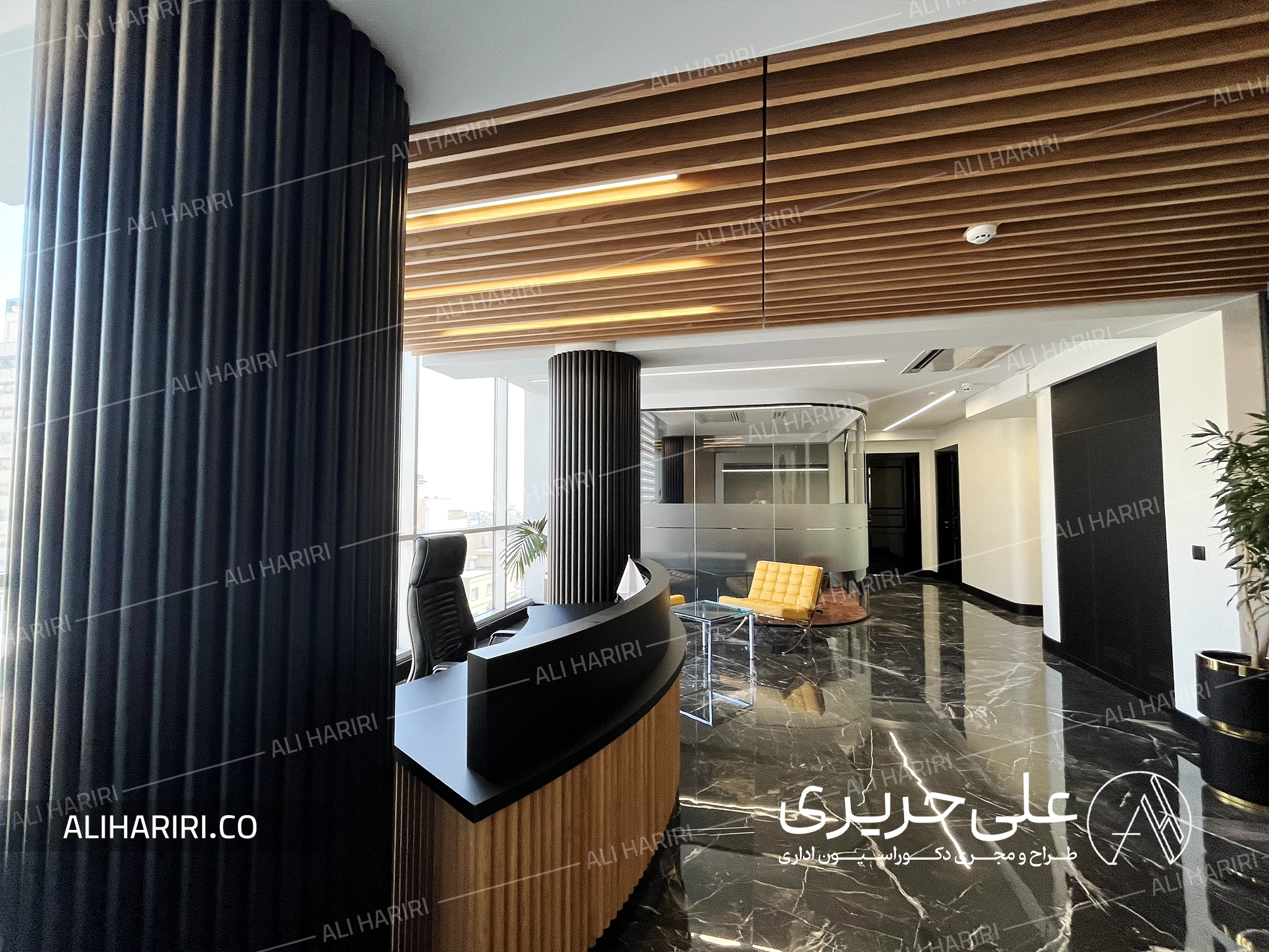 برای بخش لابی مدیریت فضایی نسبتا وسیع در نظر گرفته شد تا در بدو ورود مقیاس مناسبی از توانایی شرکت را به مخاطب القاء نماید و ترکیب سنگ تیره با رگههای ظریف، ستونهای عمودی با ریتم منظم، و کانتر پذیرش منحنی، سه عنصر اصلی هویت فضایی این بخش می باشند. سنگ کف با انعکاس نور طبیعی، عمق و بُعدی لوکس ایجاد میکند و خطوط چوبی سقف، گرما و تعادل را به این ترکیب میافزاید. حضور این دو متریال در کنار هم، فضایی خلق کرده که هم رسمی و مدیریتی است و هم حس آرامش و ثبات را به محیط کار منتقل میکند.