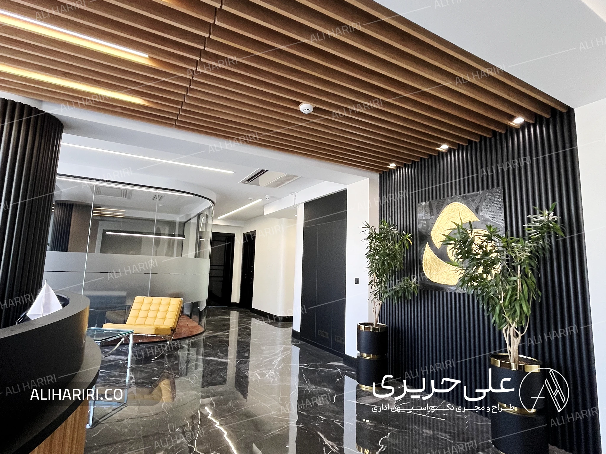 طراحی داخلی شرکت کاویان گهر سیرجان با هدف خلق فضایی لوکس، مدرن و در عین حال کاربردی شکل گرفت؛ فضایی که علاوه بر نمایش هویت جدی و حرفهای مجموعه، احساس اعتماد و ثبات را به مخاطب منتقل کند. از همان ابتدا تصمیم گرفتیم با بهکارگیری متریالهای اصیل و تضادهای قدرتمند رنگی، شخصیت بصریای بسازیم که ماندگار و شاخص باشد.