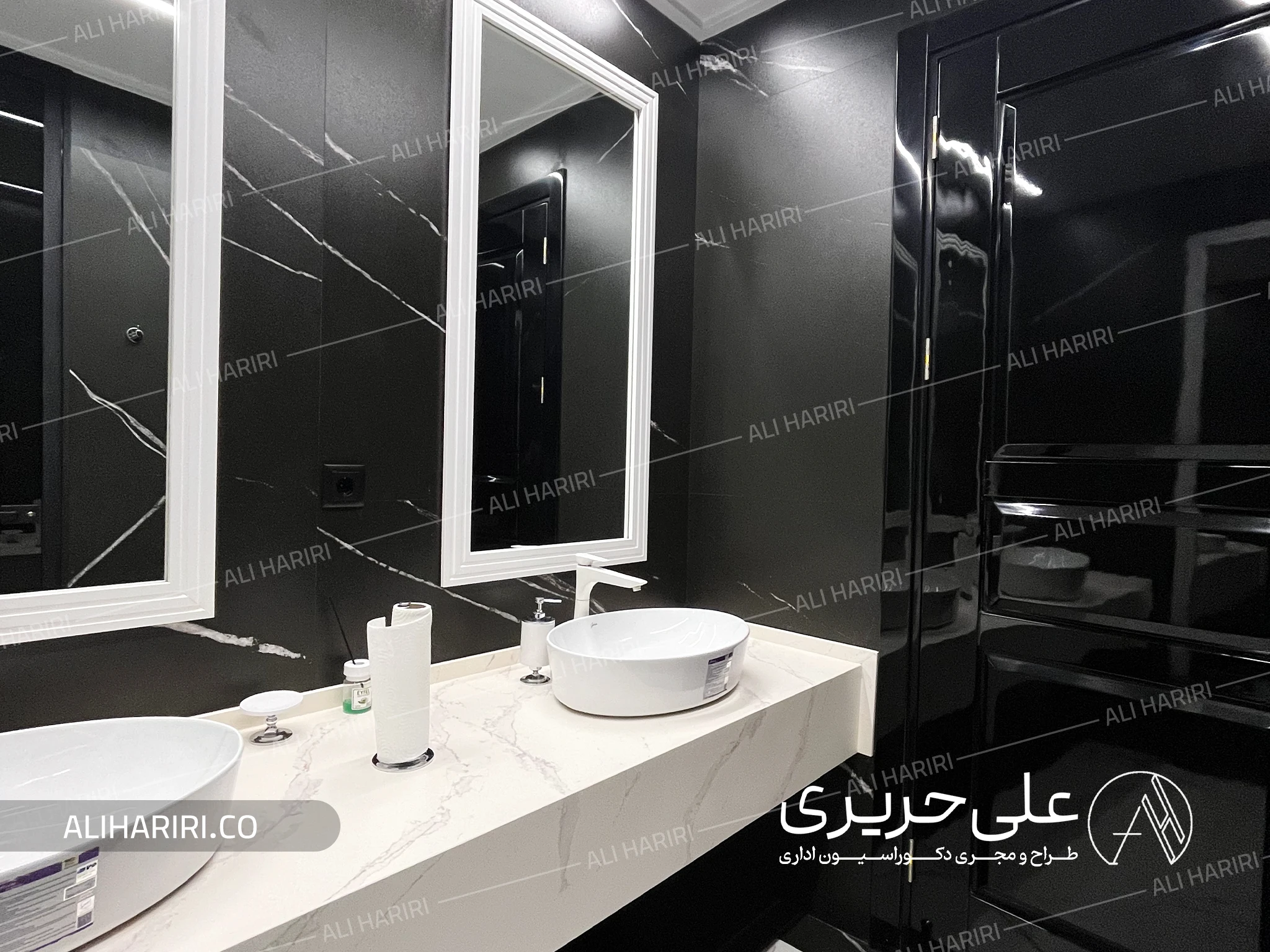 در جزئیات نهایی مانند سرویسها نیز از ترکیب سنگ روشن و مشکی با خطوط تمیز و ساده استفاده شد تا زبان طراحی یکپارچه در تمام بخشهای پروژه دیده شود.